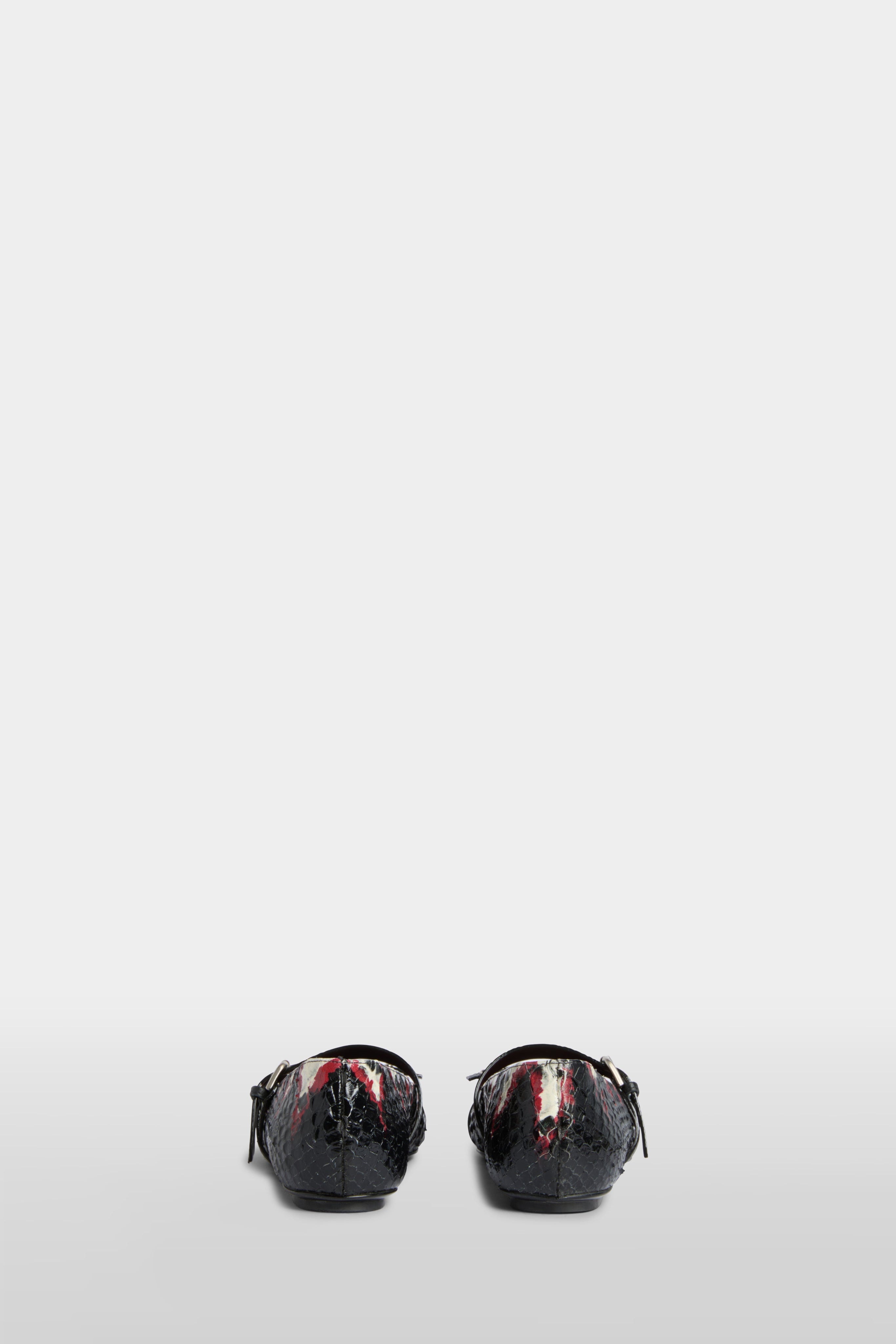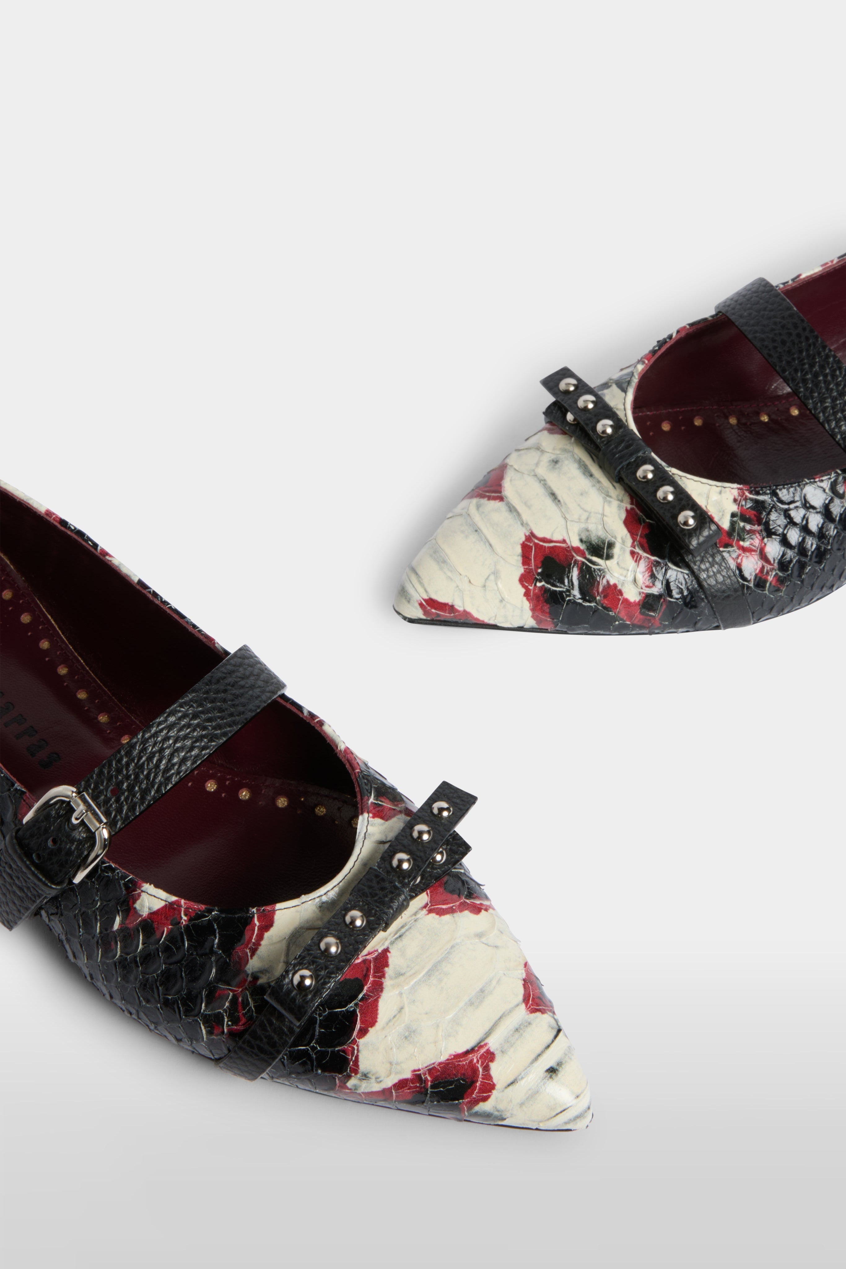 Pointed-toe ballerina shoes in python-effect leather, with a black, ivory, and bordeaux pattern. Two textured-leather straps, one studded and one with an adjustable buckle, secure the foot and add attitude. Finished with a leather lining and flat sole, they deliver day-to-night comfort with a sharp, modern edge.