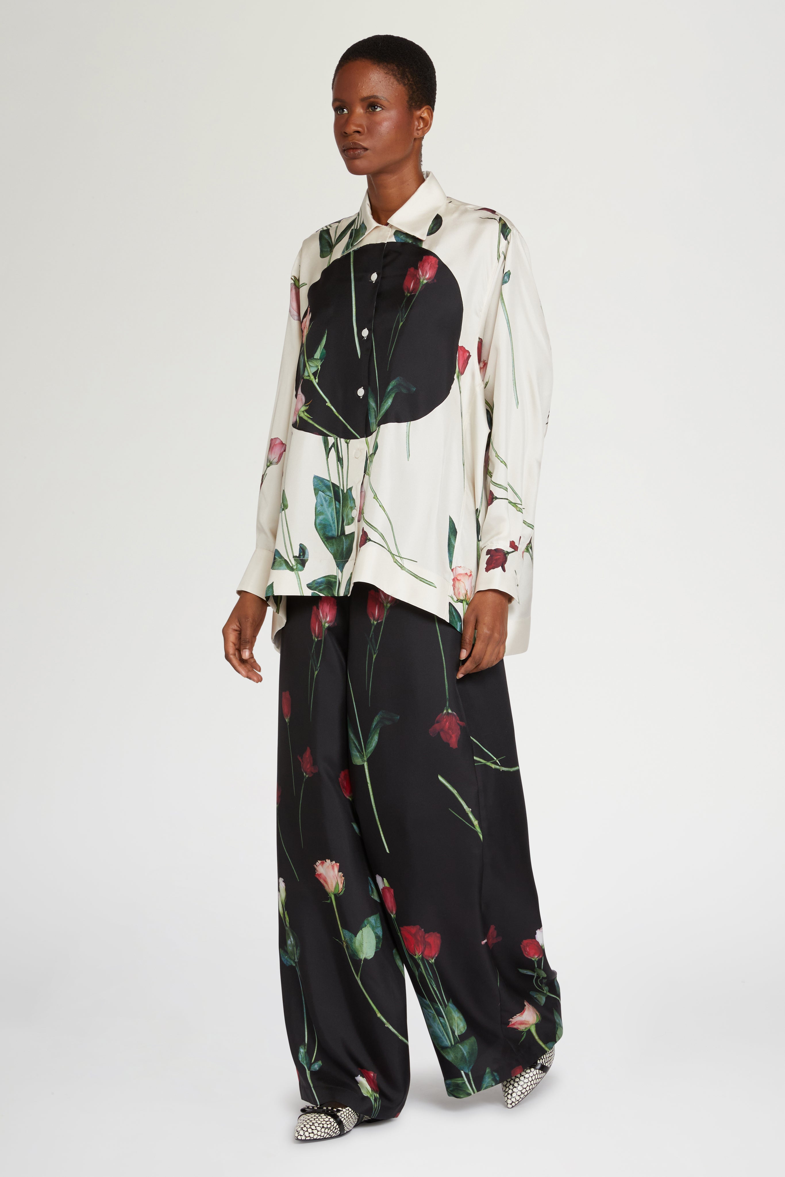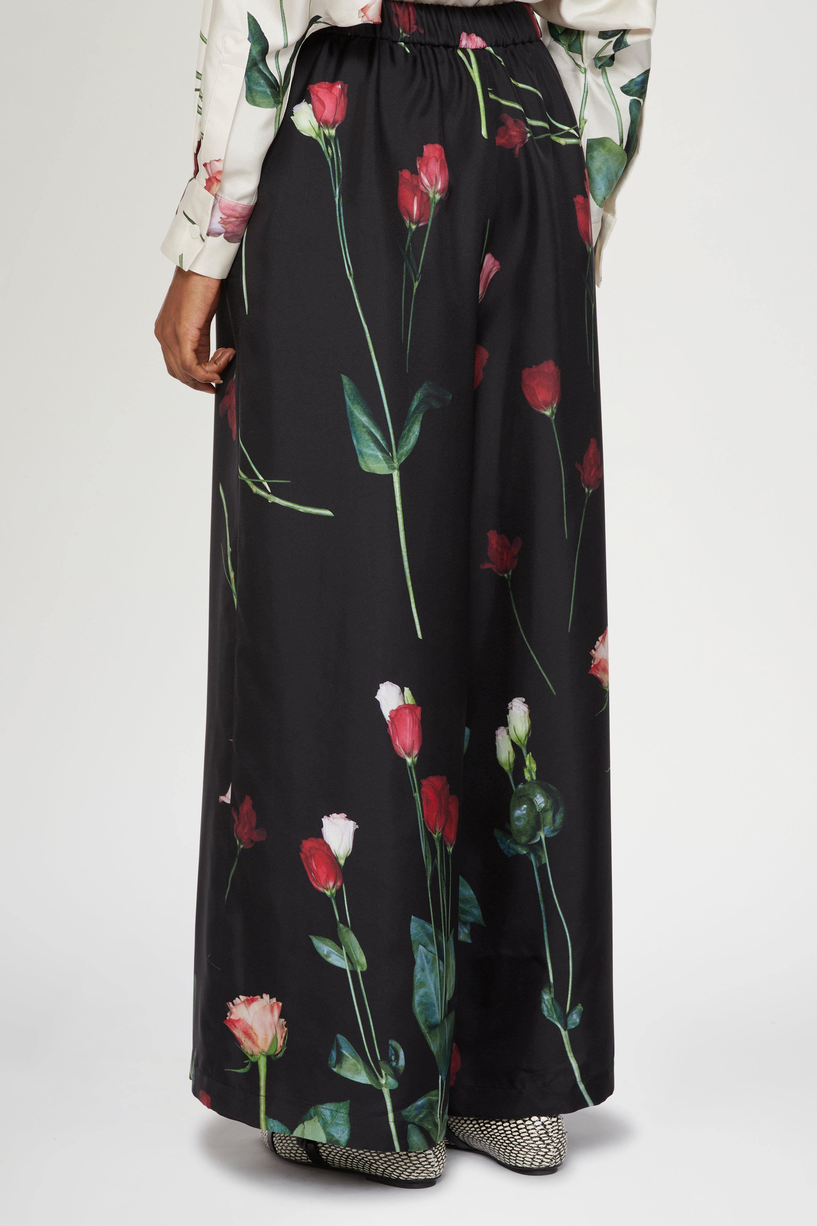 Wide-leg trousers in 100% silk with floral print on black background. The fluid silhouette and relaxed cut ensure both comfort and elegance.