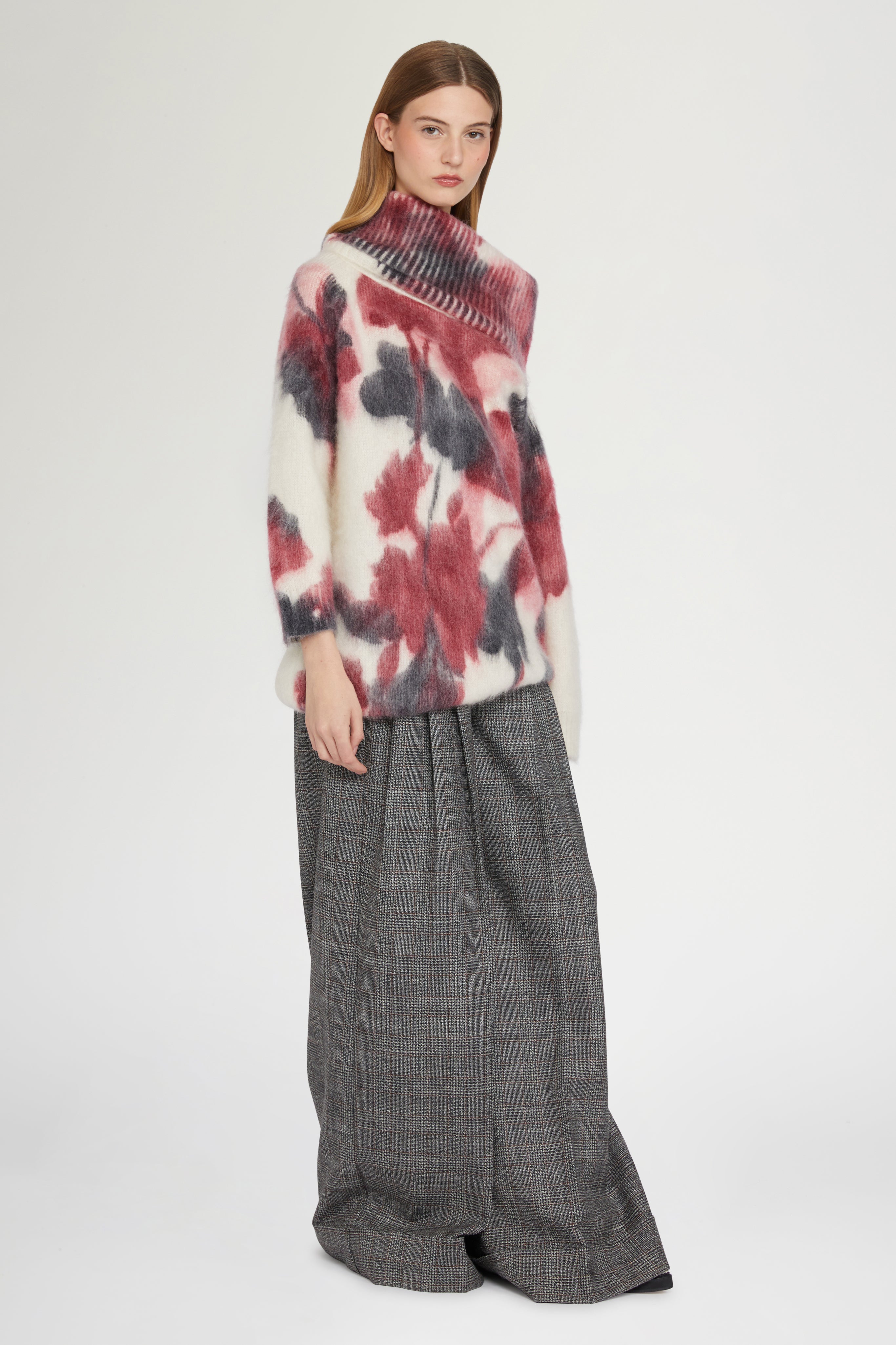 • Soft mohair-blend sweater with an oversized fit. Features an asymmetric boat neckline and floral-inspired blurred pattern in bordeaux, grey, and ivory. Warm and lightweight, perfect for a statement winter look.