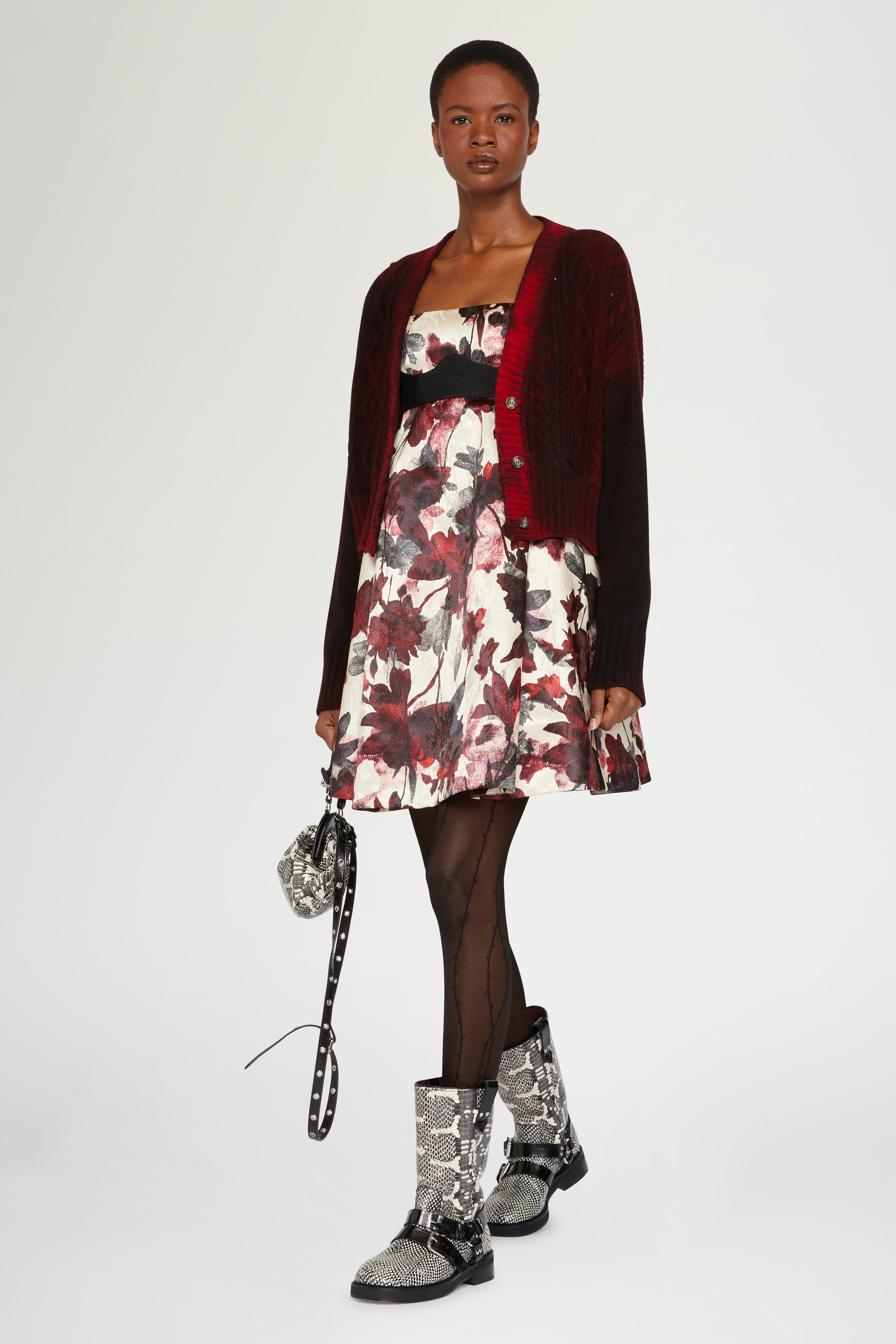 Cropped cashmere and wool-blend cardigan in deep red and black gradient, featuring cable-knit detailing and ribbed trims. Front button closure with a relaxed fit for a refined yet contemporary look.
