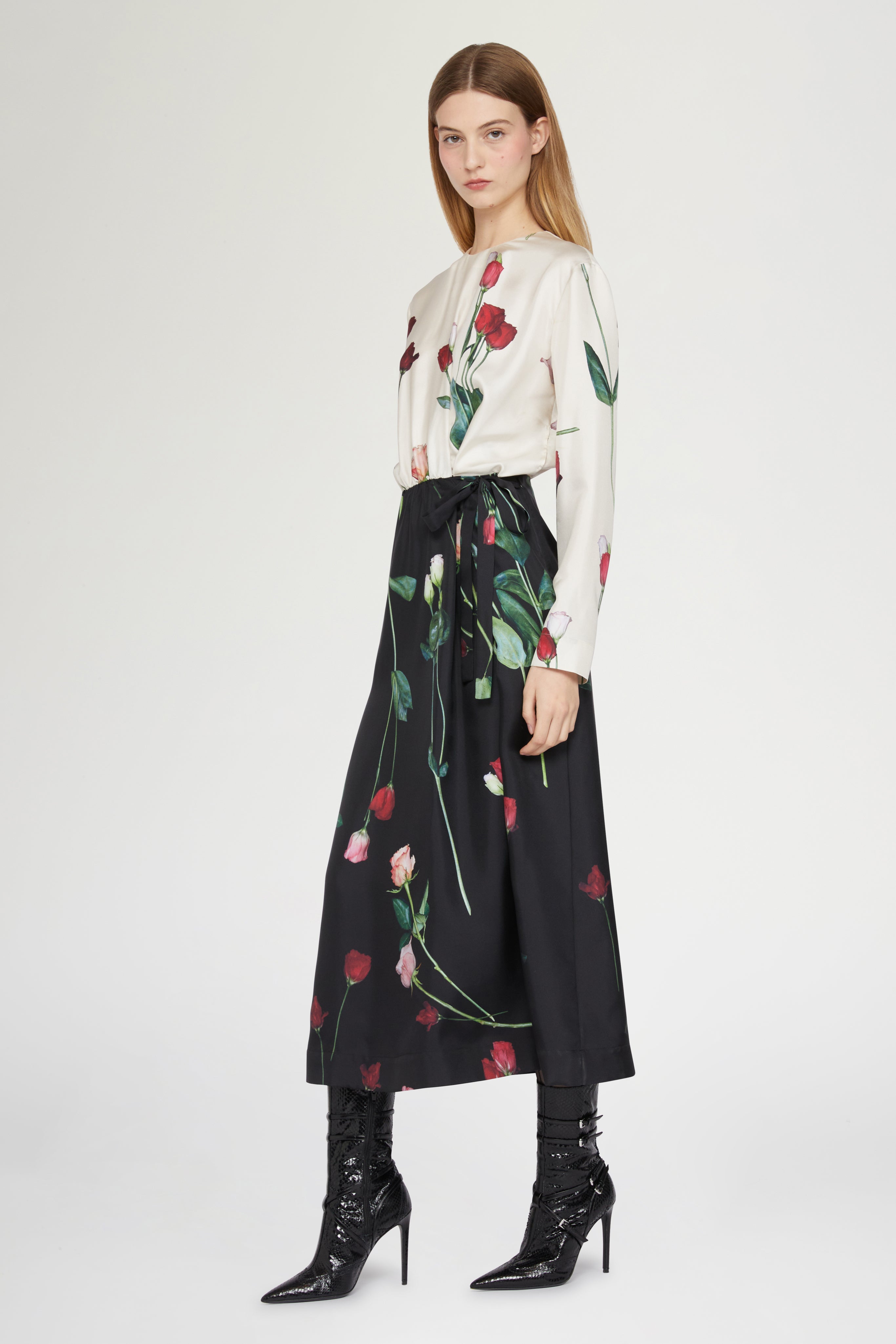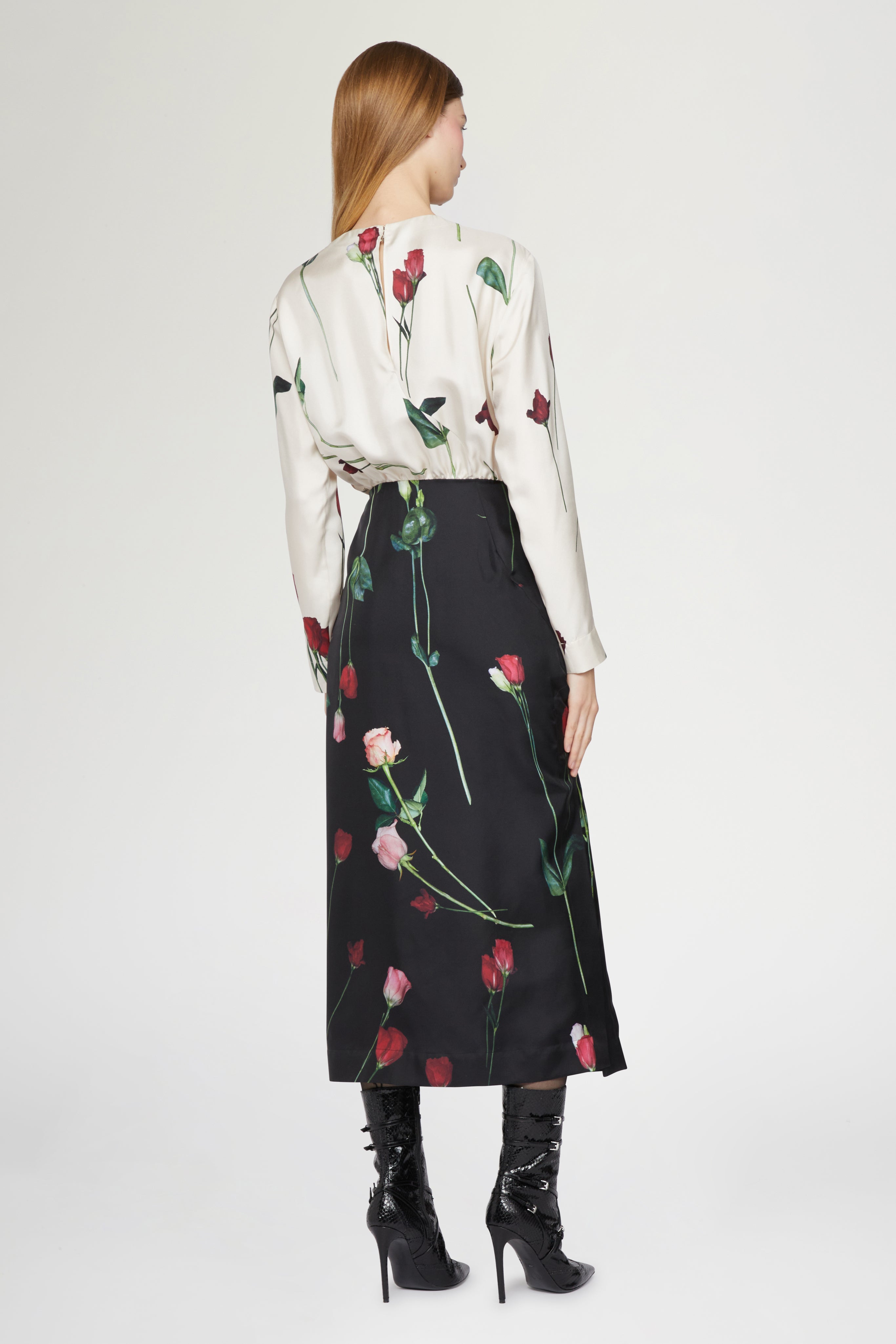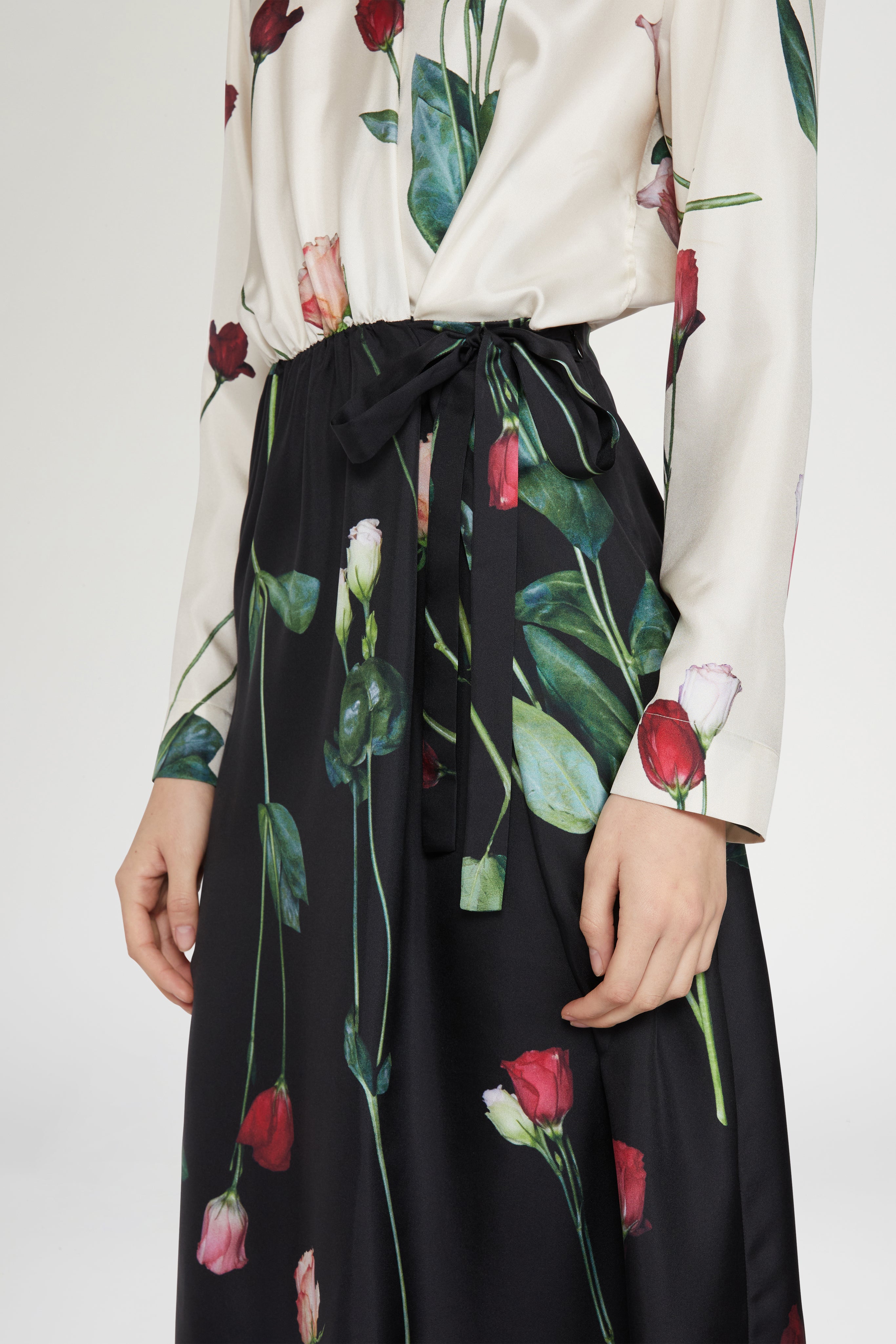 Draped midi dress in 100% silk, featuring a floral print on a contrasting background. The fluid silhouette with gathered waist and tie belt enhances elegance and femininity. A refined piece, perfect for special occasions.