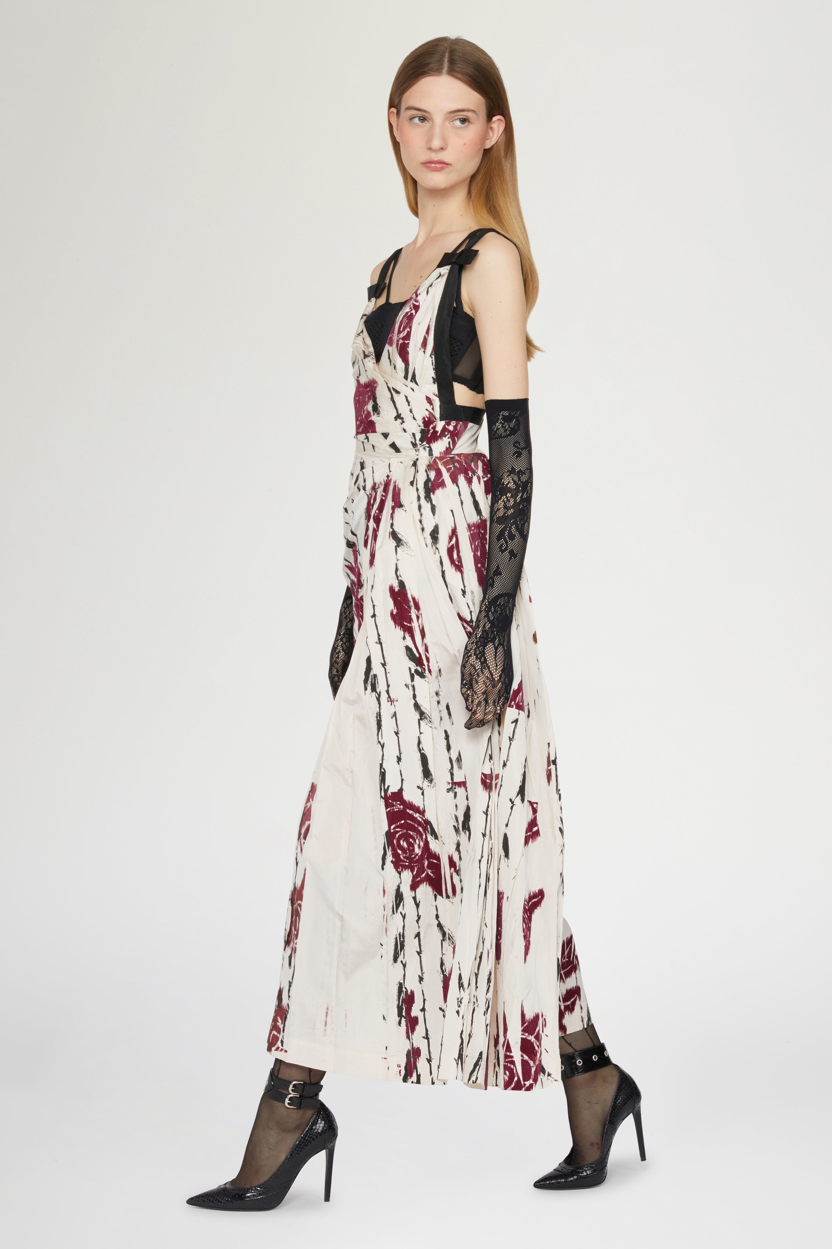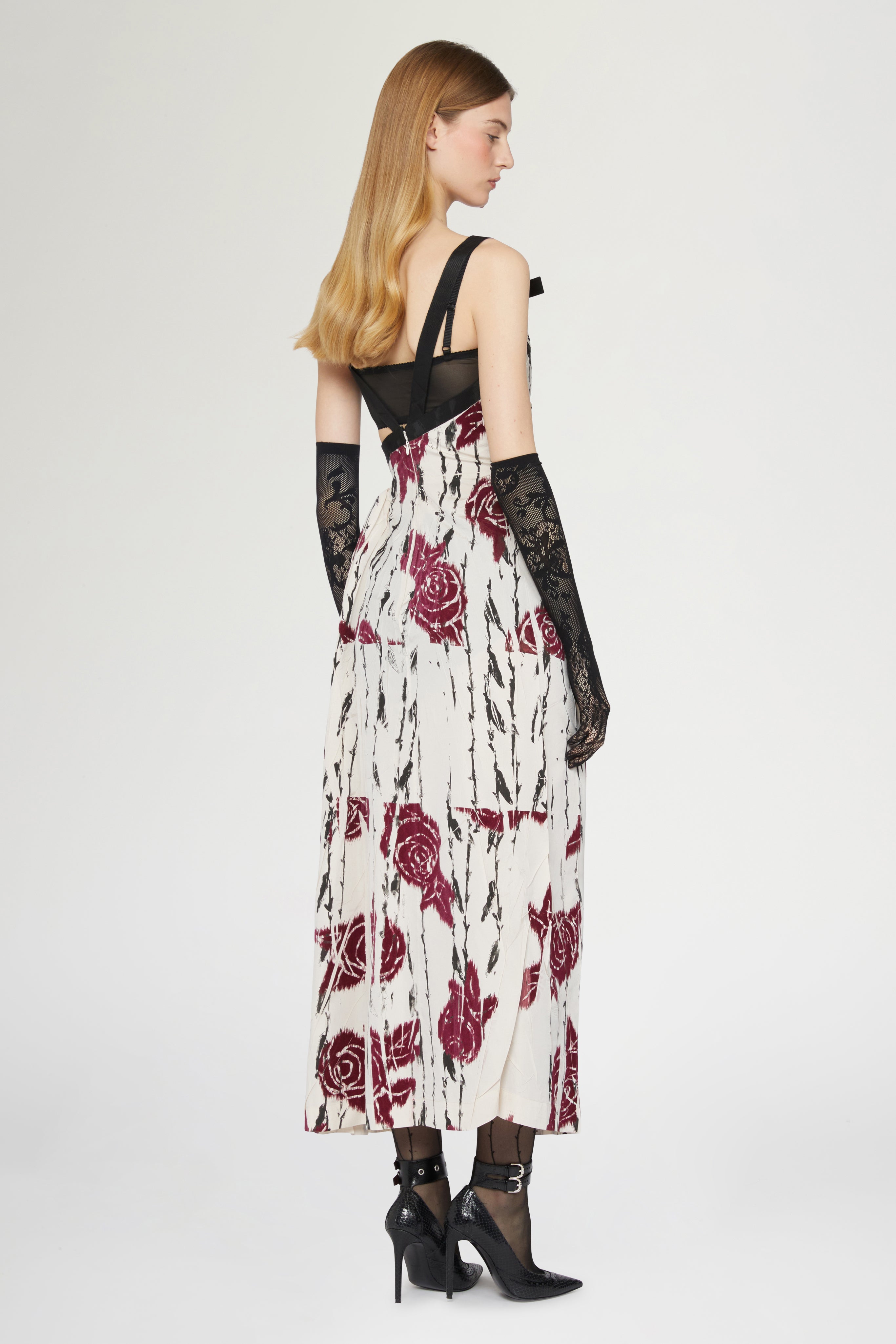 Sleeveless midi dress crafted from lightweight silk-blended fabric with an ivory base and bold rose floral print. Designed with draped pleats, crossover bodice, and contrasting black ribbon straps for a romantic yet contemporary look. A statement piece that blends elegance with artistic flair.