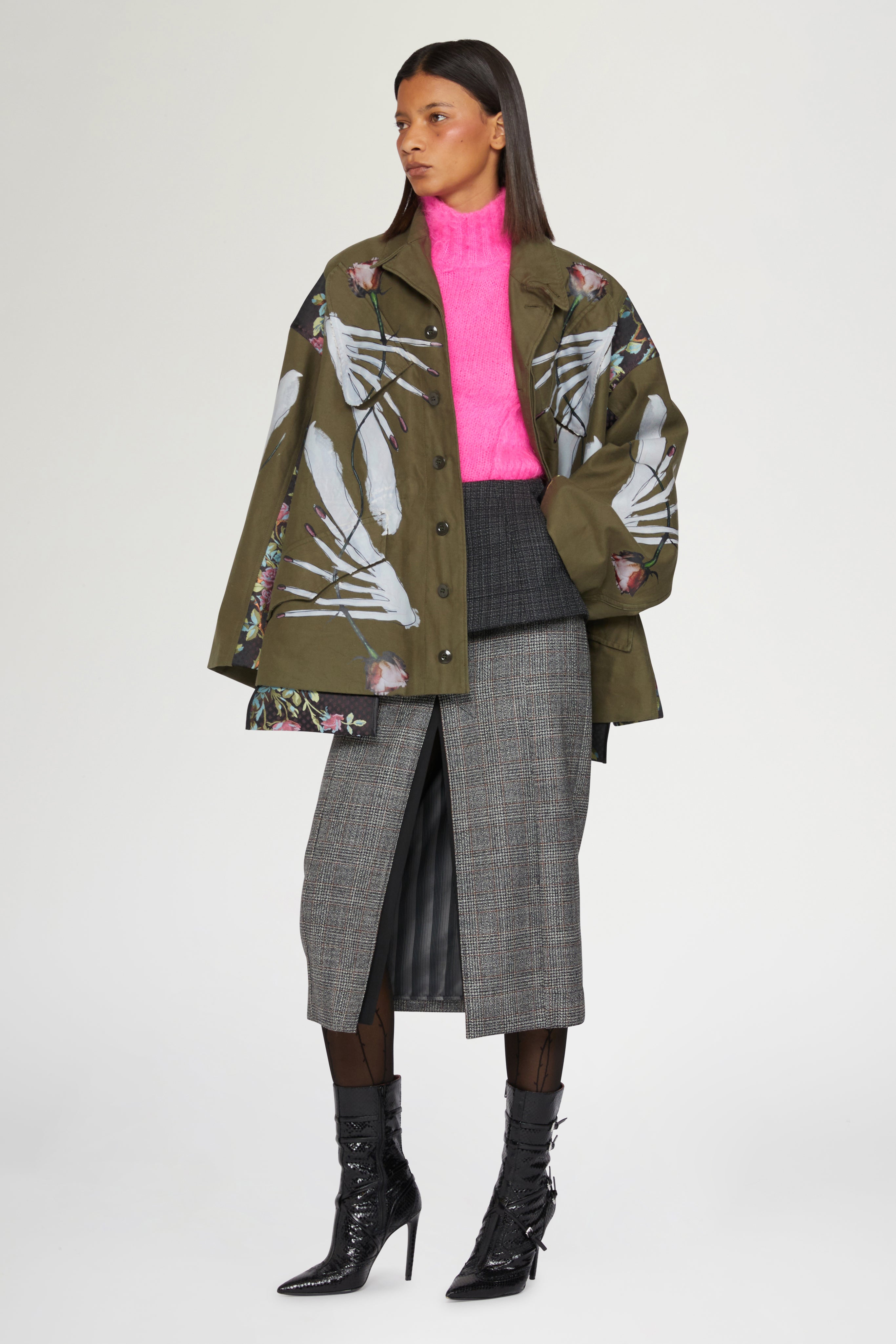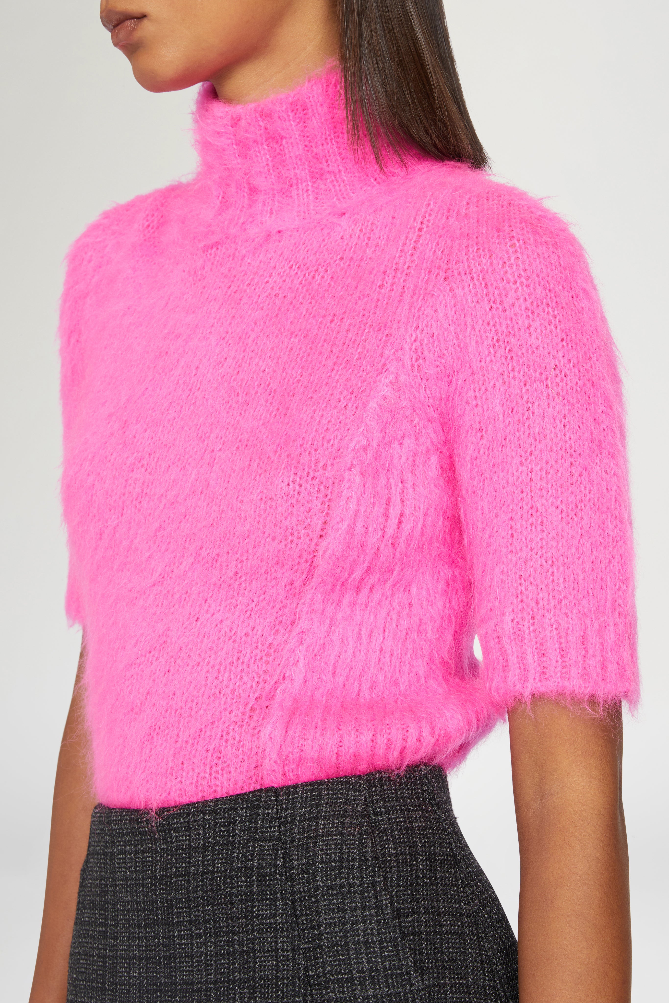 • High-neck sweater in bright pink mohair blend with a fluffy, soft-touch texture. Designed with short sleeves and a slim, feminine silhouette.