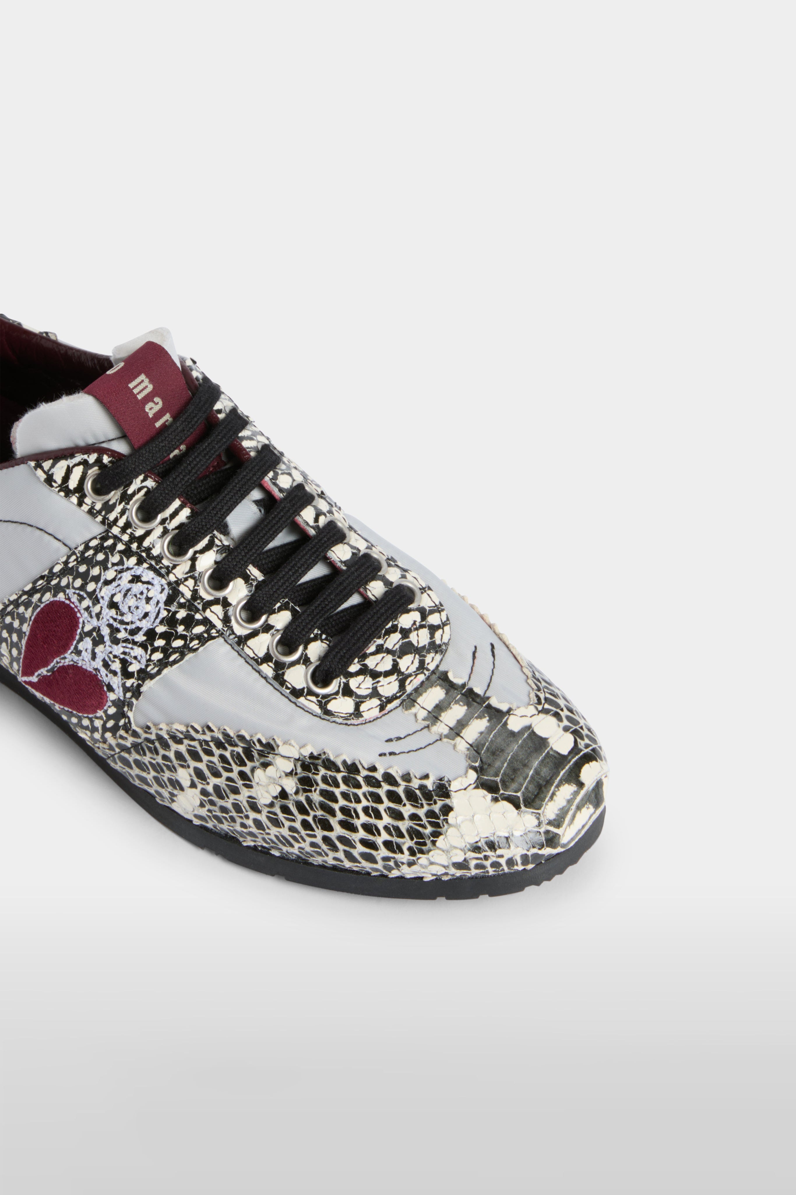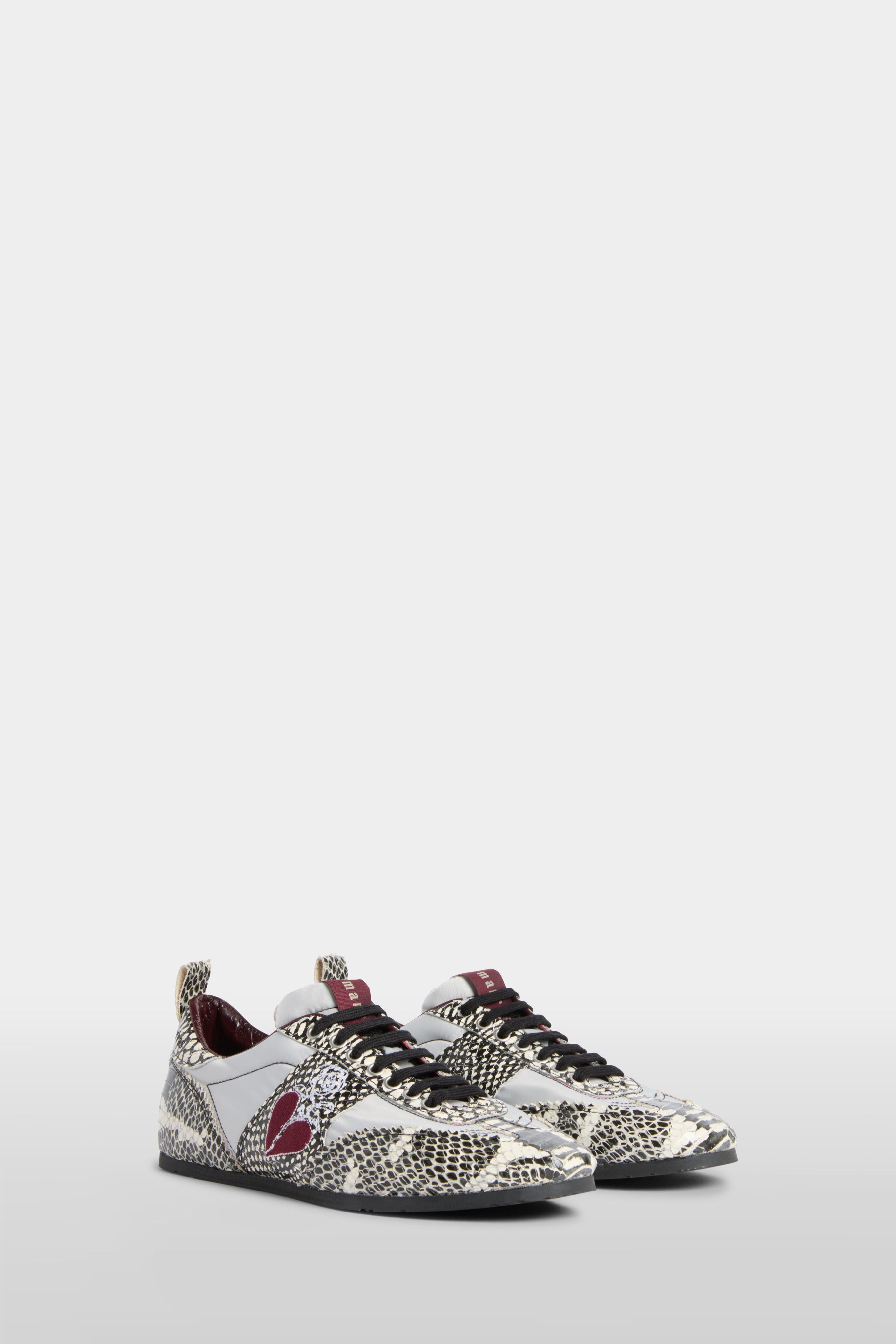• Unisex sneakers in python-effect leather and nylon, featuring an embroidered heart motif. Designed with a retro silhouette, they are lined in soft goat leather and equipped with a removable insole and a durable thermoplastic sole.