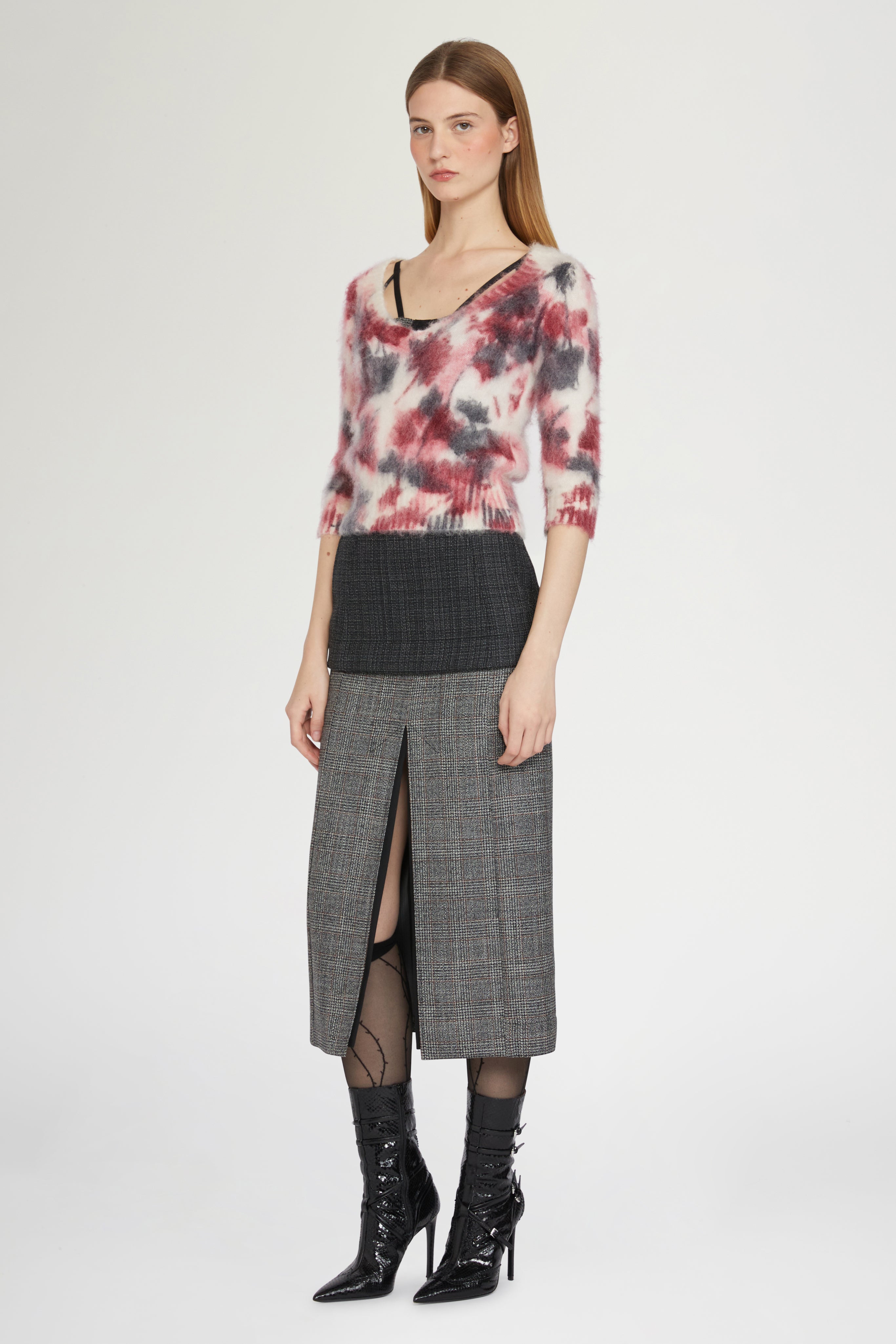 Soft V-neck sweater in ivory and bordeaux mohair blend, featuring a fluffy texture and ribbed details. Designed with elbow-length sleeves and a slightly fitted waist for a feminine silhouette.