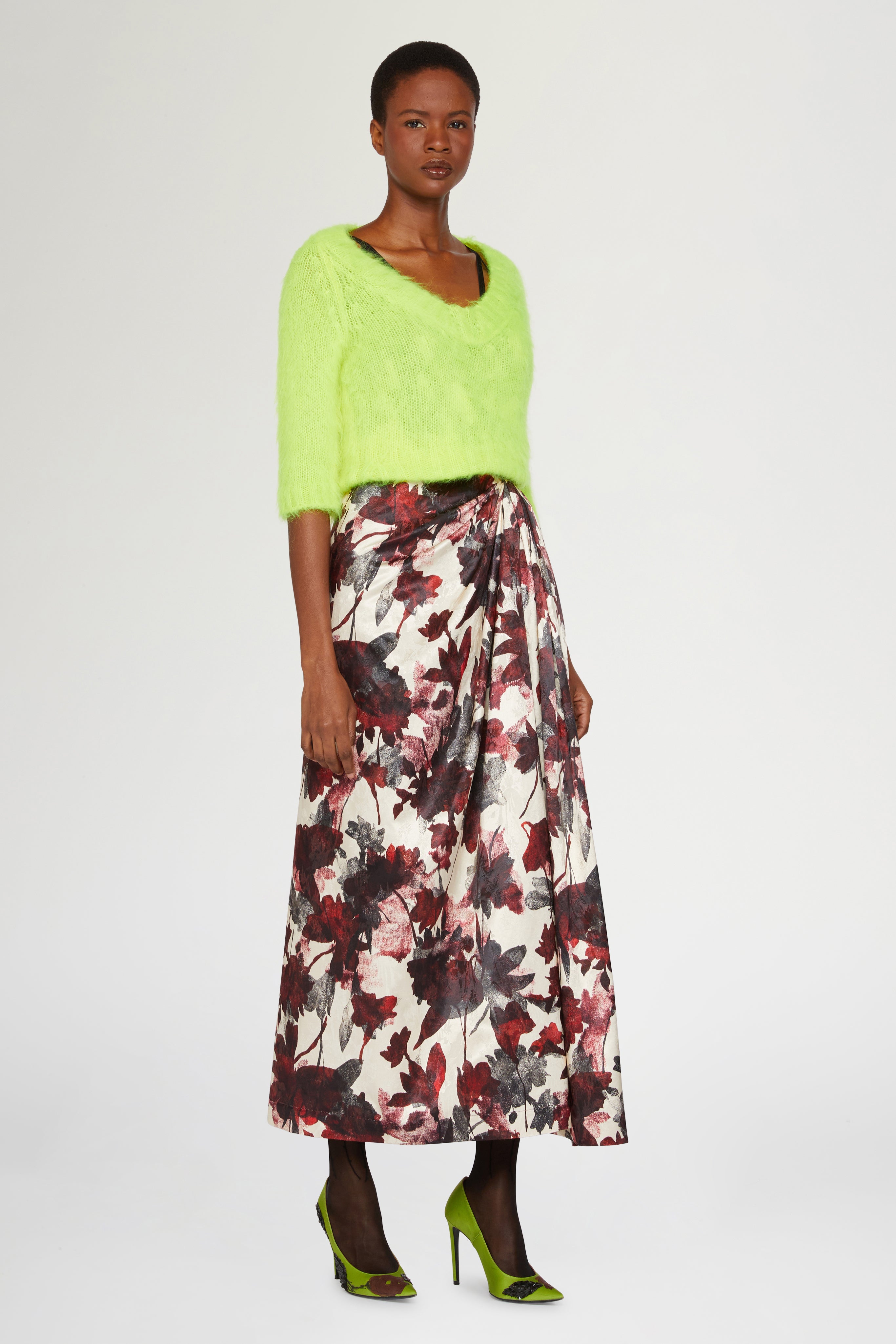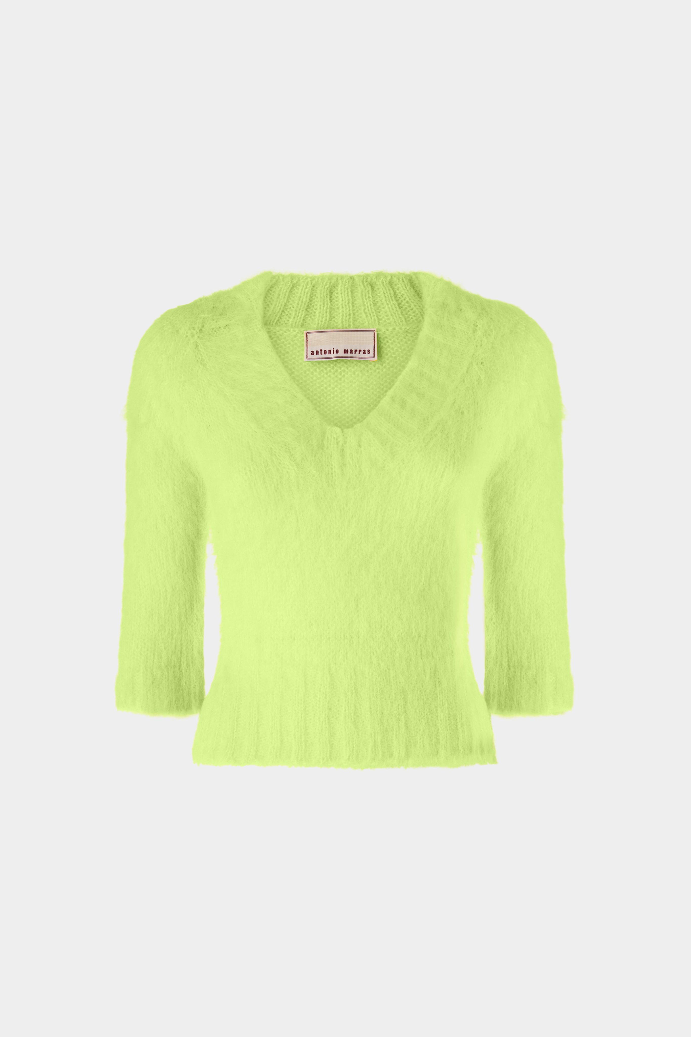 Soft V-neck sweater in neon yellow mohair blend, featuring a fluffy texture and ribbed details. Designed with elbow-length sleeves and a slightly fitted waist for a feminine silhouette.