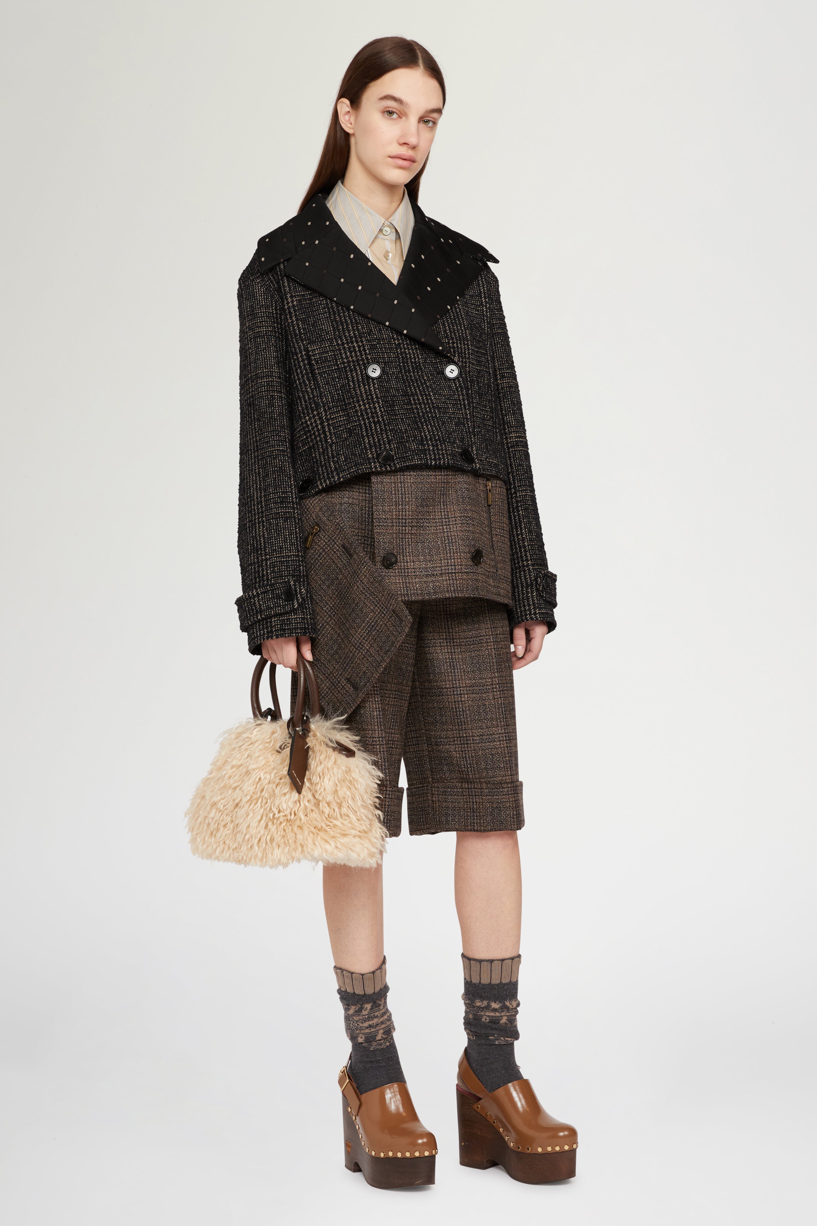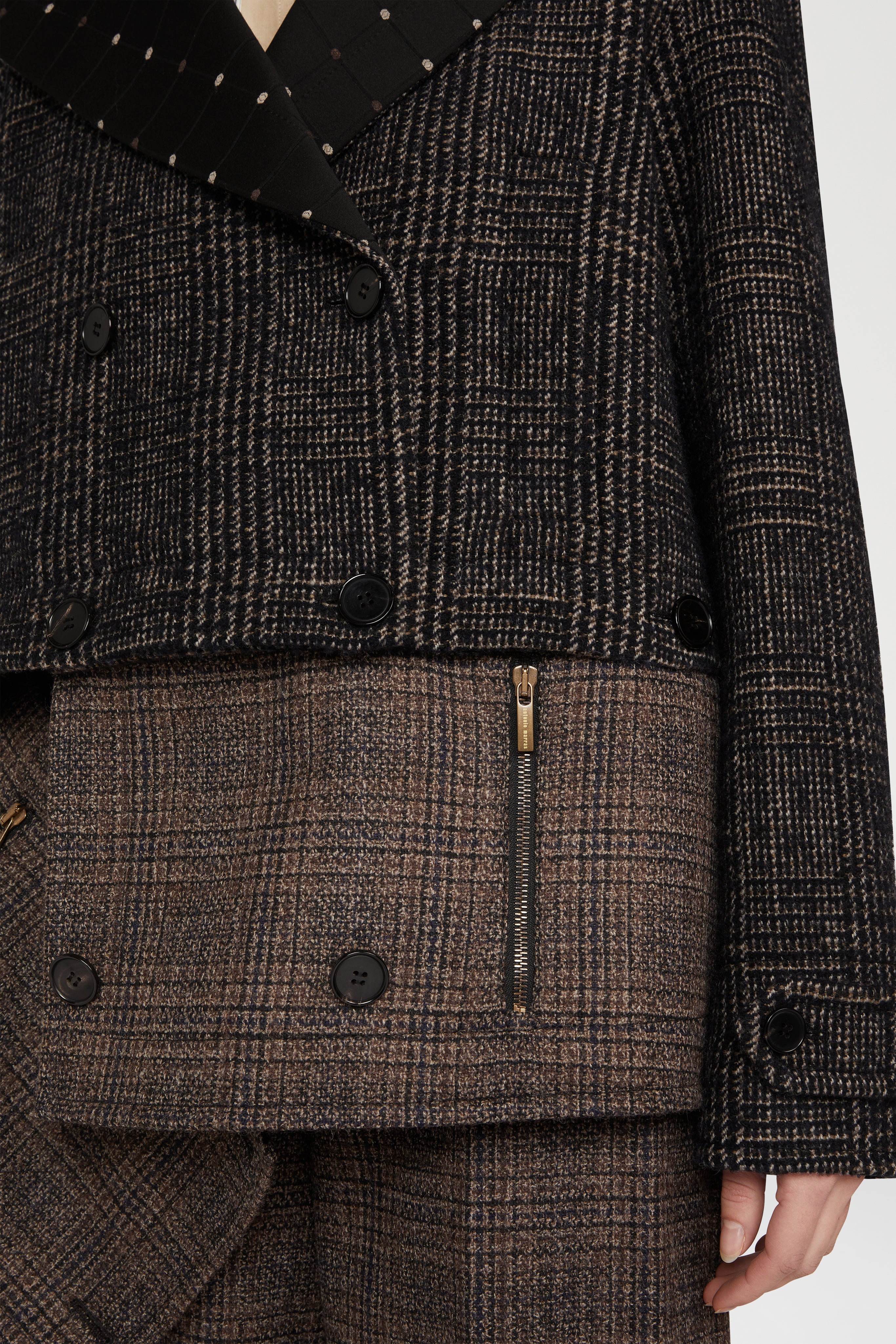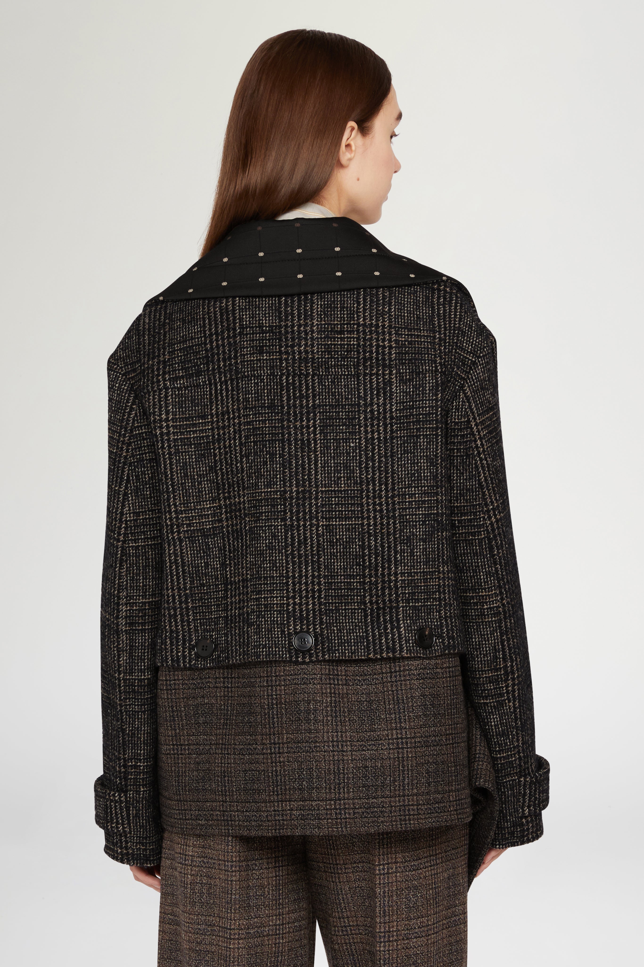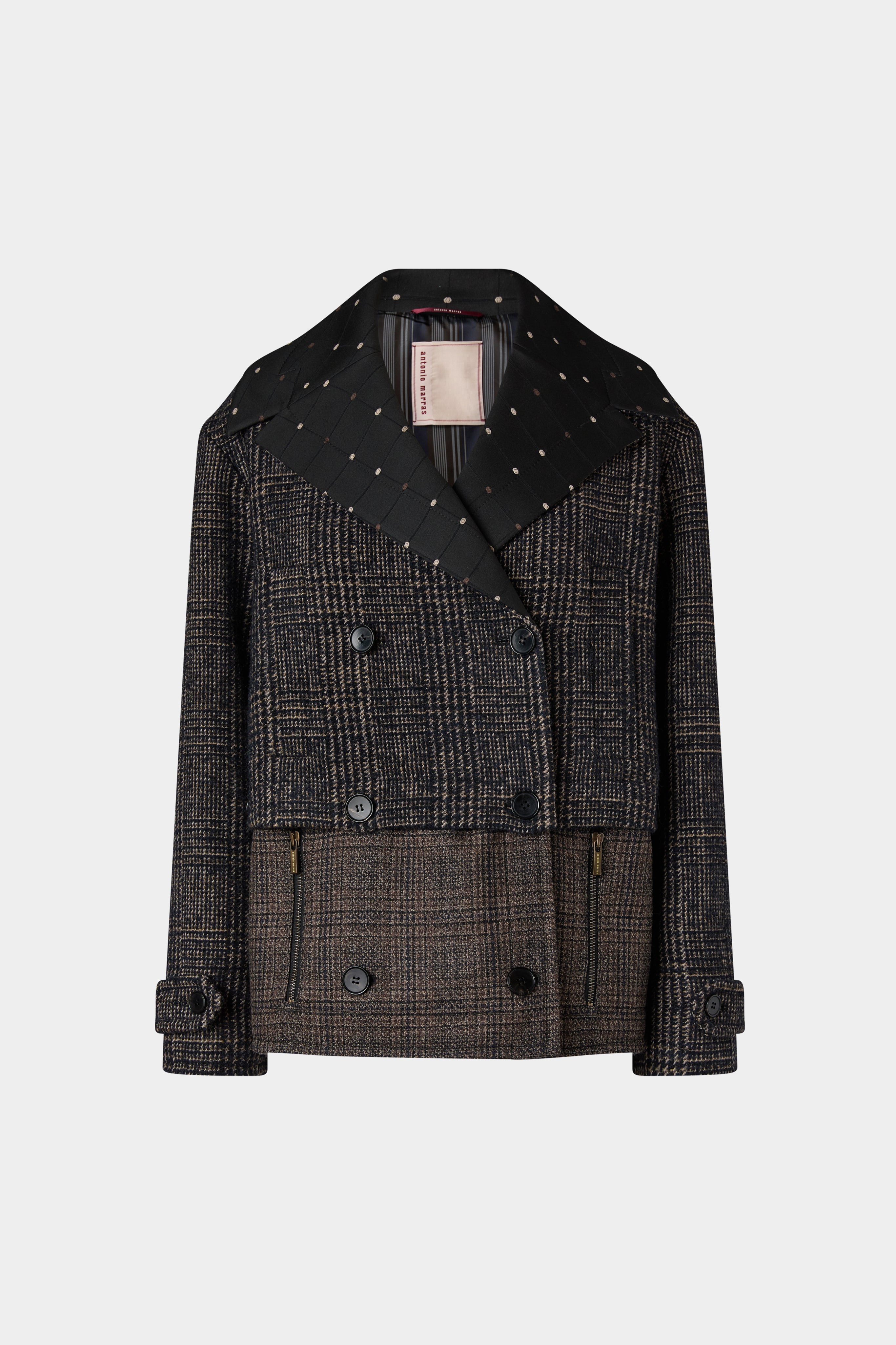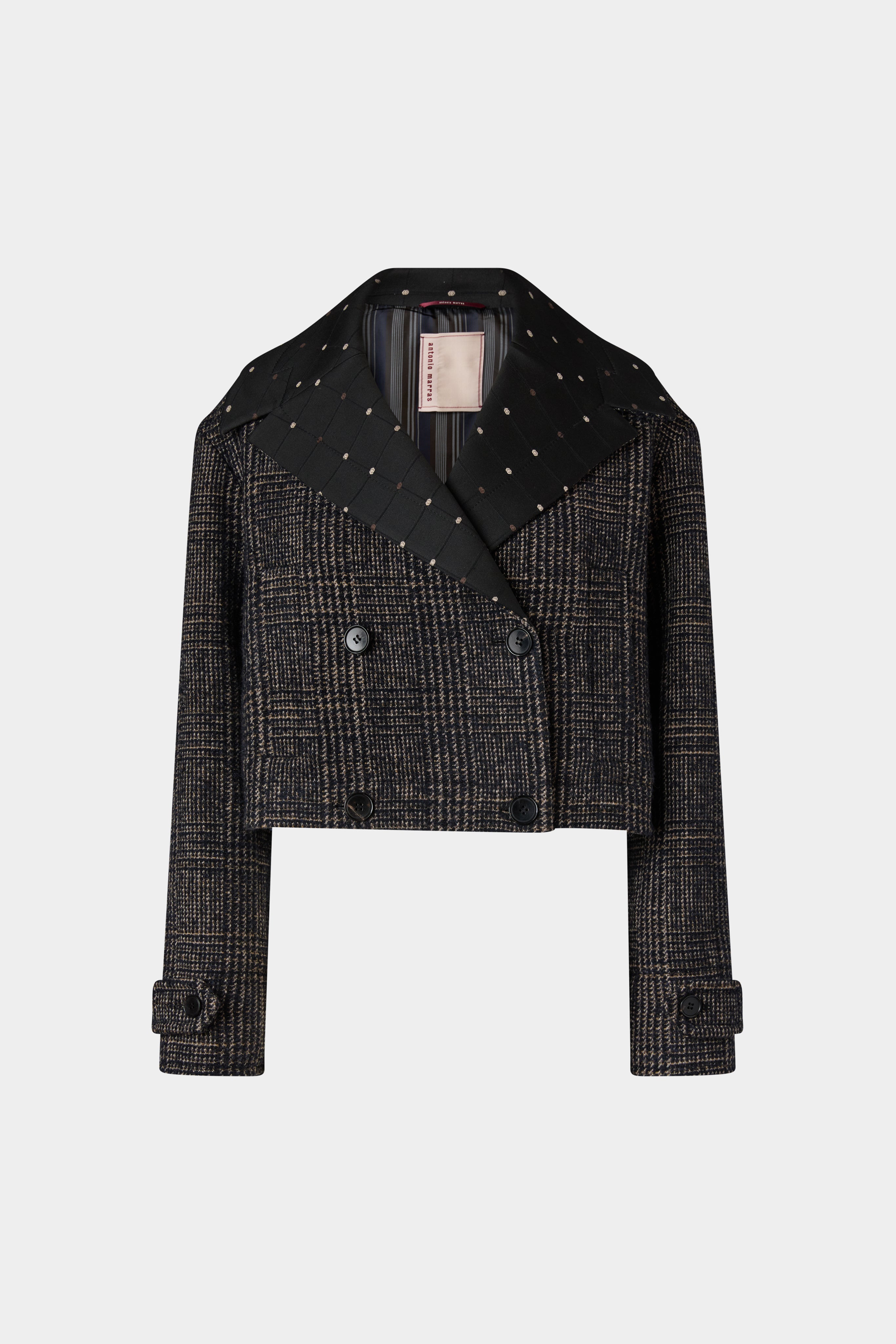 Women's tailored coat in wool-blend fabric with a check pattern, featuring wide decorated lapels and double-breasted closure. A versatile design: wear it as a full-length coat or cropped for a modern twist.
