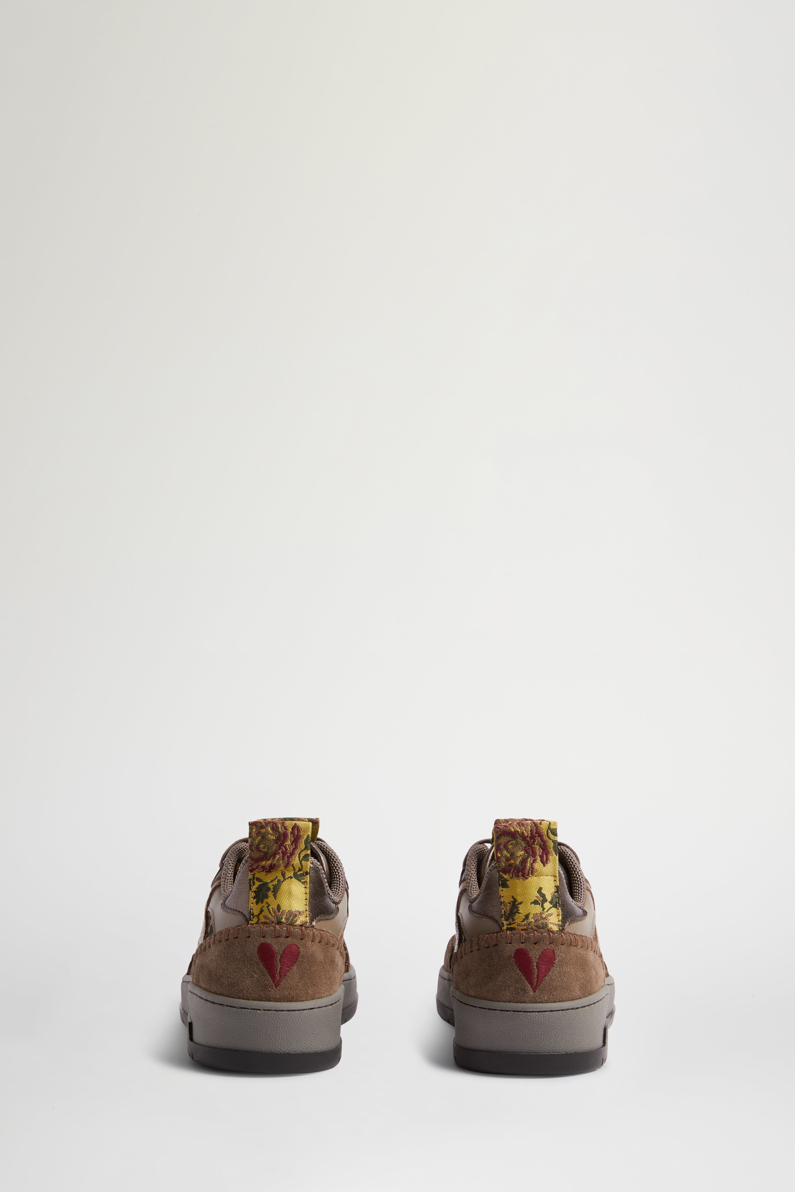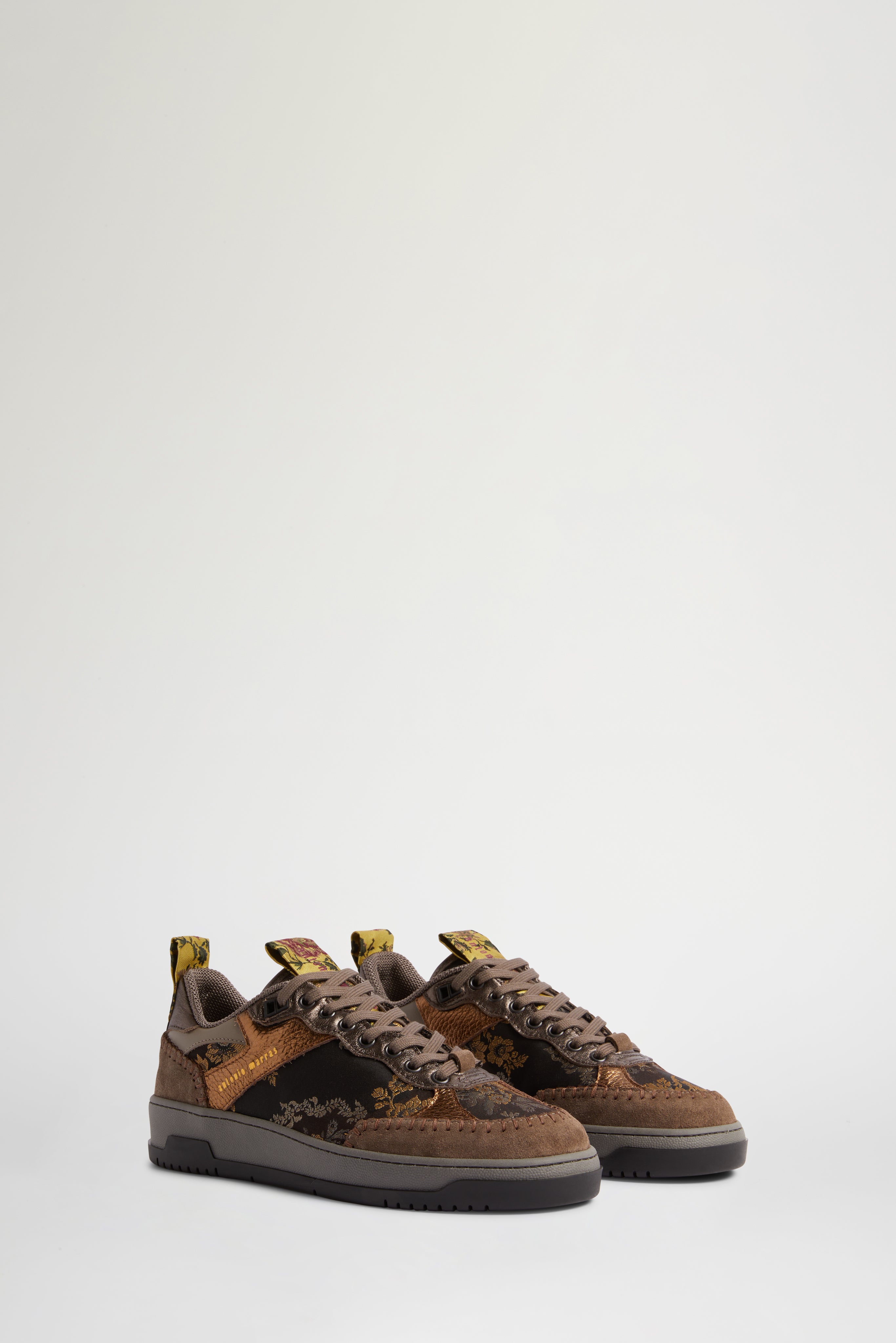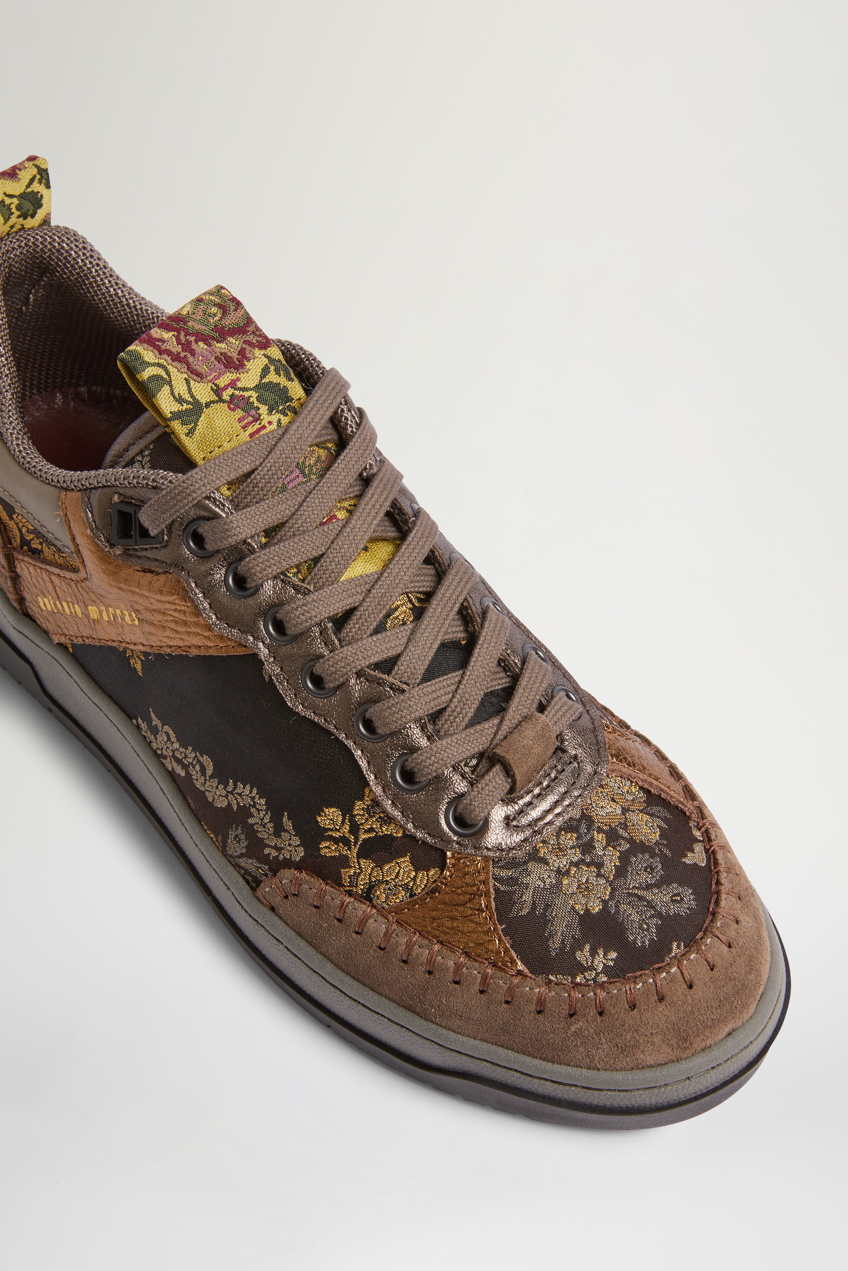 Women's low-top sneakers with jacquard brocade panels and metallic leather inserts. An eclectic, luxe take on casual footwear with artisanal flair.