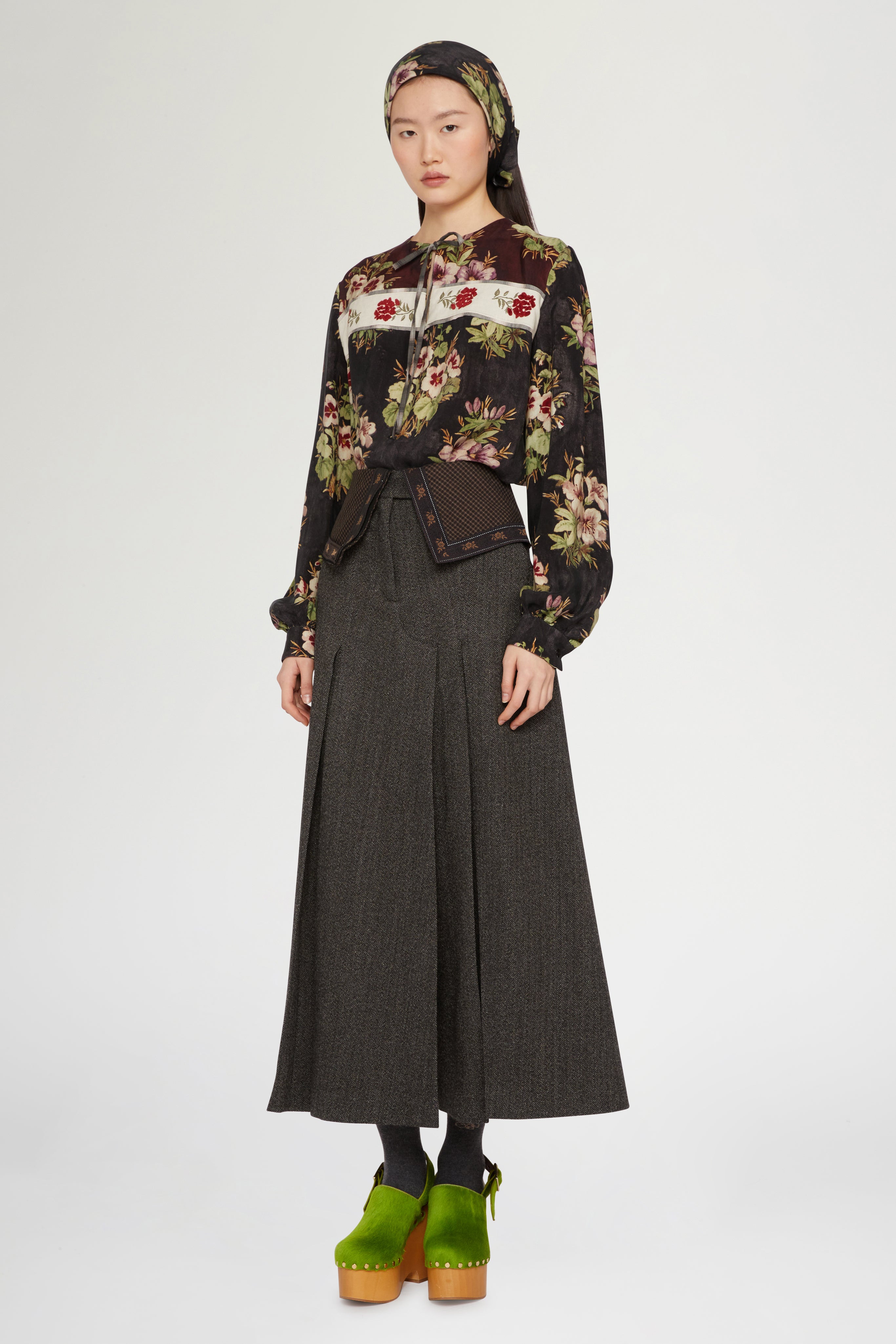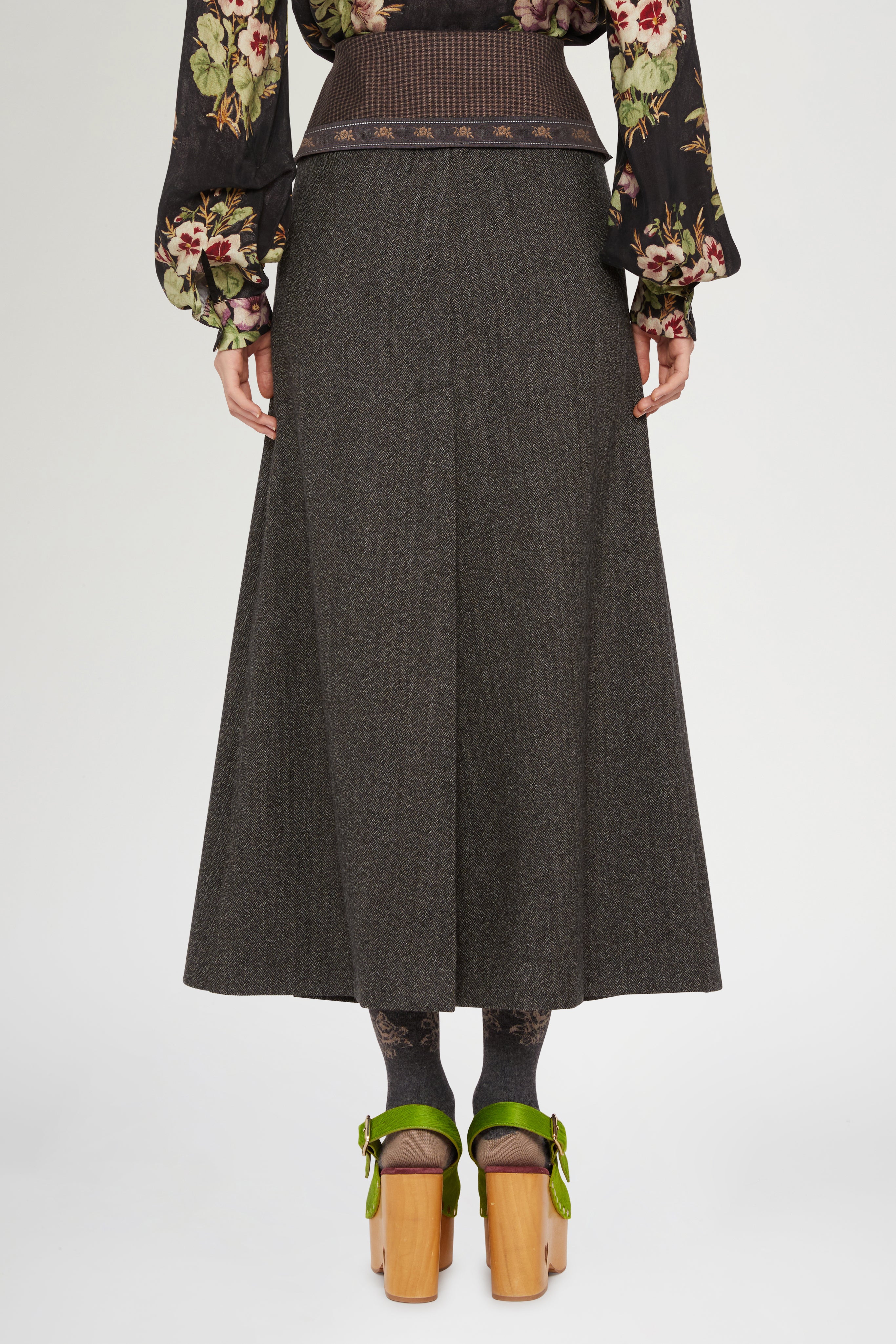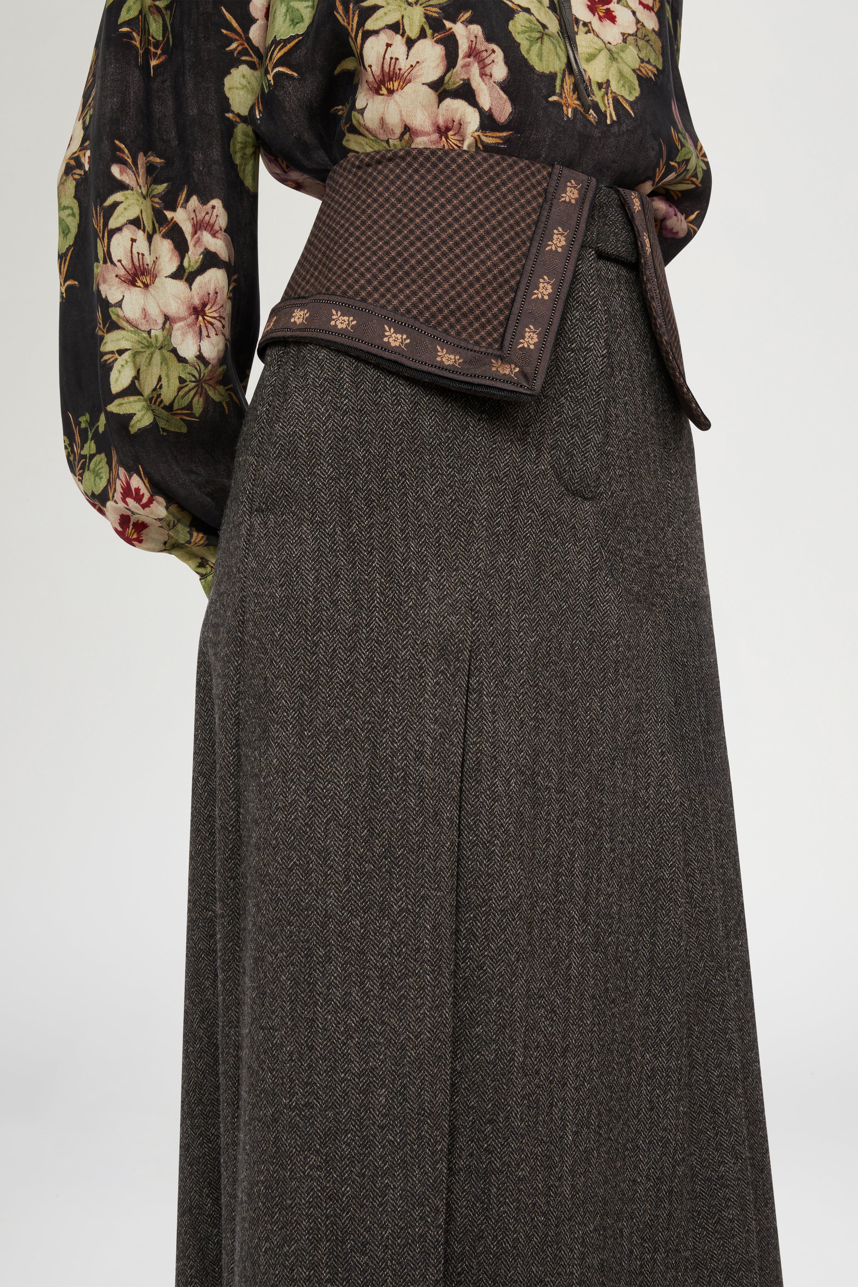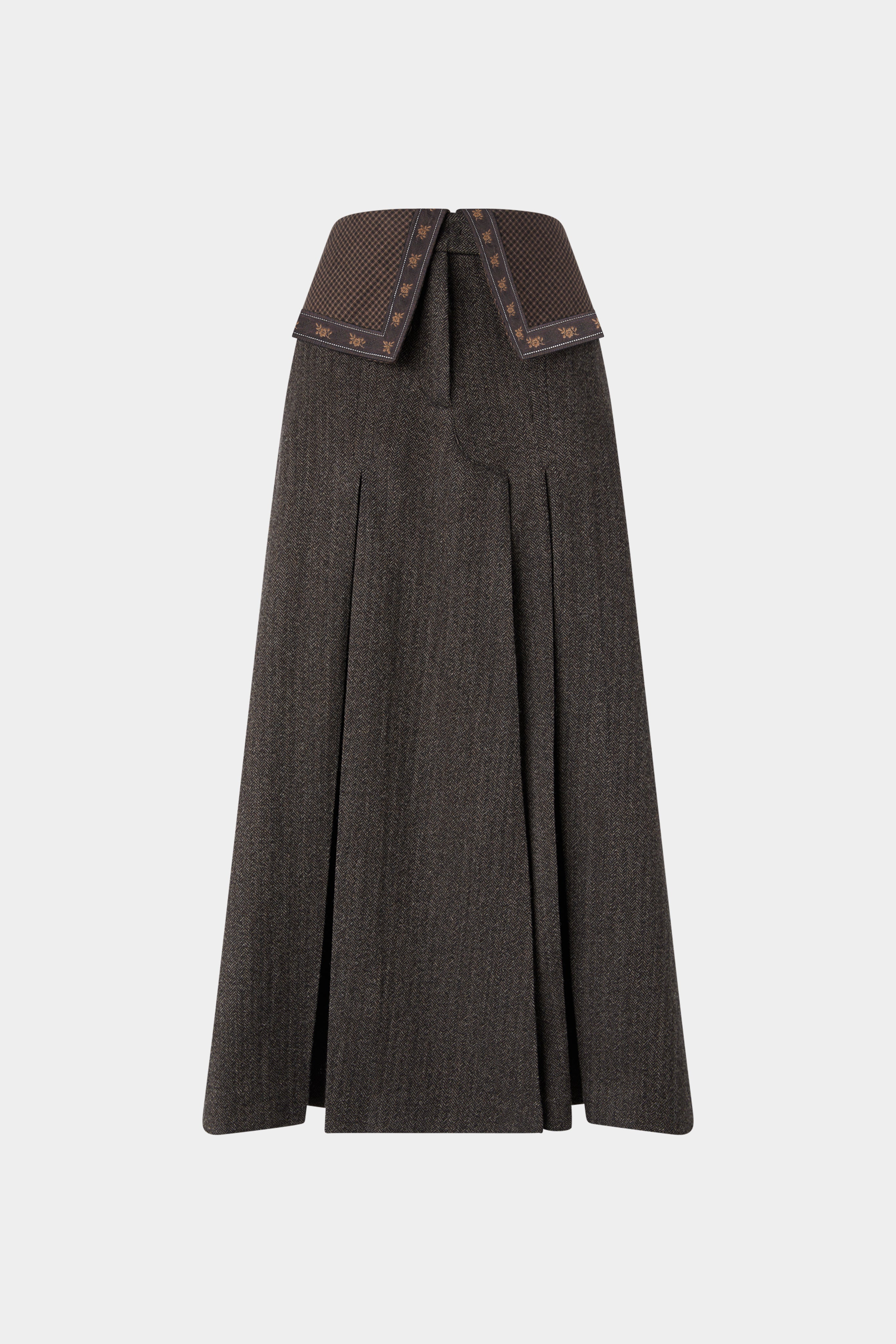 Women's elegant skirt in a refined herringbone pattern, crafted from fine wool. Midi silhouette with front pleats, distinctive contrasting waistband, and built-in trousers for comfort and ease..