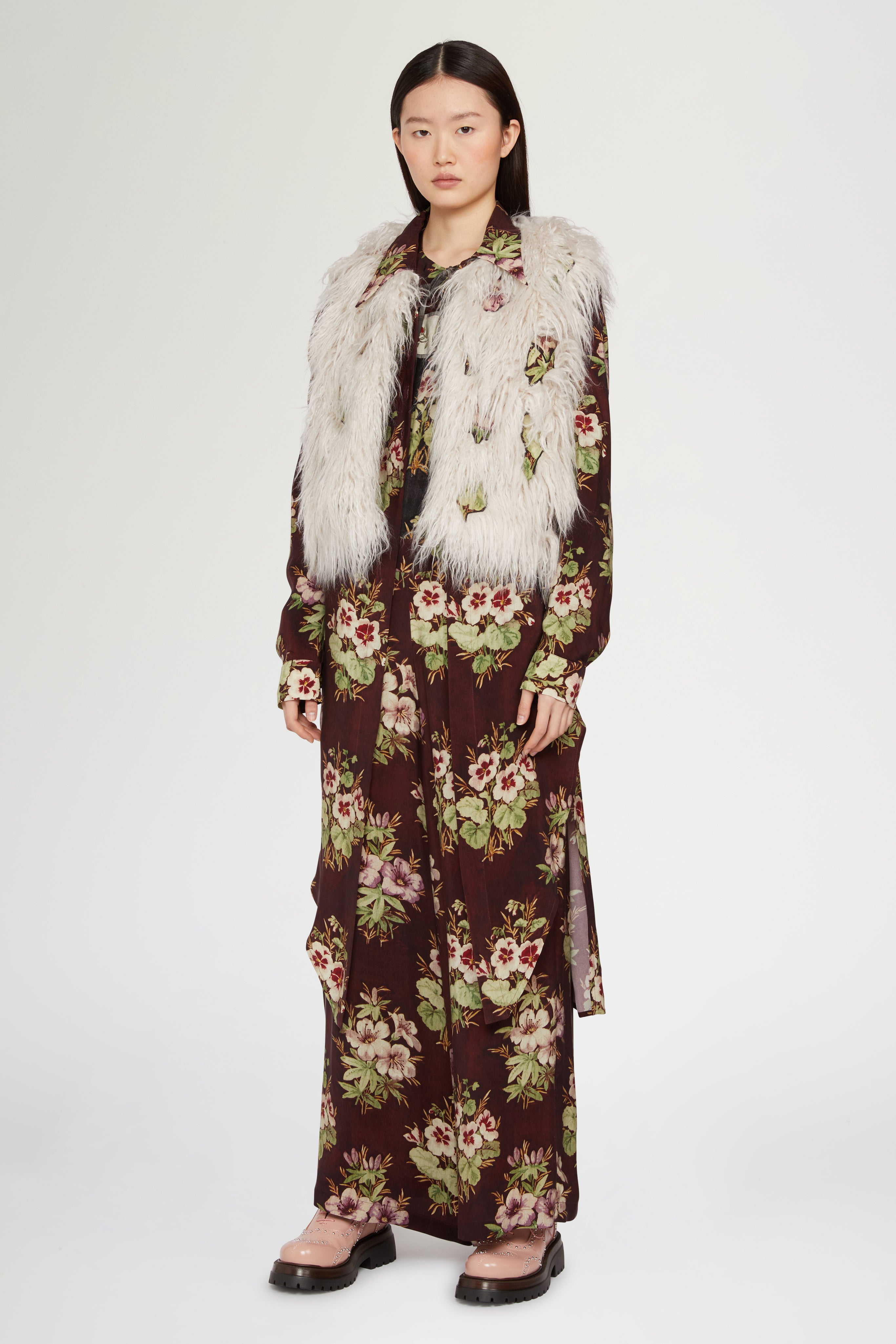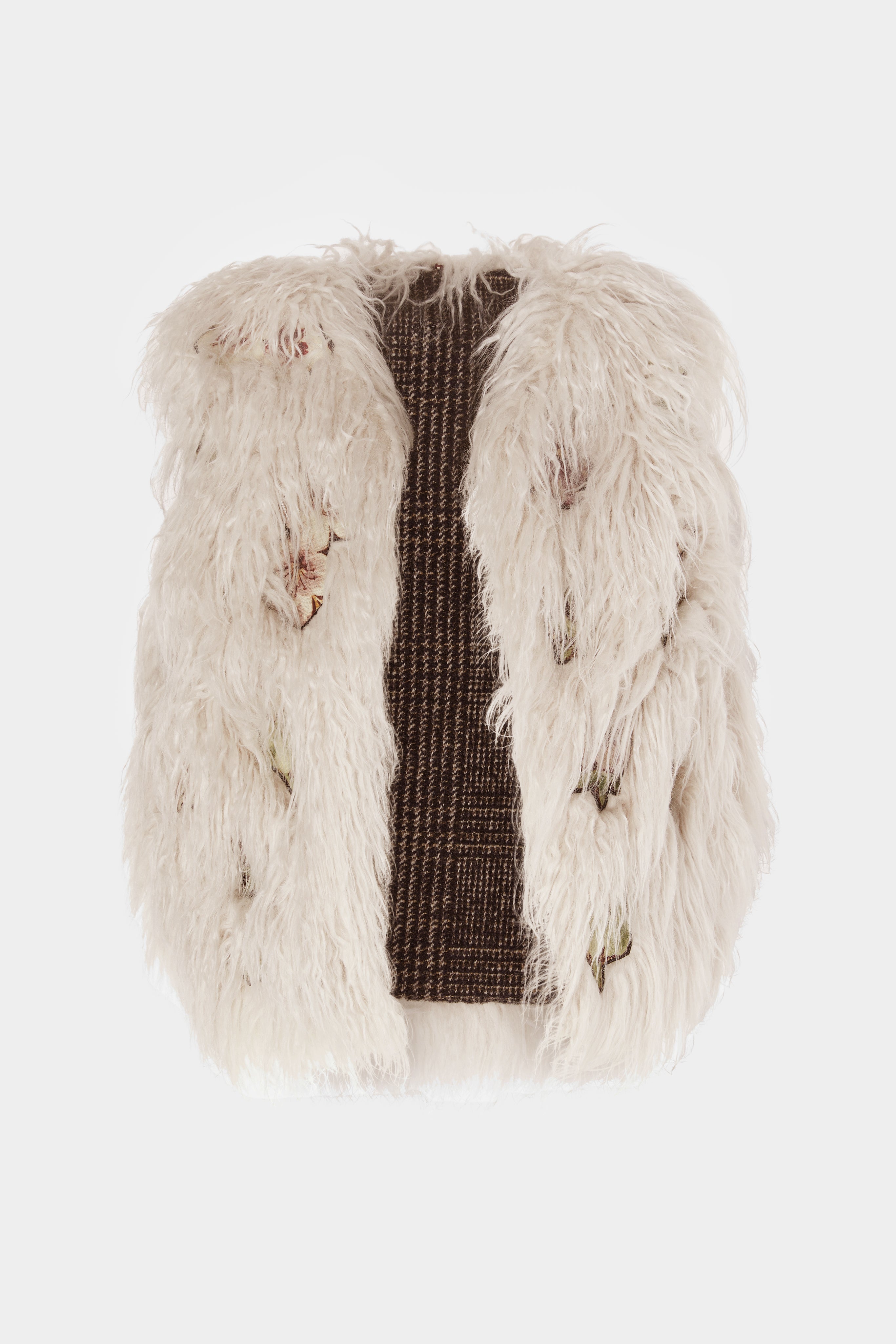Faux fur sleeveless vest with a soft, voluminous texture and open-front design. Perfect for layering over dresses or knitwear to add warmth and a statement touch.