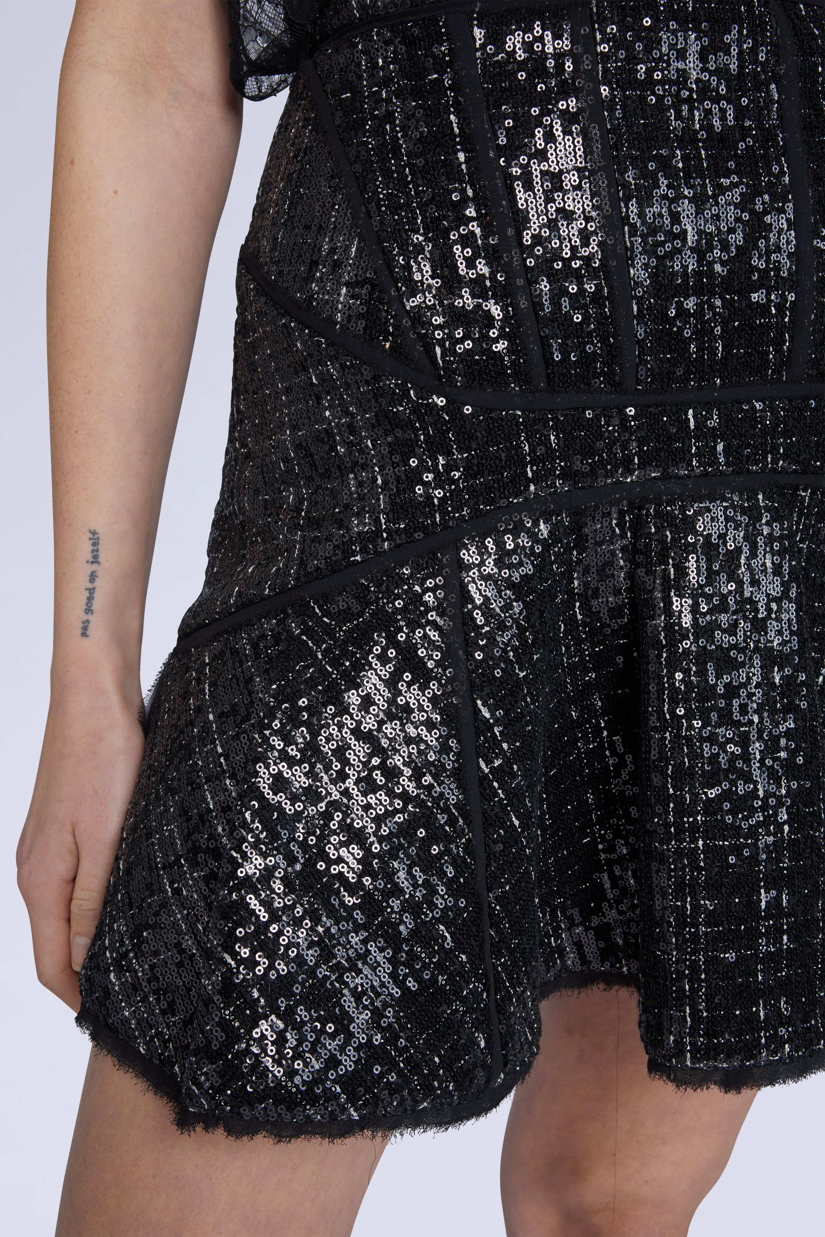 • High-waisted mini skirt in black tweed embellished with tonal sequins. Features a flared hem and raw-edge detailing for a modern finish.