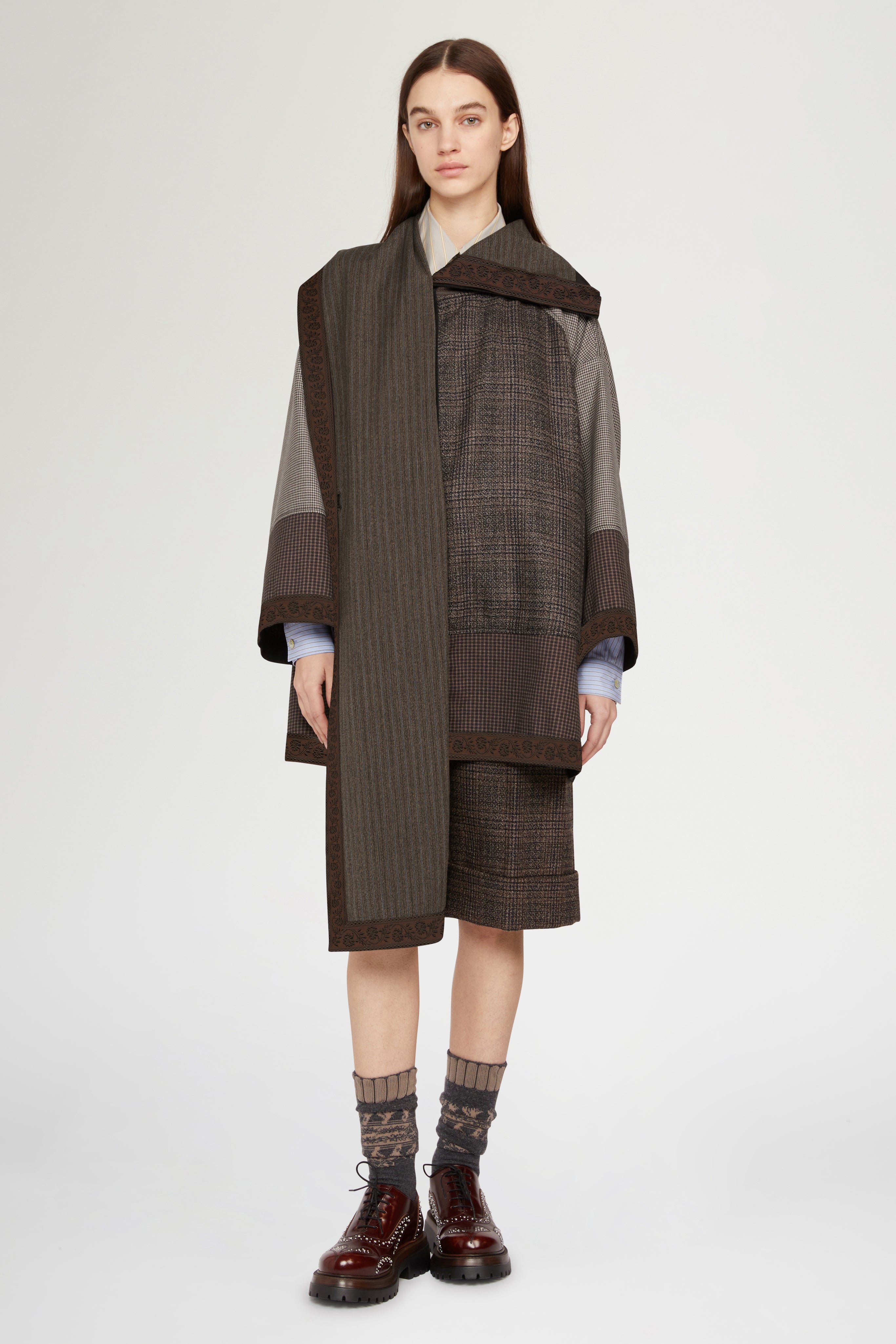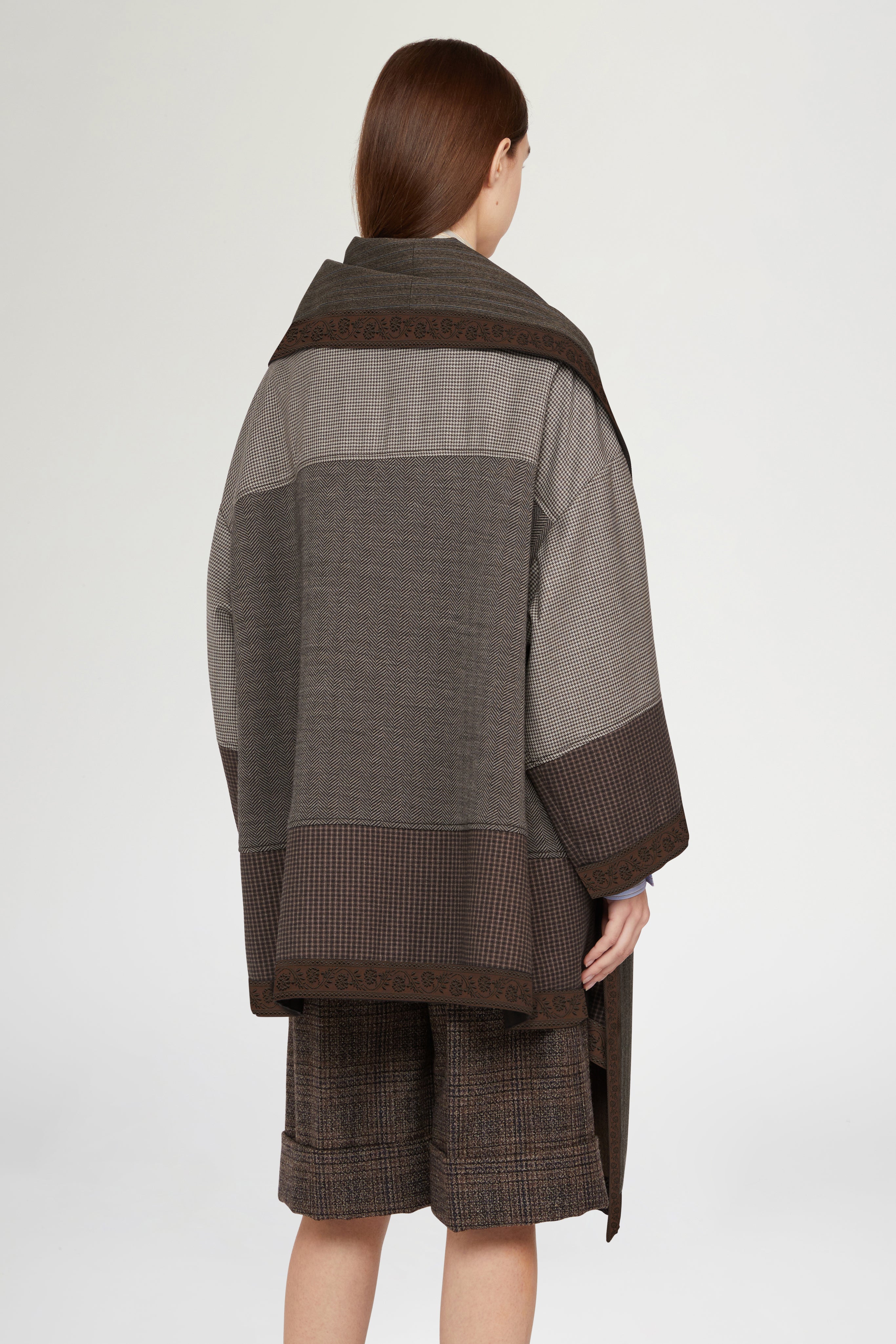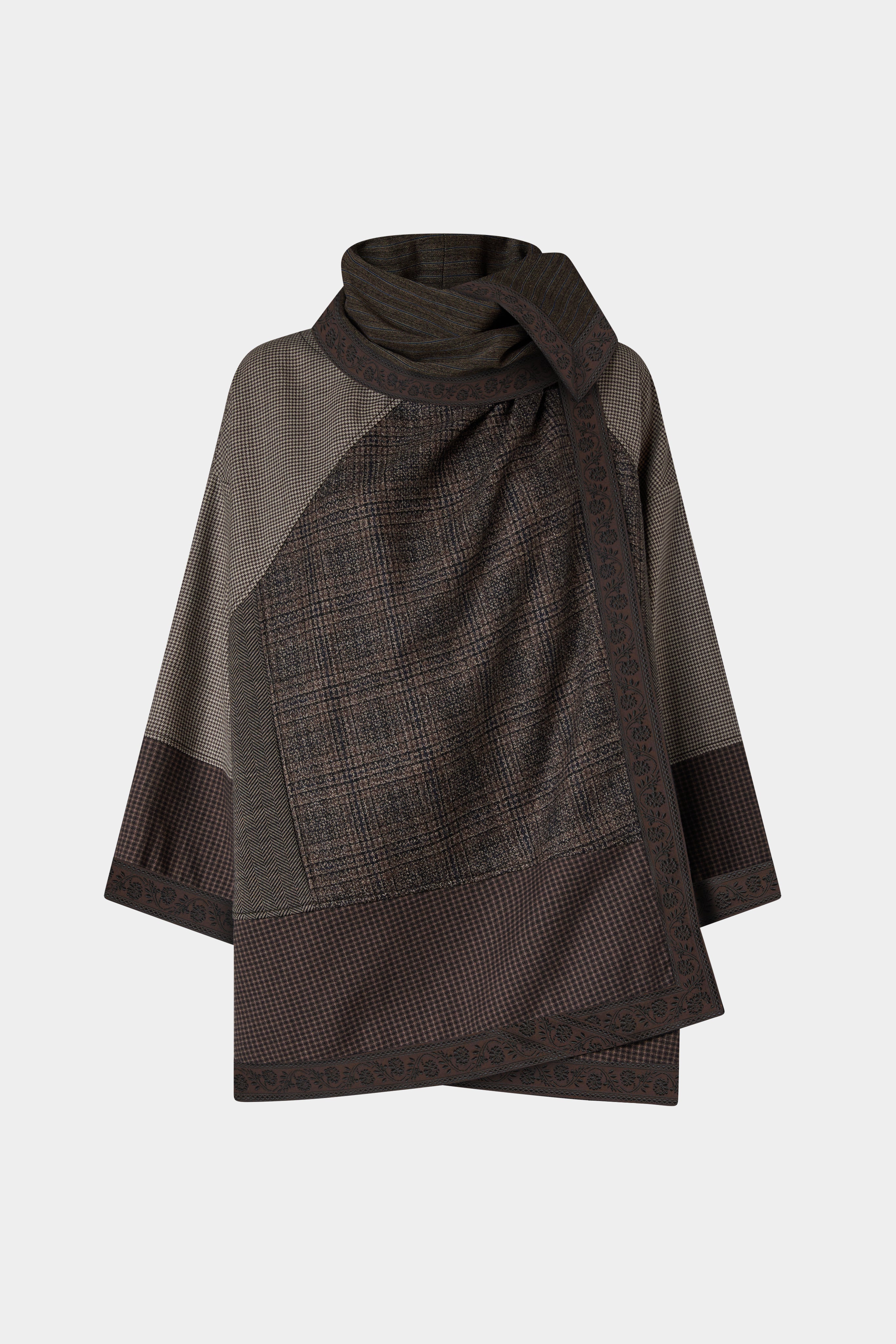 Wool-blend coat with a patchwork design and integrated scarf, finished with contrasting embroidered trims. The enveloping silhouette and tailored details make it a sophisticated and distinctive piece.