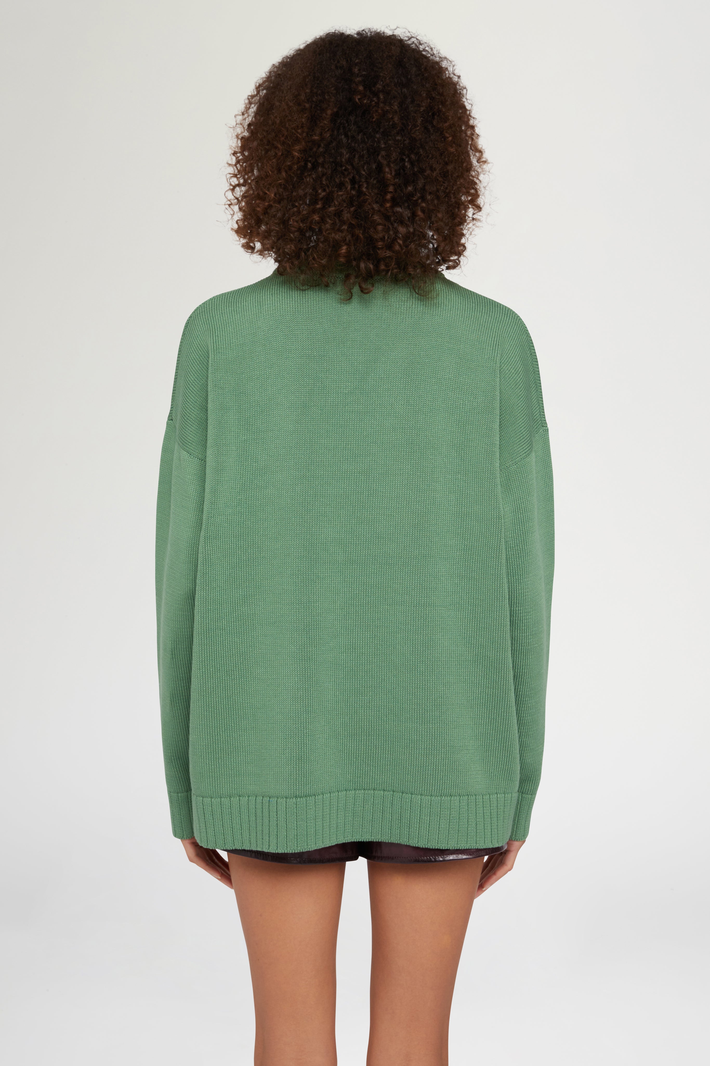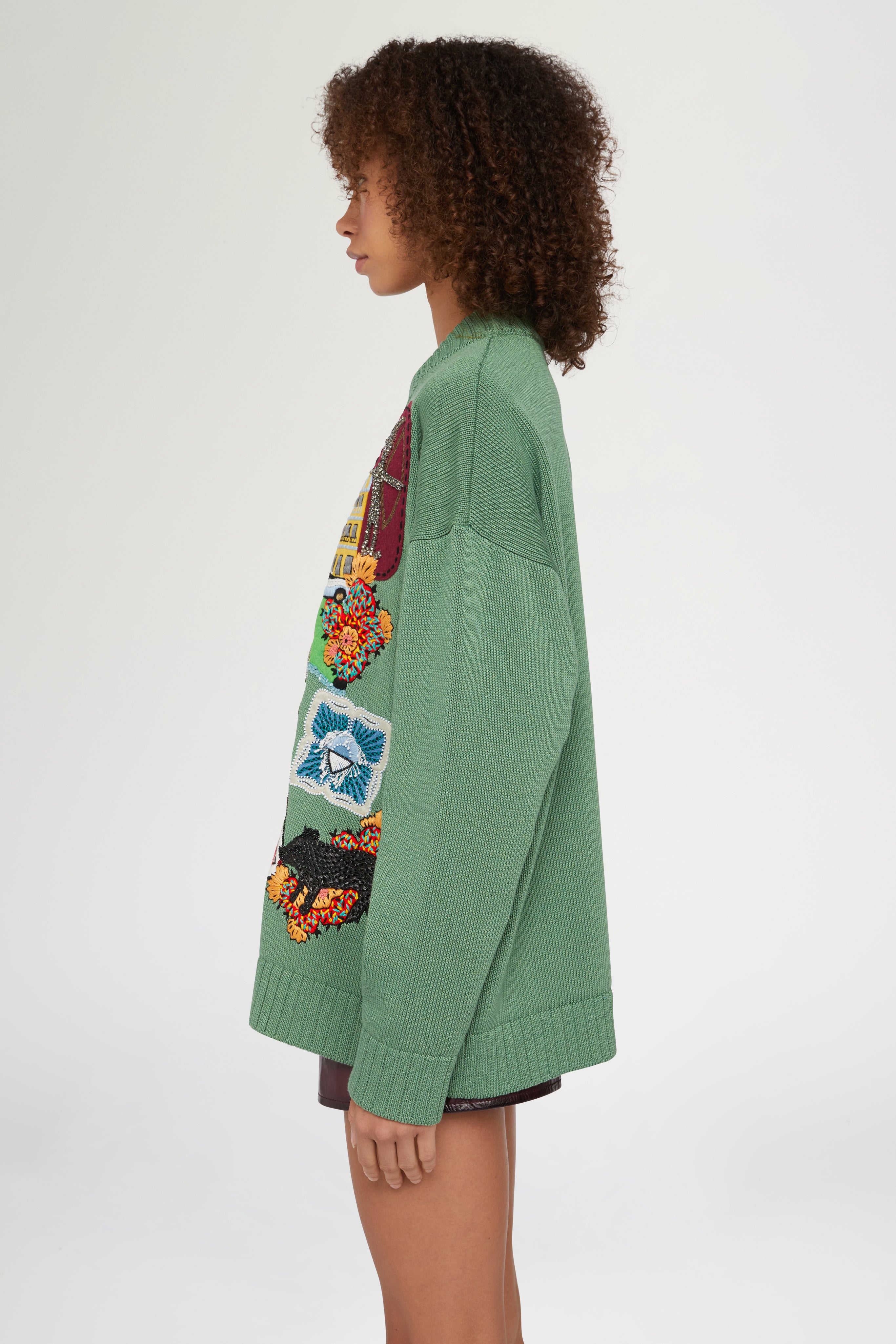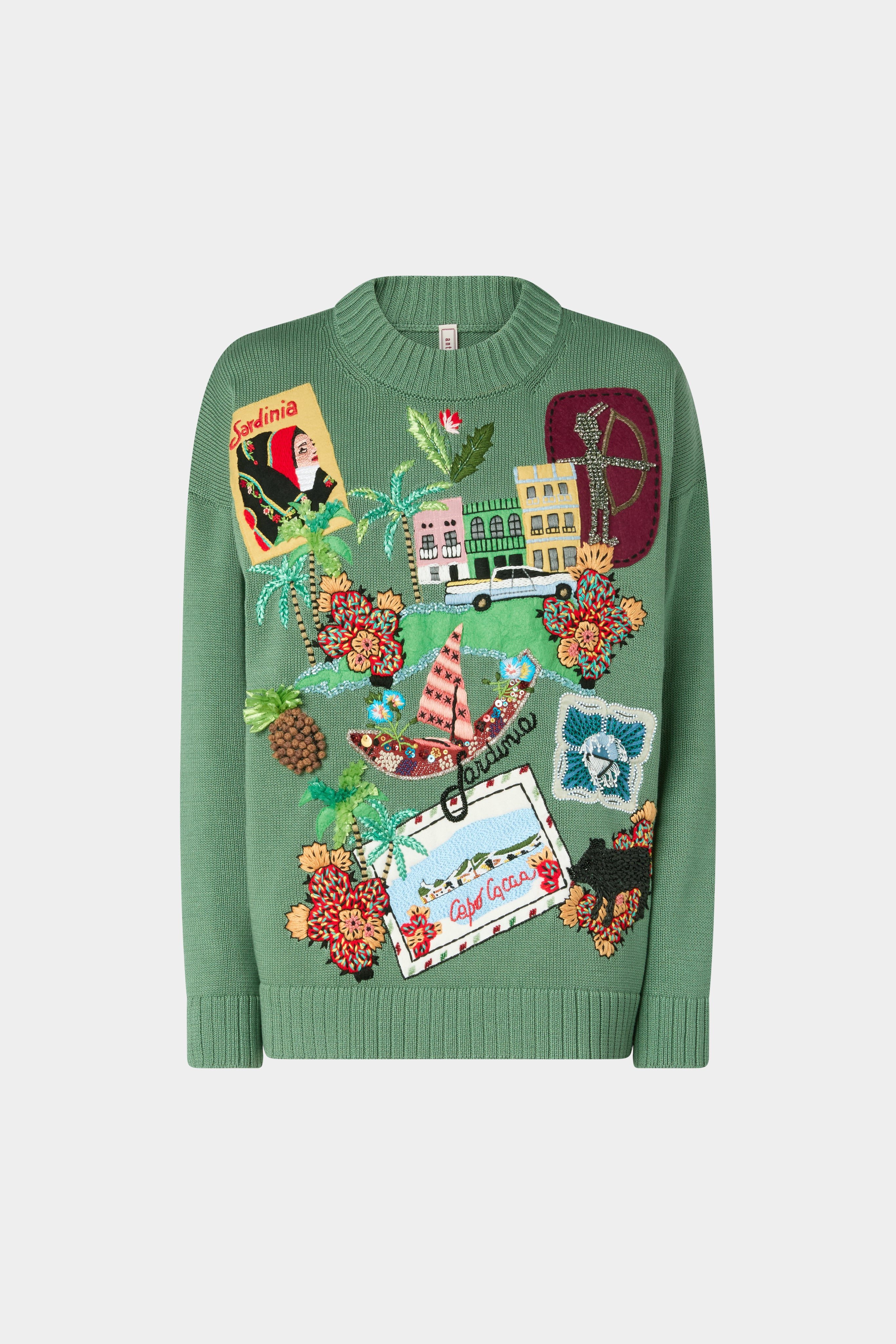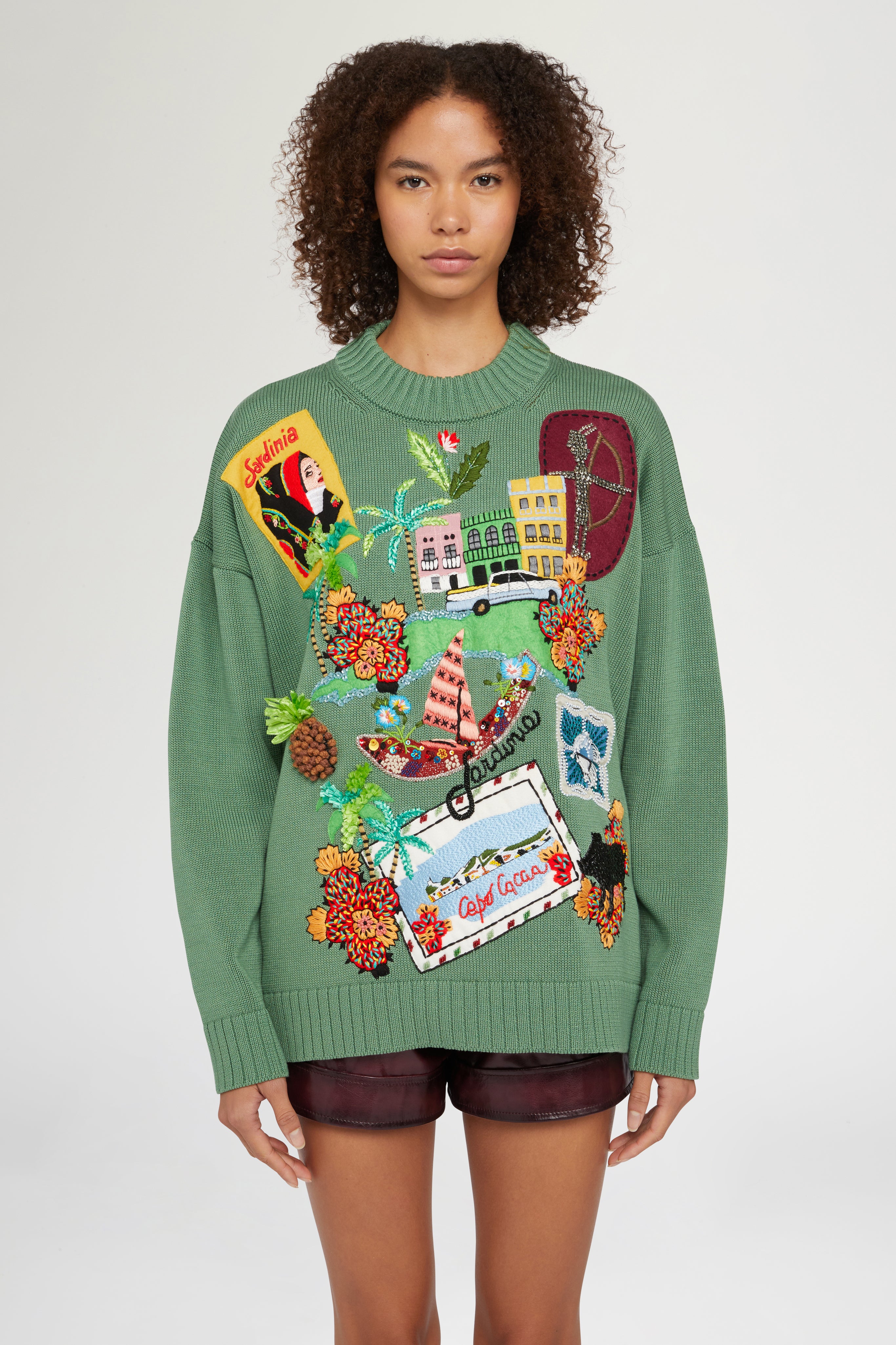 • Oversized green cotton sweater featuring 3D appliqués and intricate embroidery inspired by Sardinia, with postcards, landscapes, and floral motifs.