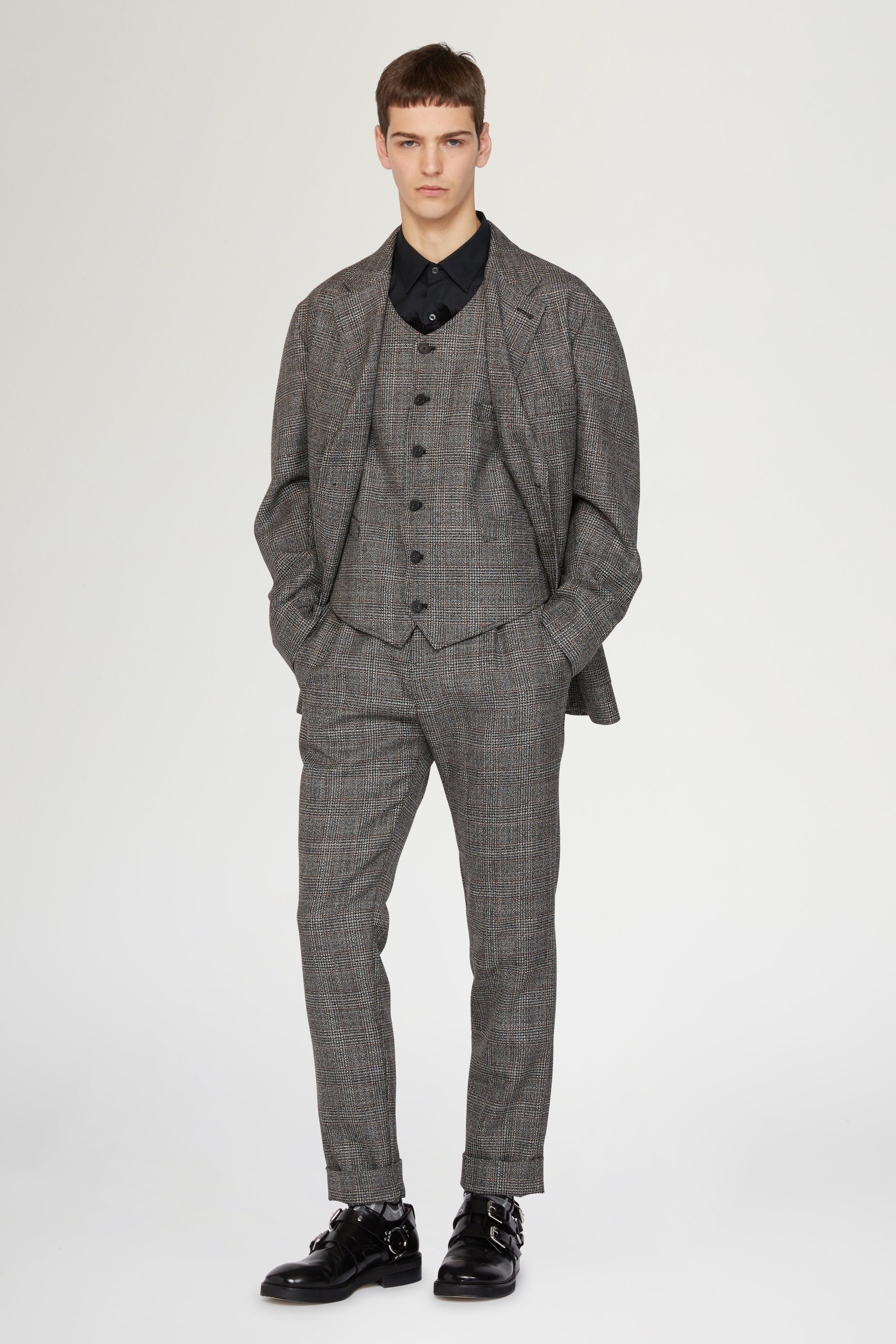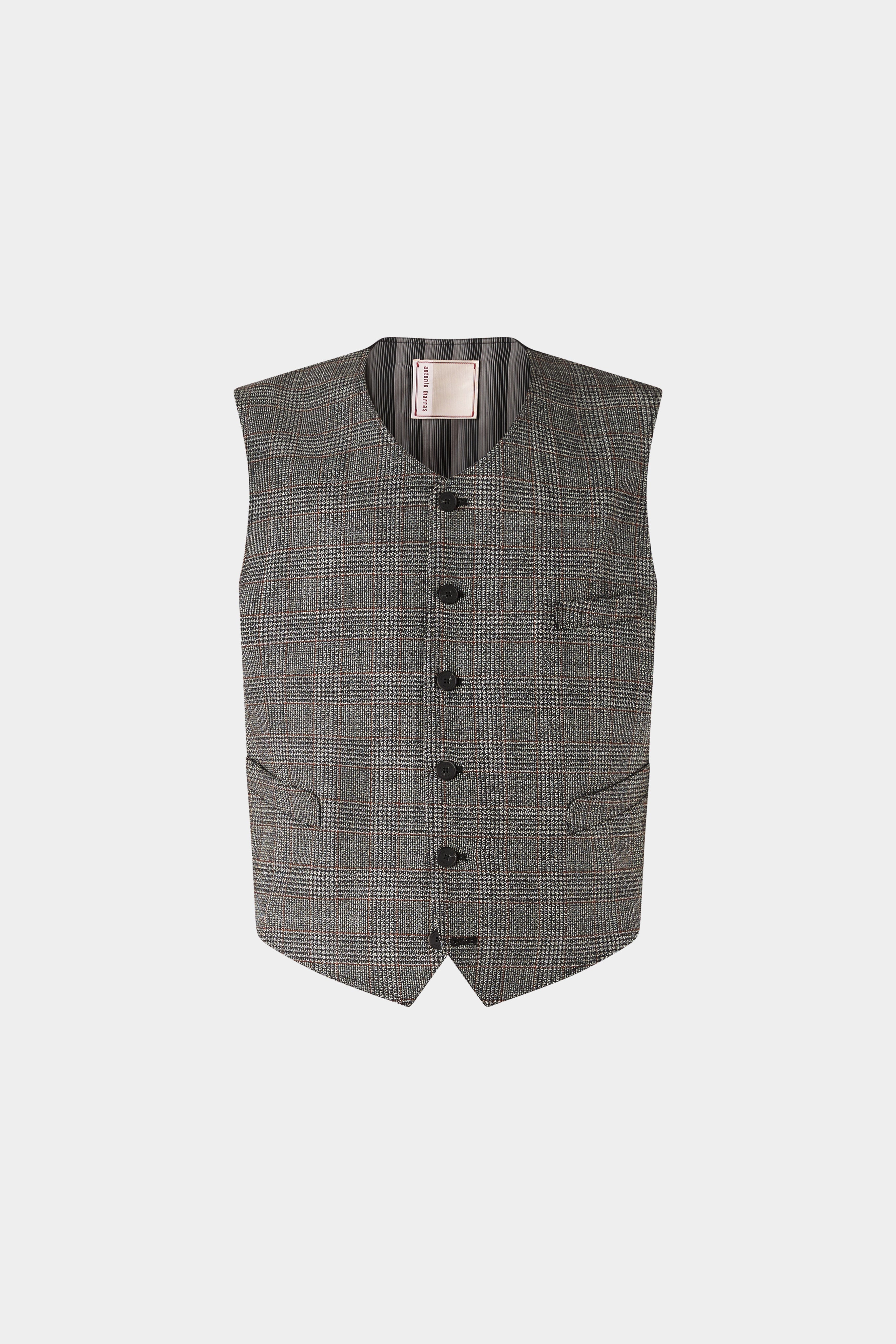 • Tailored wool vest in a refined Glen check pattern, featuring a button front, welt pockets, and adjustable back strap. A timeless layer that completes both formal and casual looks with understated elegance.
