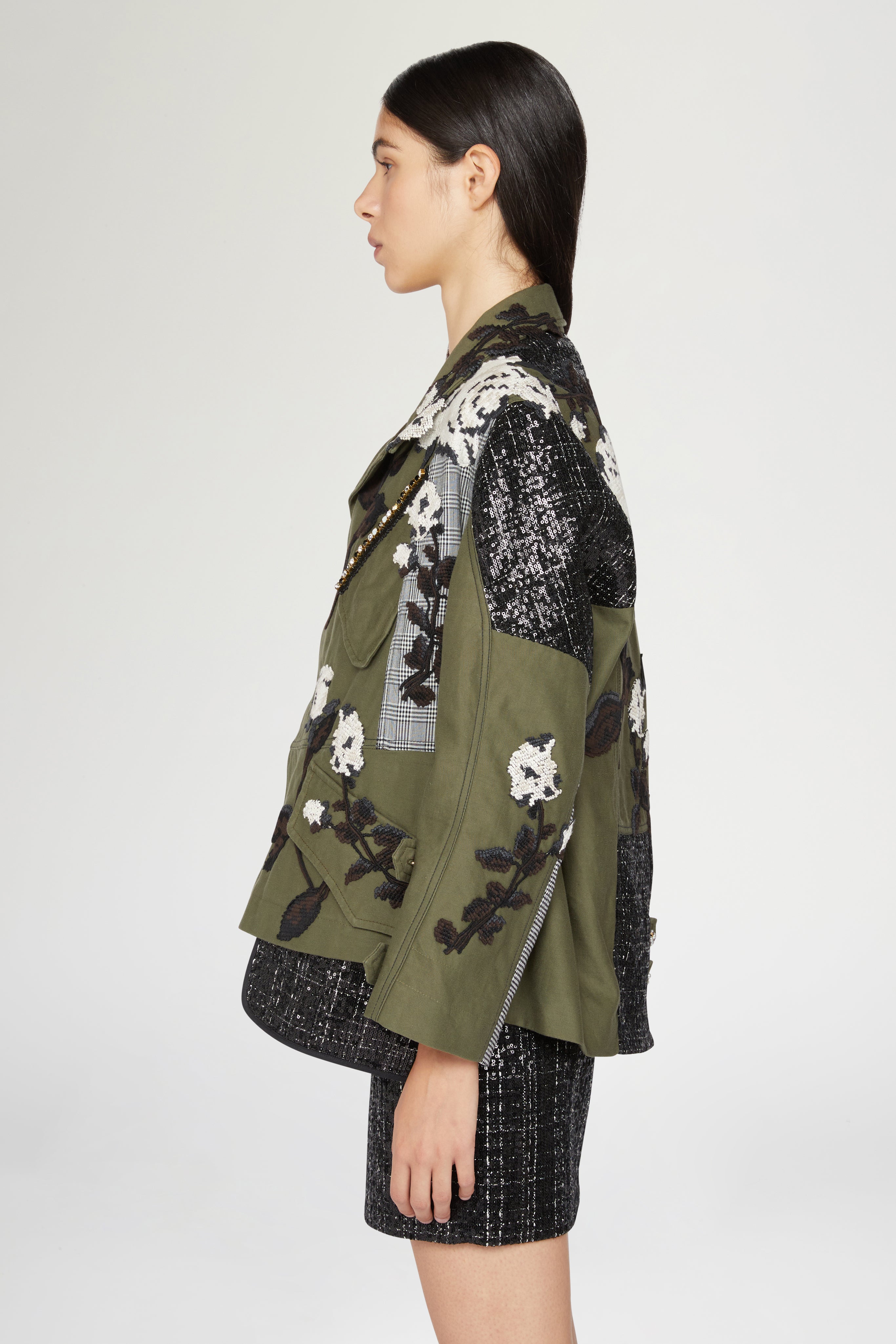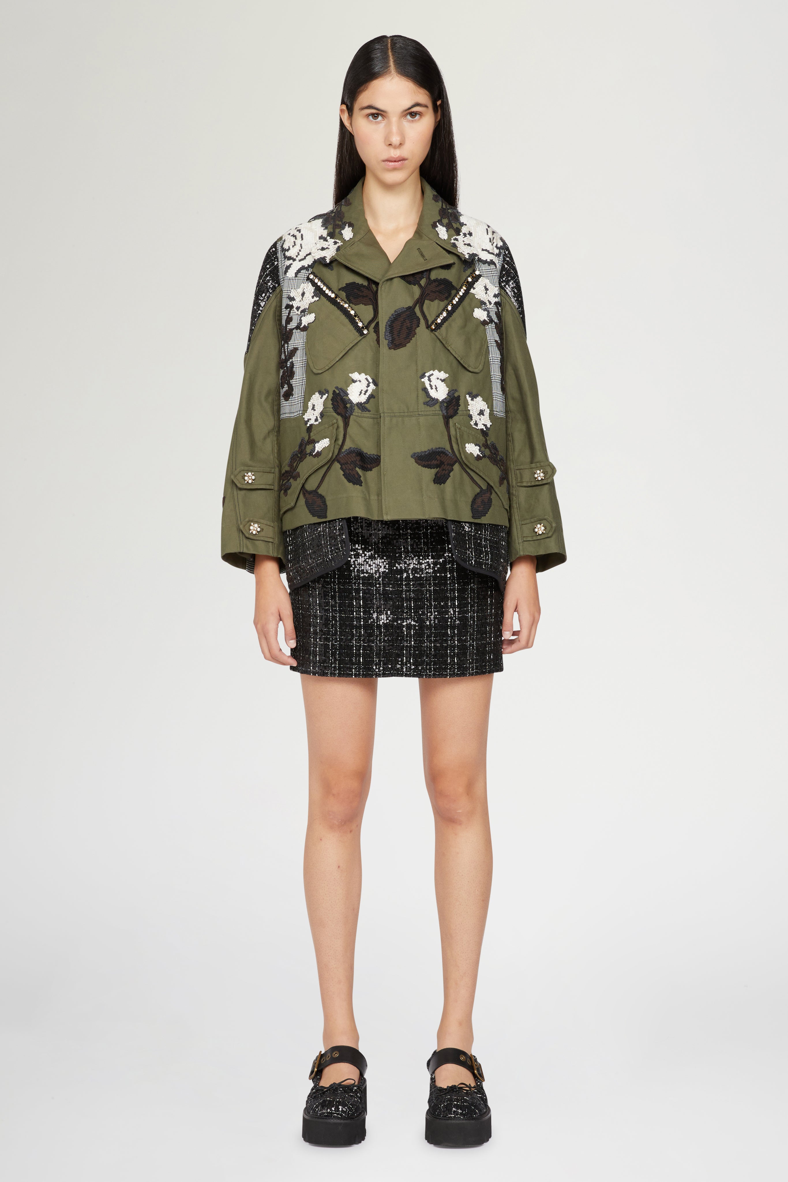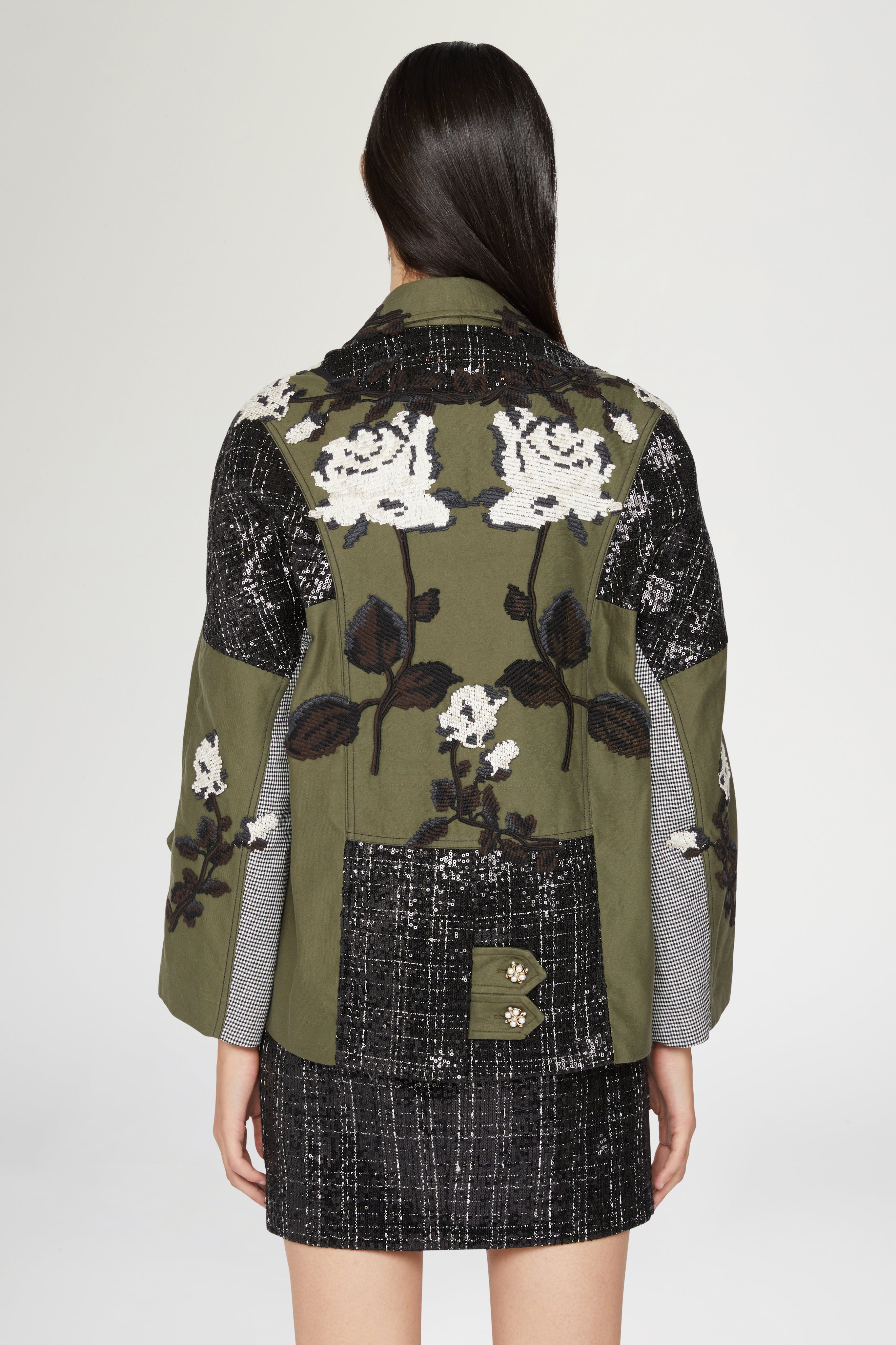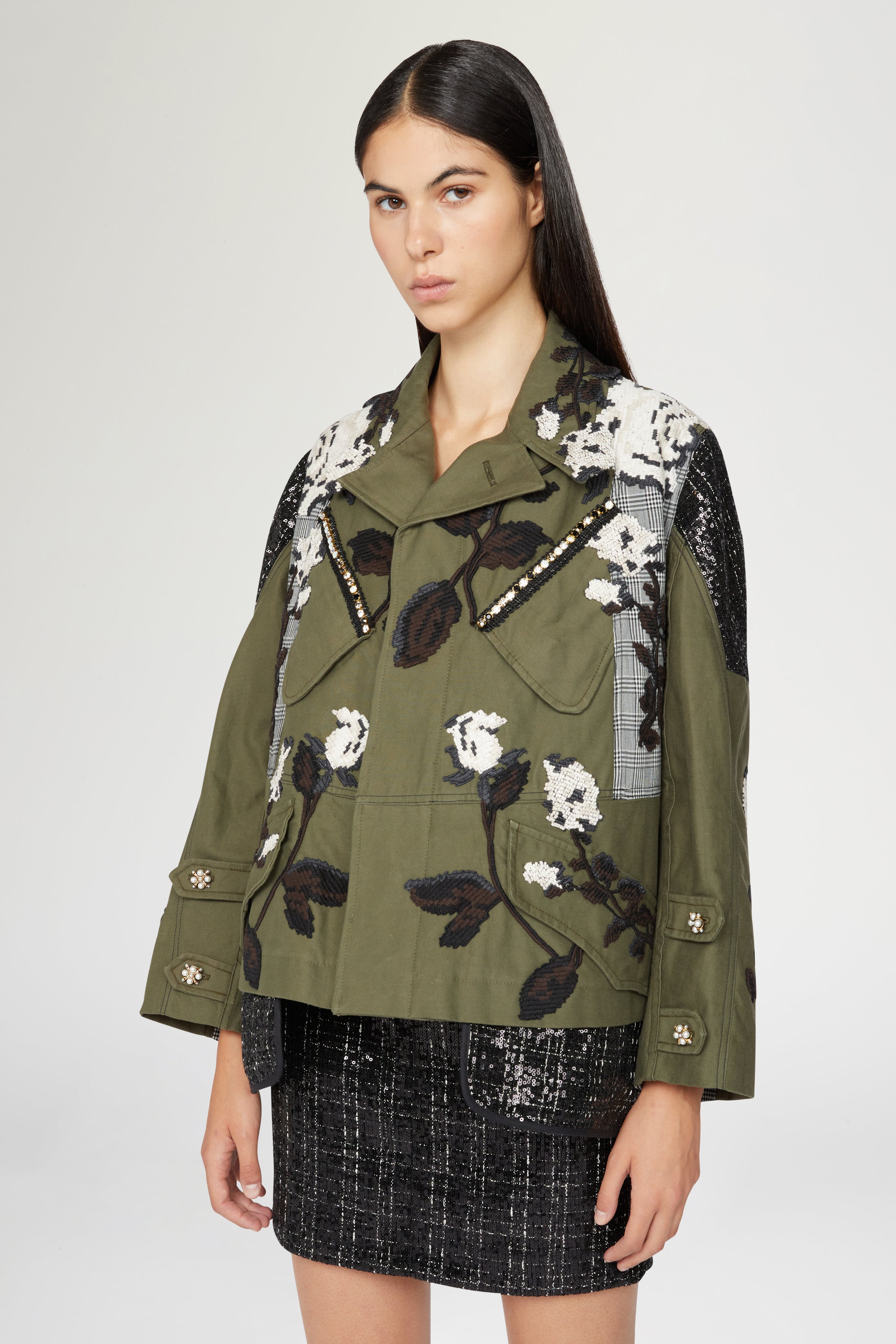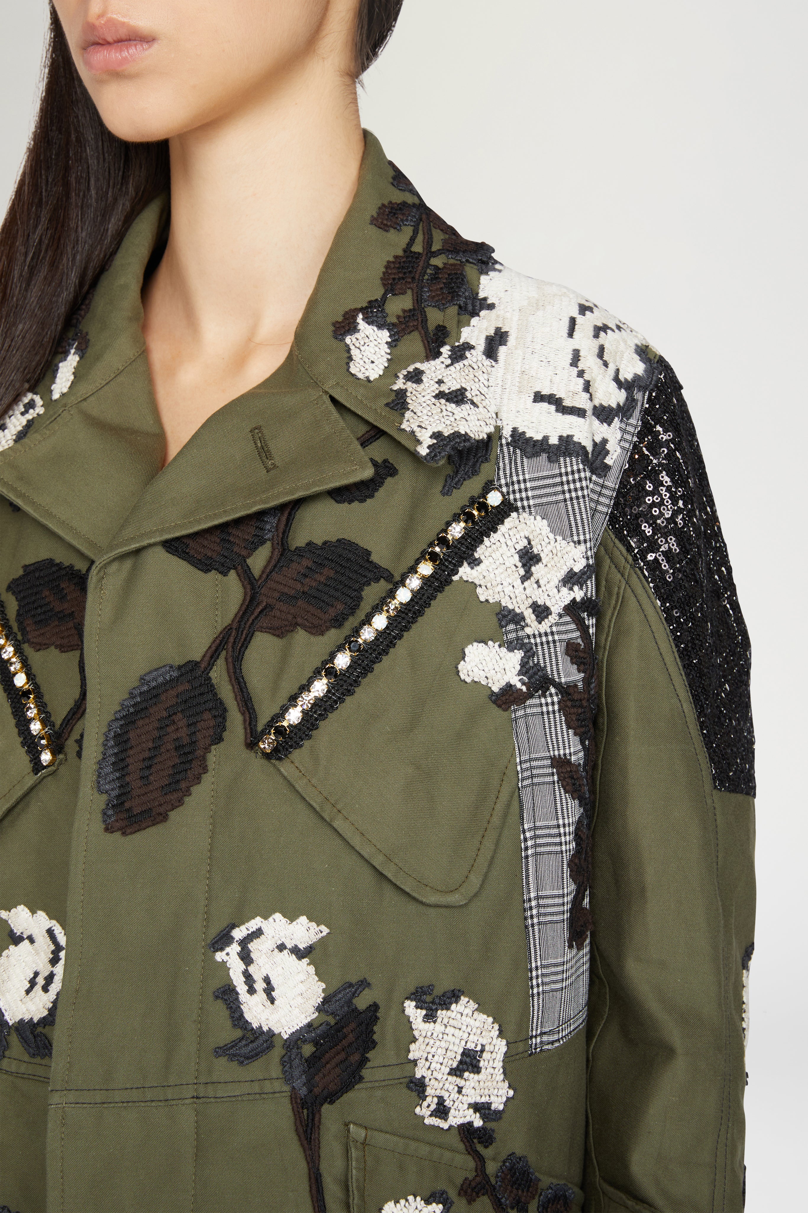Olive-green parka with a floral embroidery design, sequinned patches on the shoulders, and plaid accents along the seams.