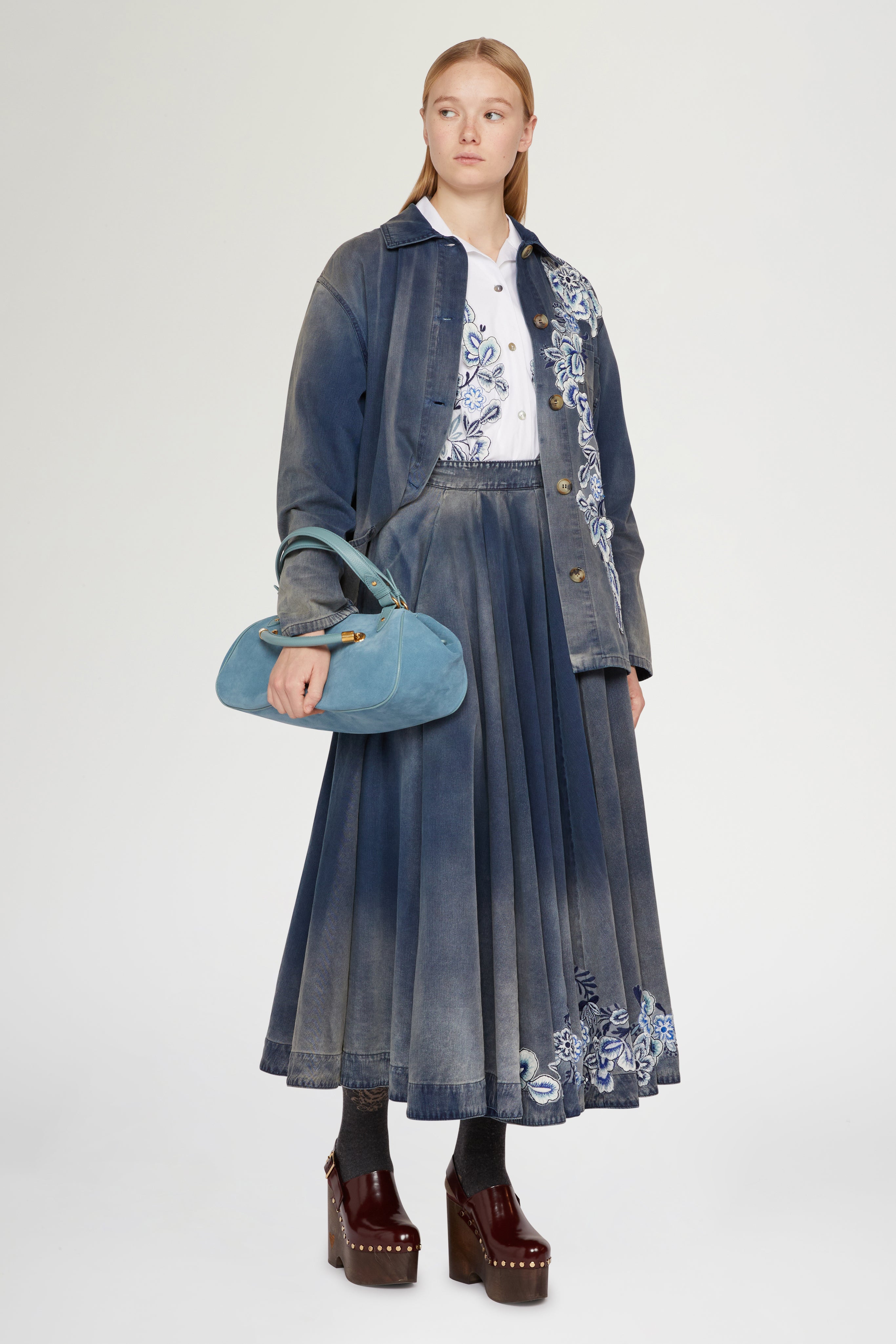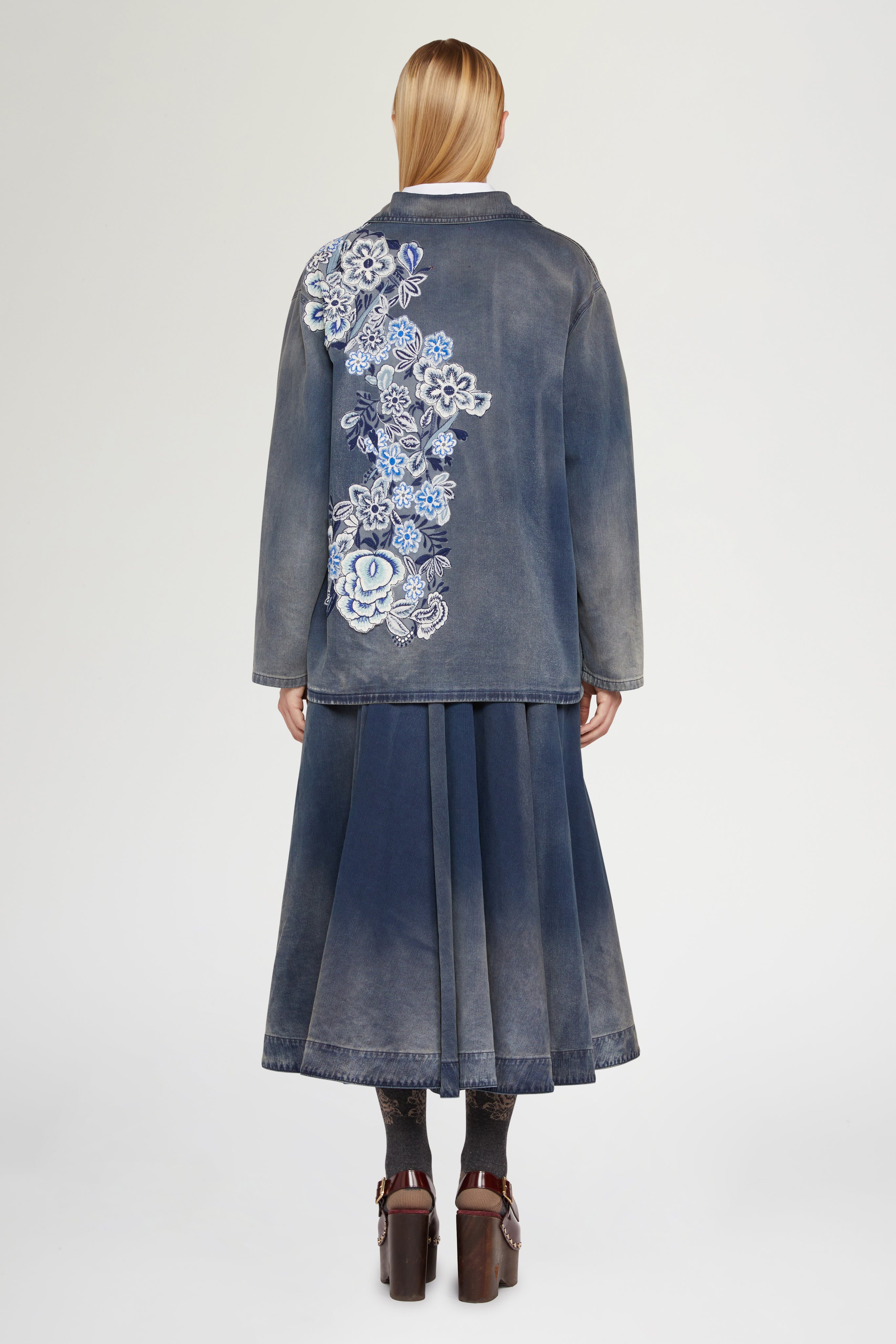 Midi skirt in blue denim with sequin embroideries and floral embroidery on the hem.