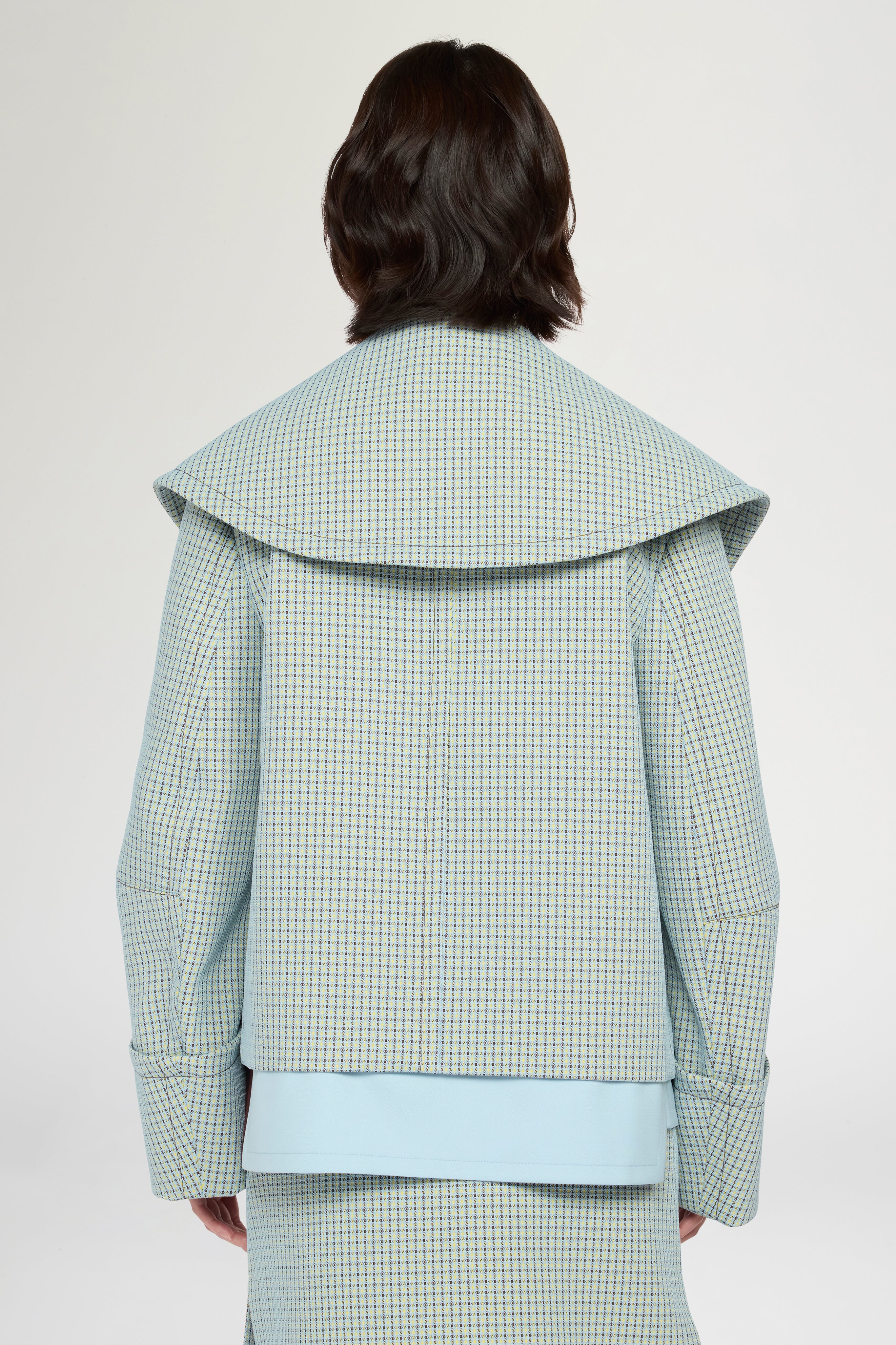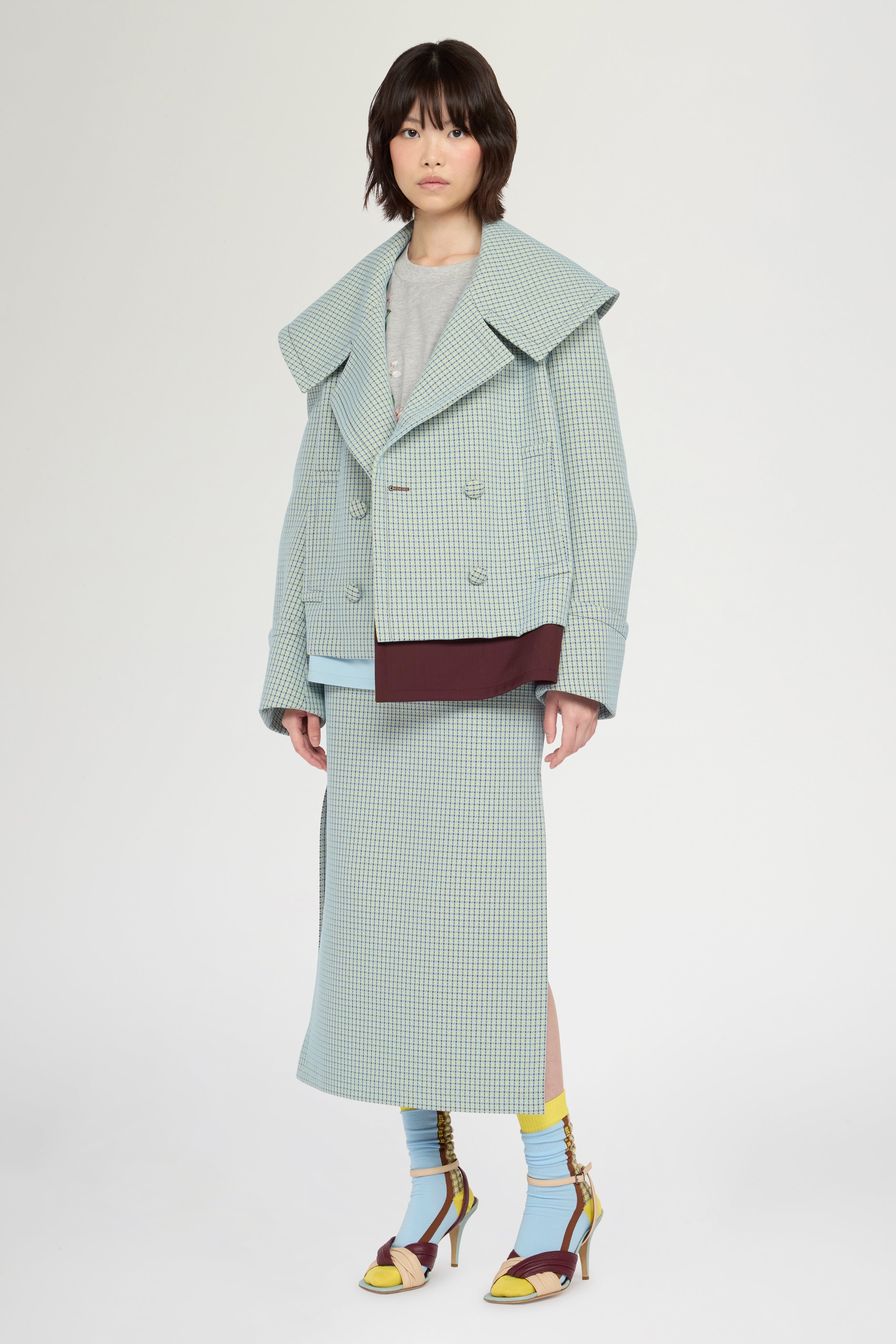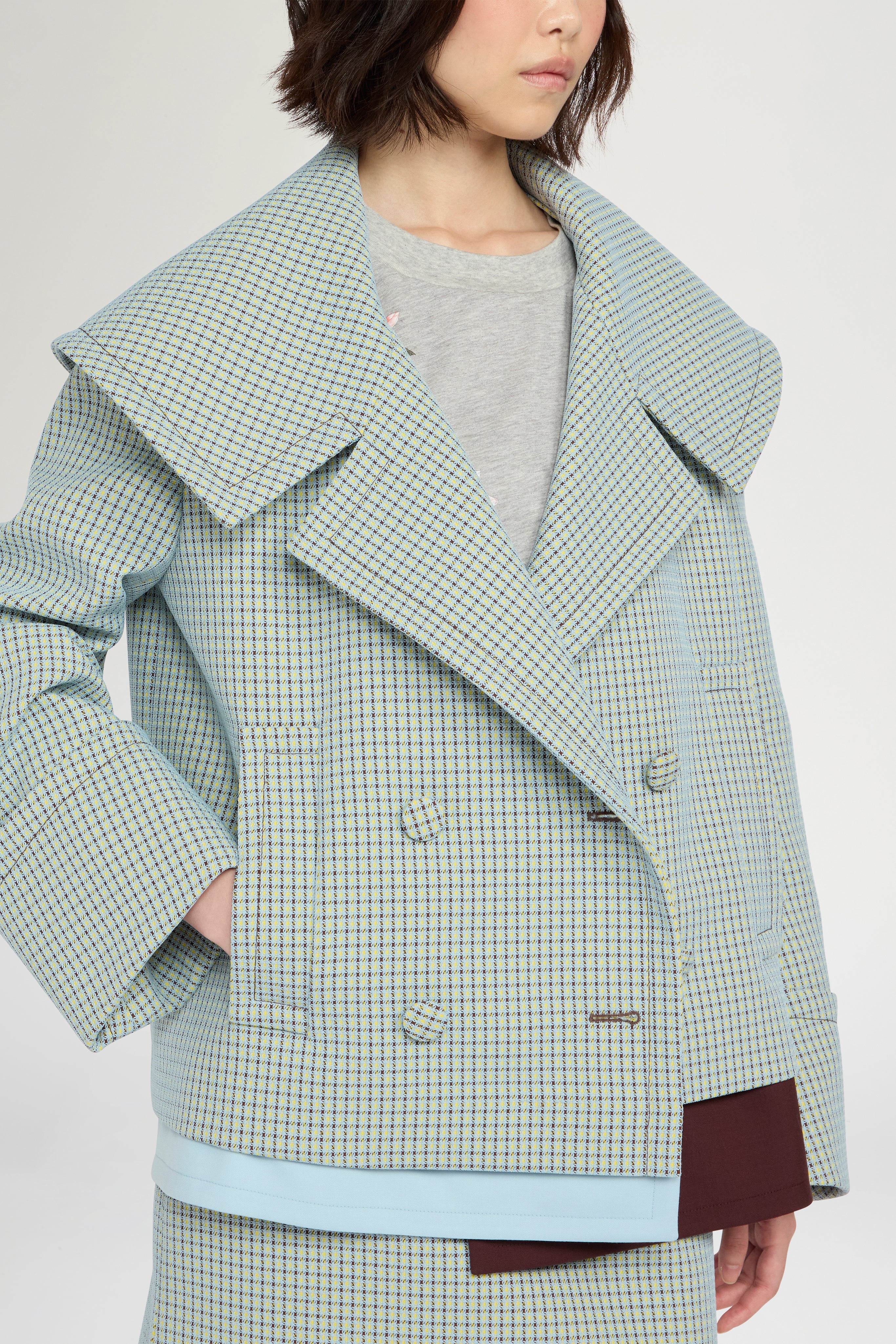 • Boxy double-breasted coat with a straight, wide silhouette and hip-length cut. Crafted from a precious jacquard fabric featuring a tridimensional micro-check pattern, inspired by the interplay of light and small architectural windows. The design is enriched with a structured oversized collar, patch pockets and cuff inserts, while contrasting fabric panels at the hem create a deconstructed, layered effect with added depth. The compact hand of the fabric enhances the clean, defined construction of the piece.