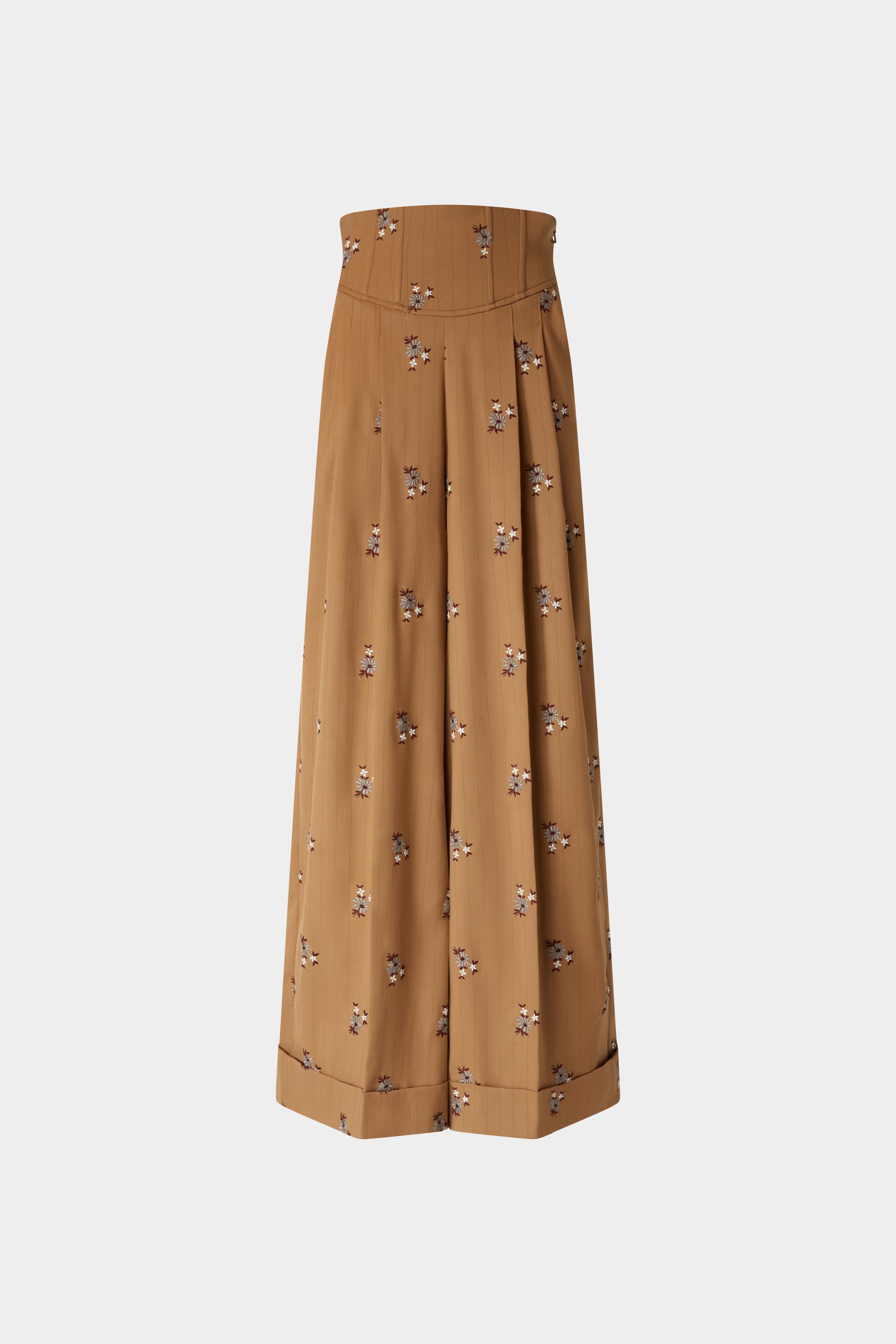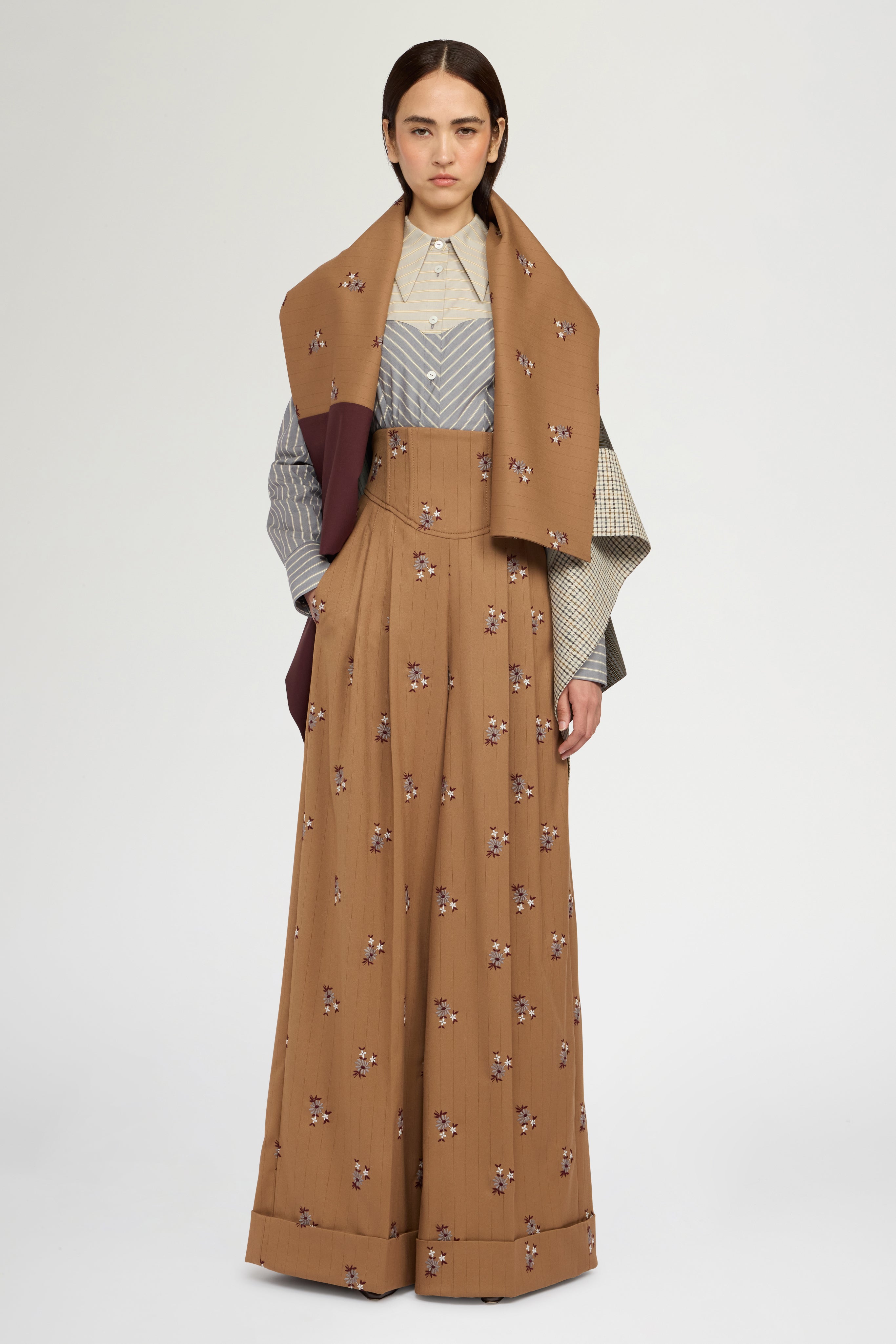 Wide-leg trousers with a corset-inspired high waist, merging classic menswear tailoring with a feminine silhouette. Slim fit at the waist and hips, opening into a fluid palazzo leg with double pleats and pressed front crease. Structured waistband recalls corsetry, balanced by an oversized cuffed hem. A fluid dialogue between masculine and feminine codes.