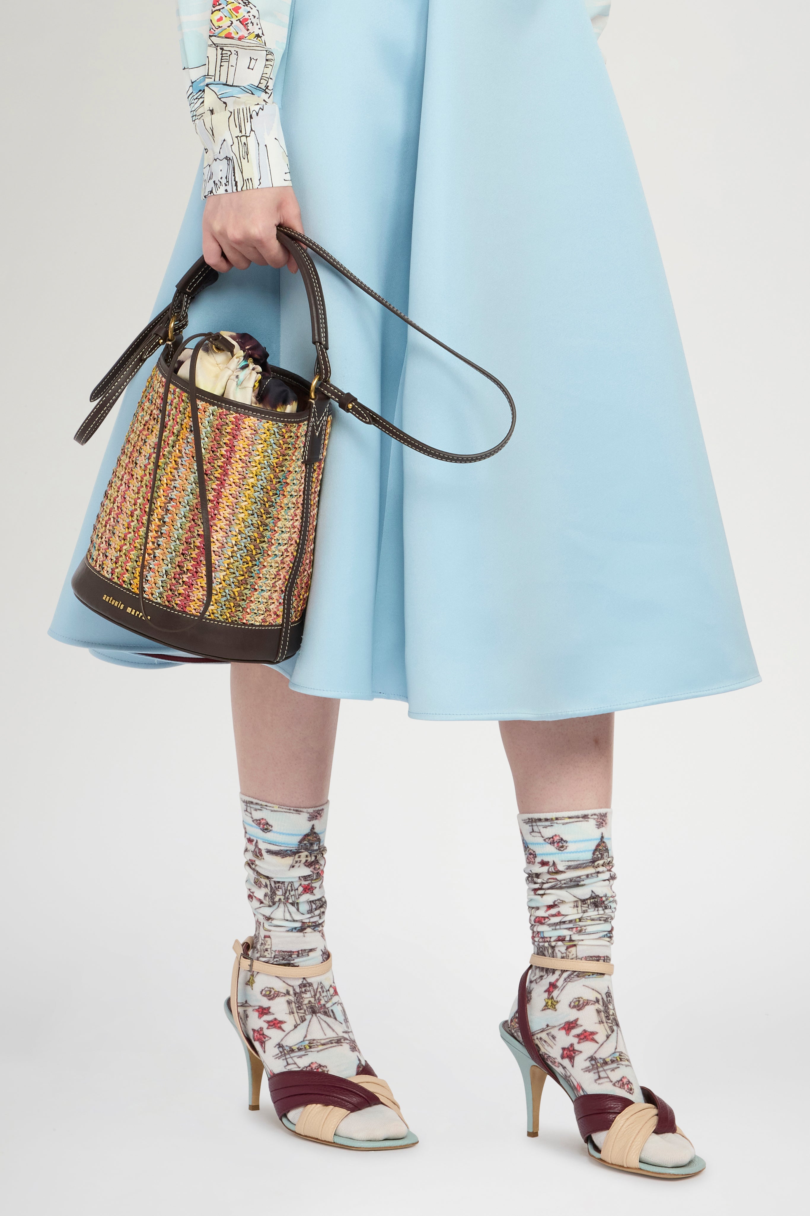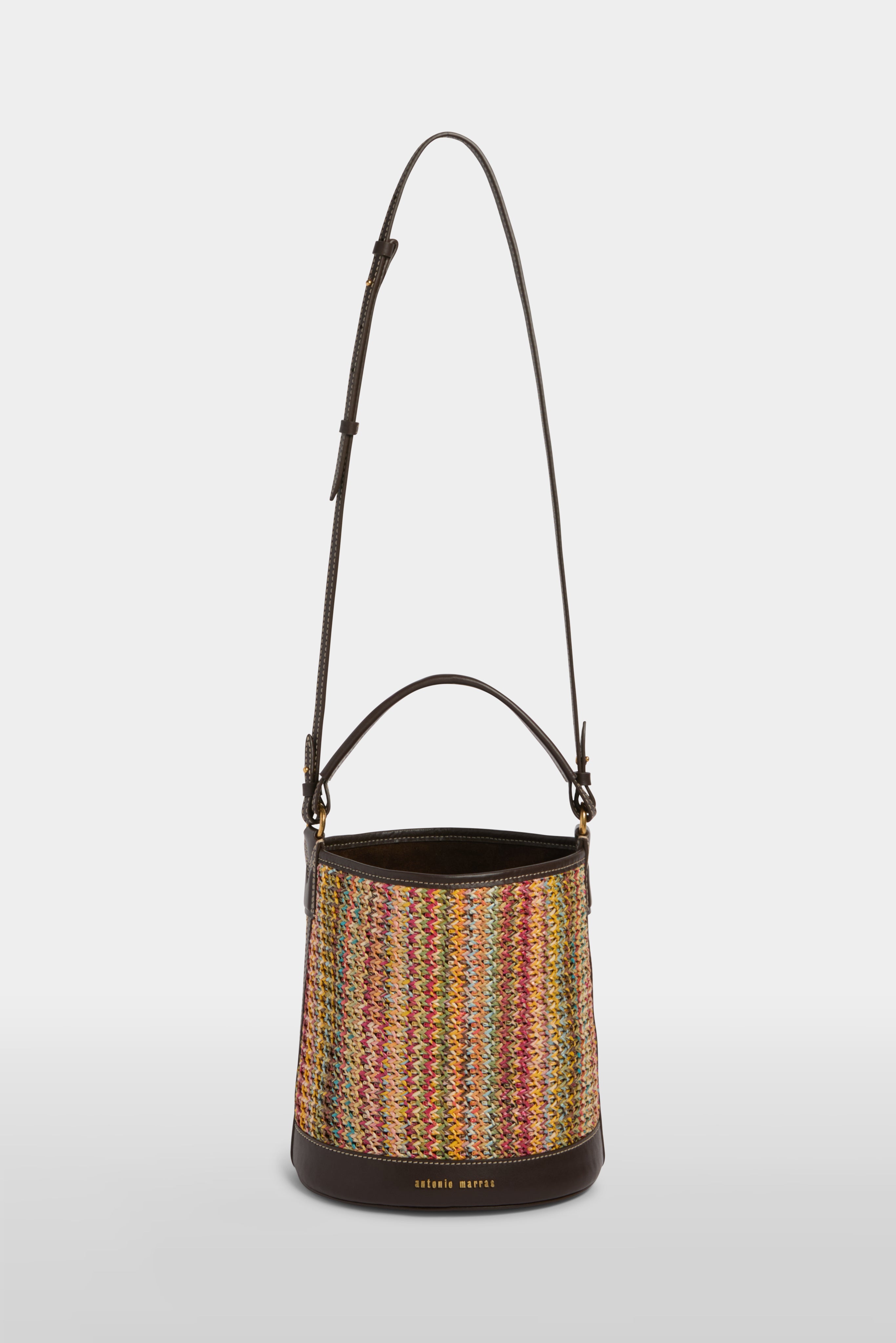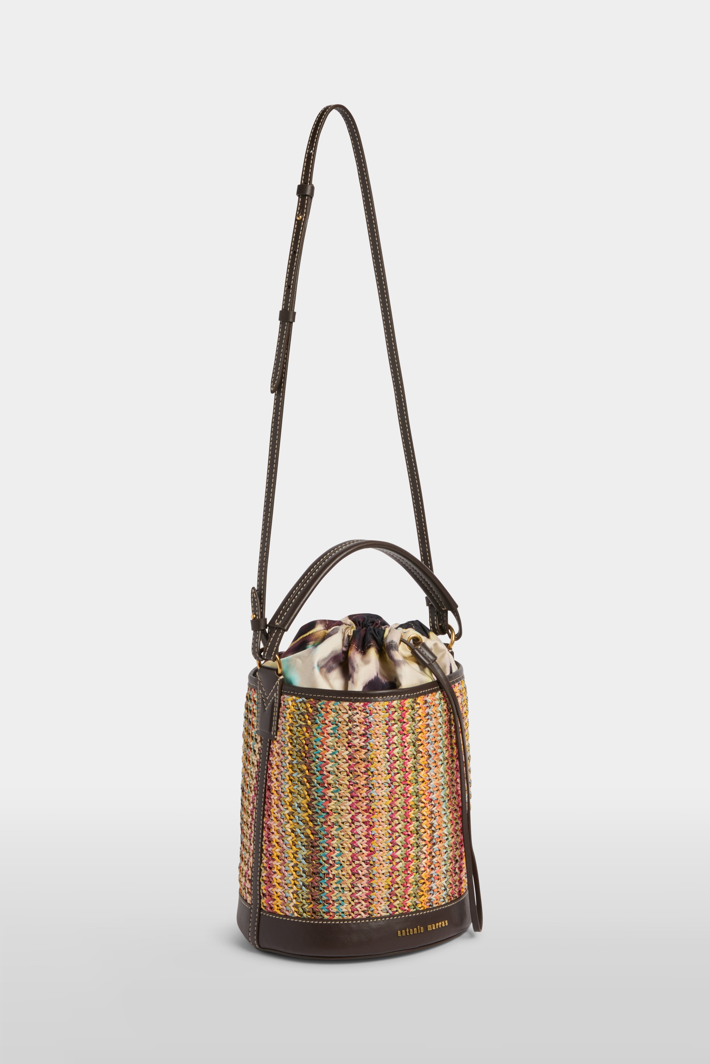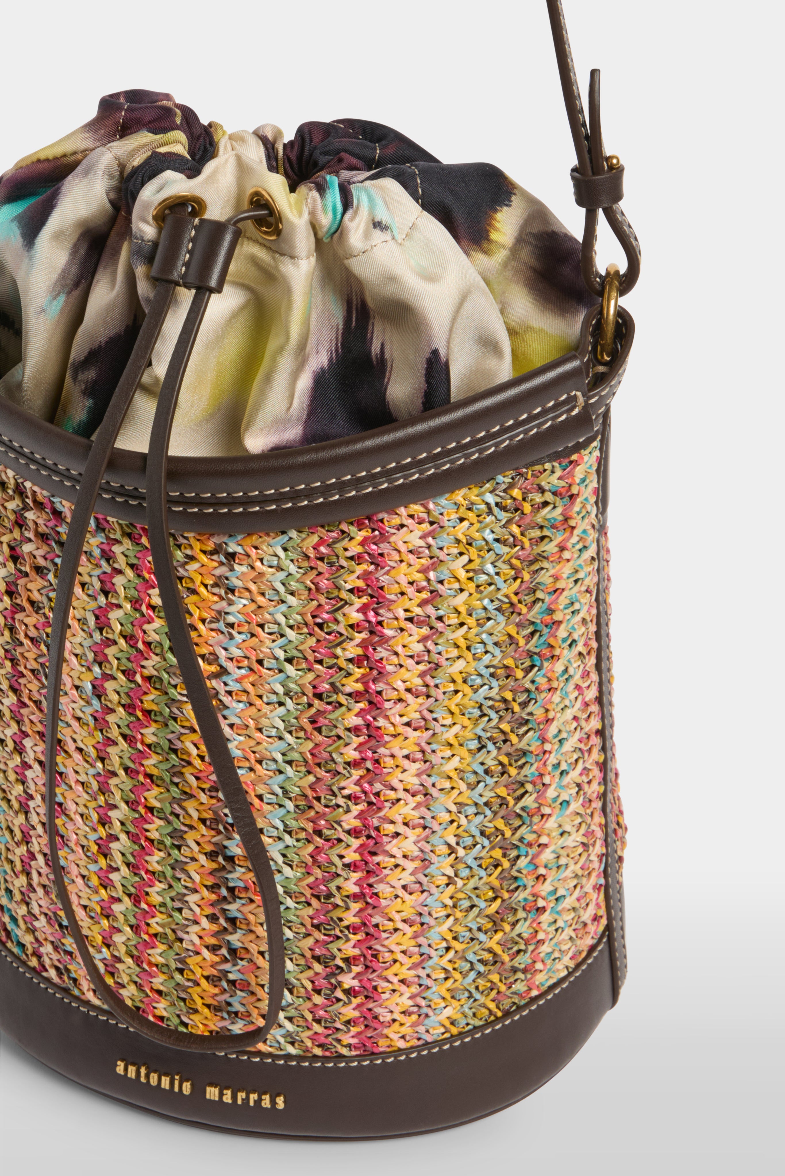 Raffia bucket bag with leather details, featuring a soft structure with a circular base. Includes a removable silk drawstring pouch, also wearable as a clutch, and a suede-lined bucket interior. Finished with an adjustable shoulder strap for shoulder or crossbody wear and a metal logo.