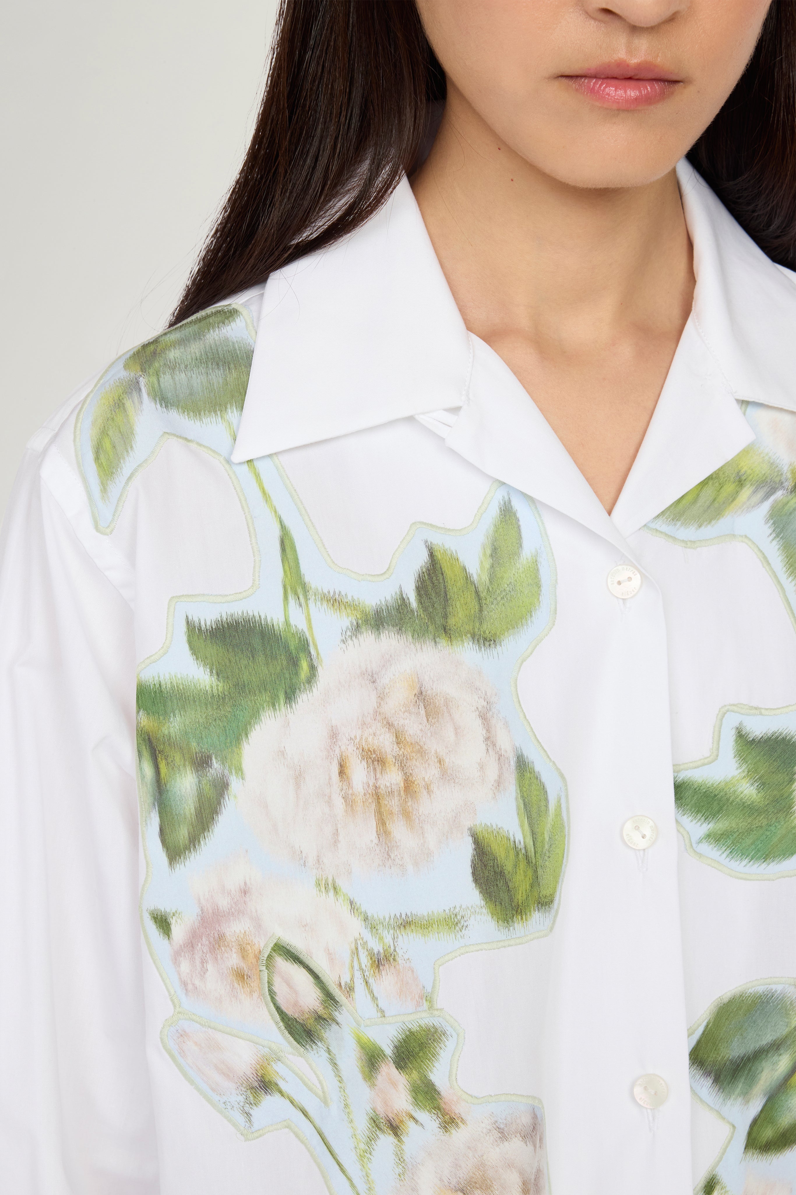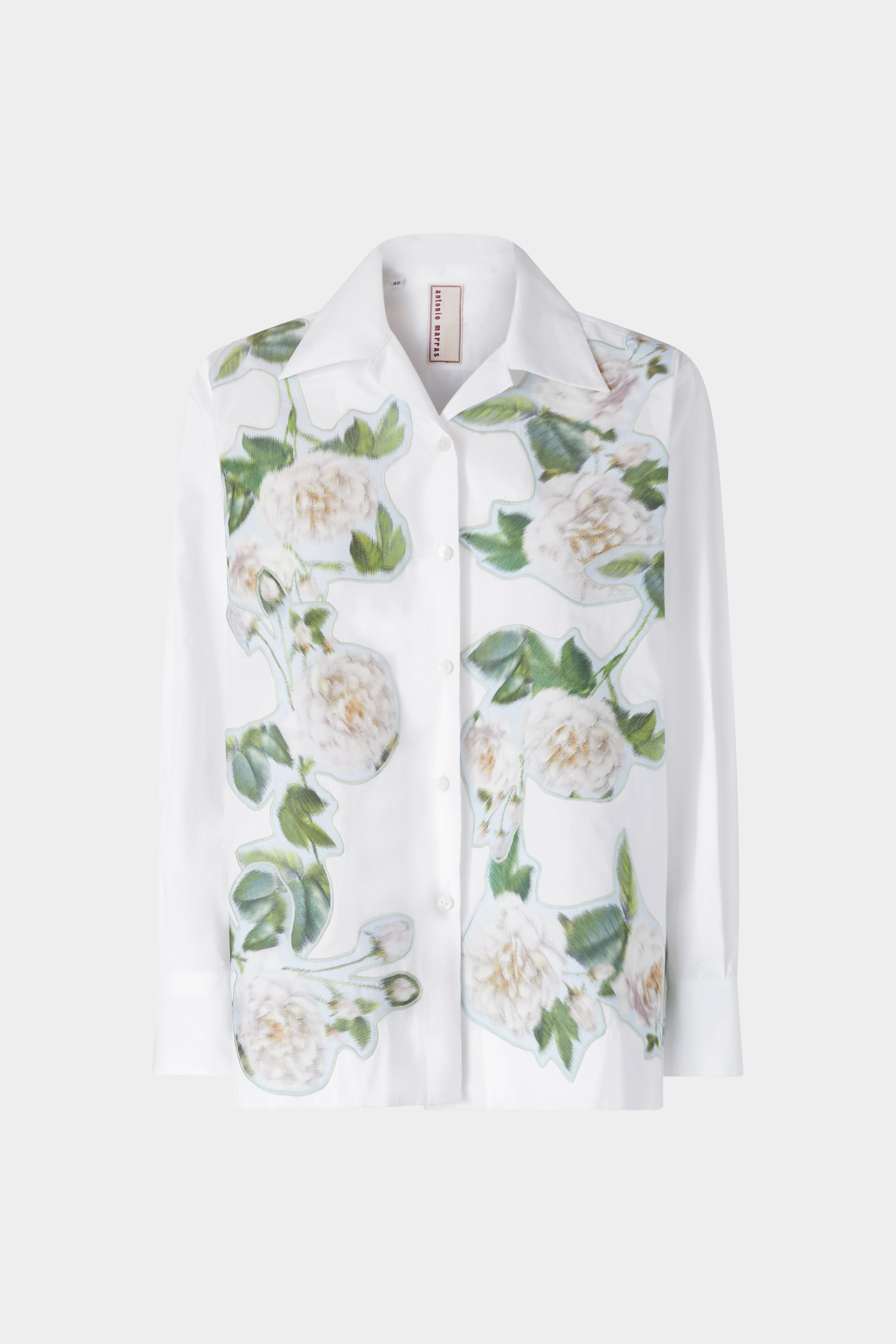 • White Robespierre-style shirt featuring a clean, structured silhouette. The front is decorated with chiné floral print patches arranged in a classic à ramage composition, creating a refined contrast between the crisp base and the soft, blurred floral motifs. Minimal on the back, the design highlights the interplay between tailoring and decorative detail for a distinctive yet balanced look.