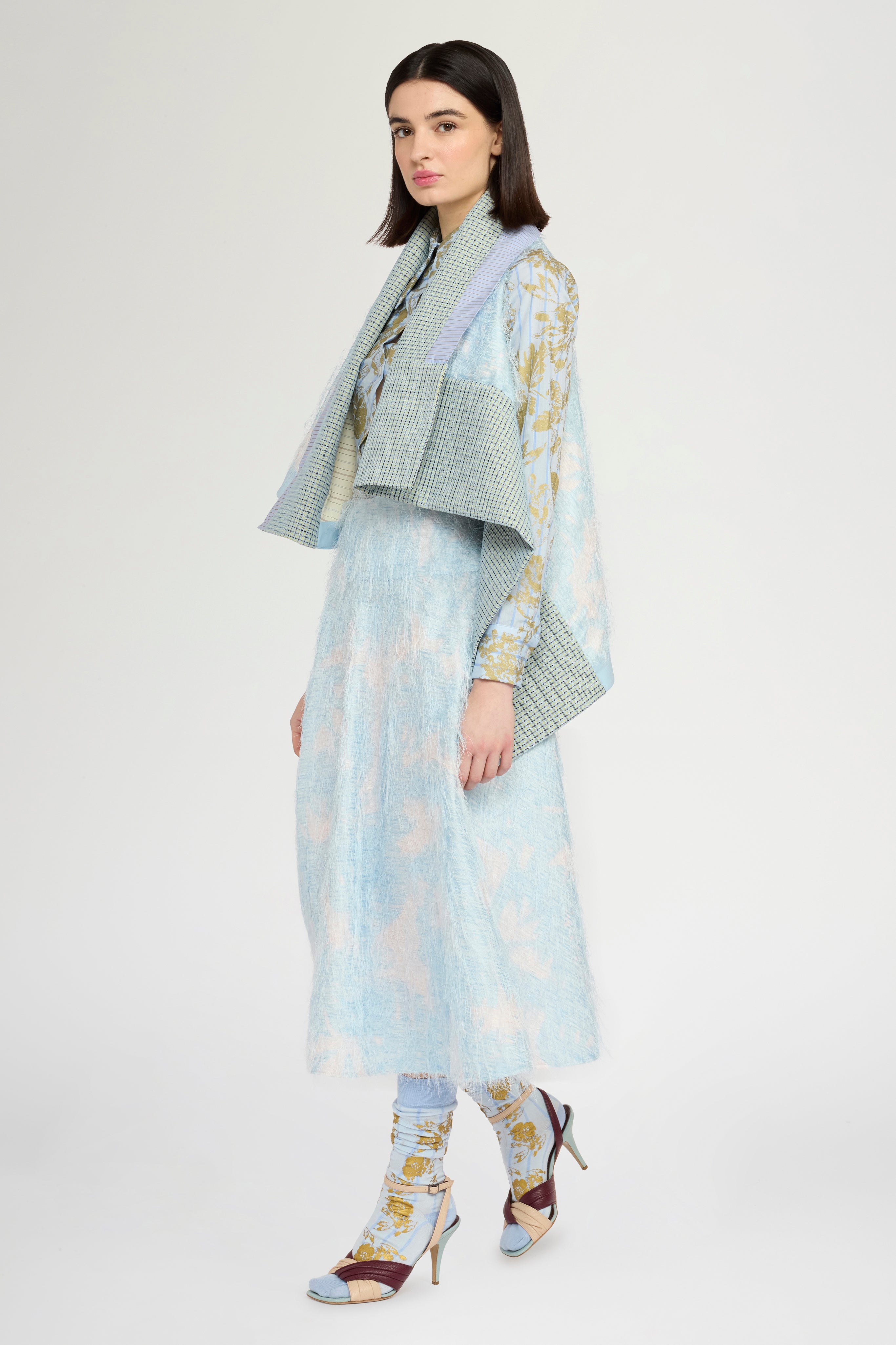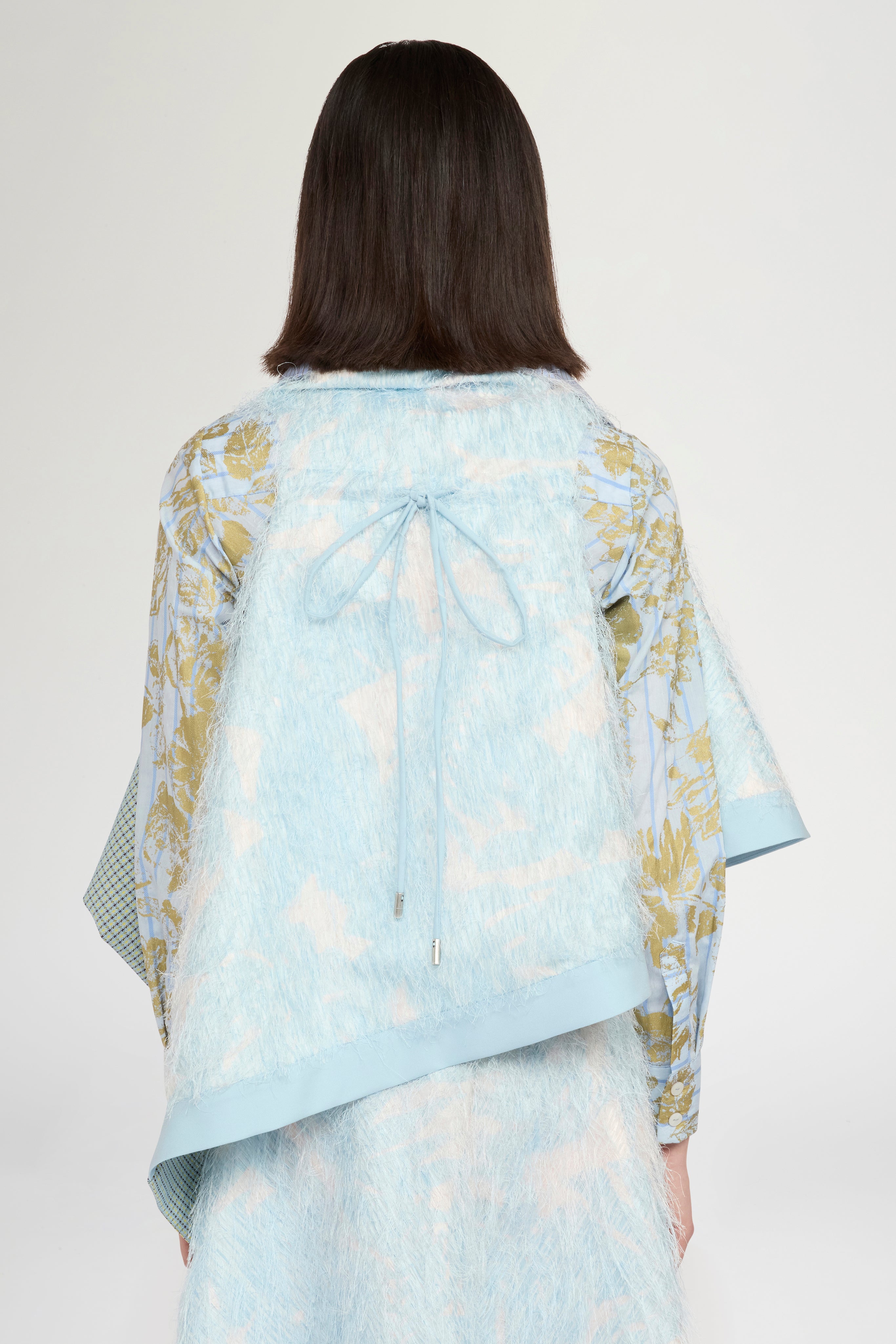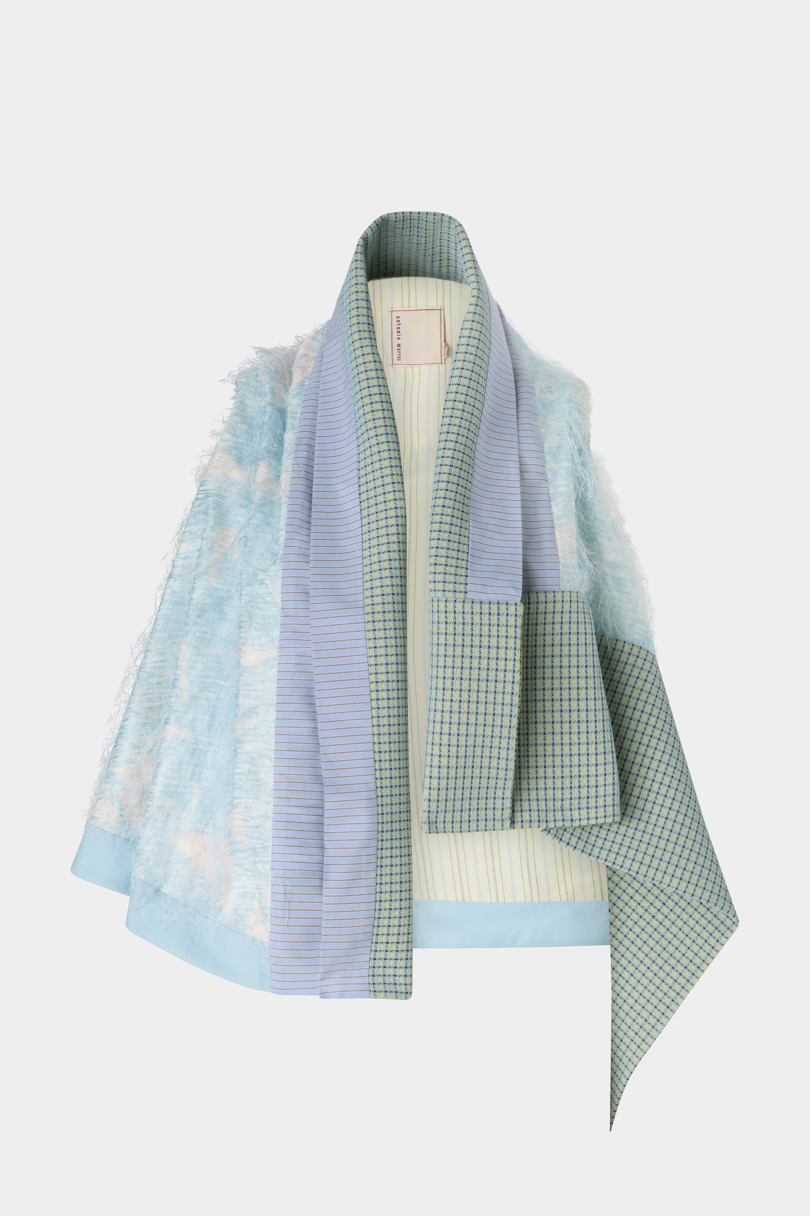 • Round-cut gavoi featuring a circular hemline that creates a naturally asymmetrical effect when worn. The design plays with contrasting materials: a feather-effect fil coupé base with abstract cloud print, inspired by the softness of ostrich feathers. Finished with a striped cotton inner collar, a micro-check outer collar and left hem insert, and a sky-blue wool panel on the right side of the hem. A sculptural, layered accessory that combines texture, movement and refined craftsmanship.