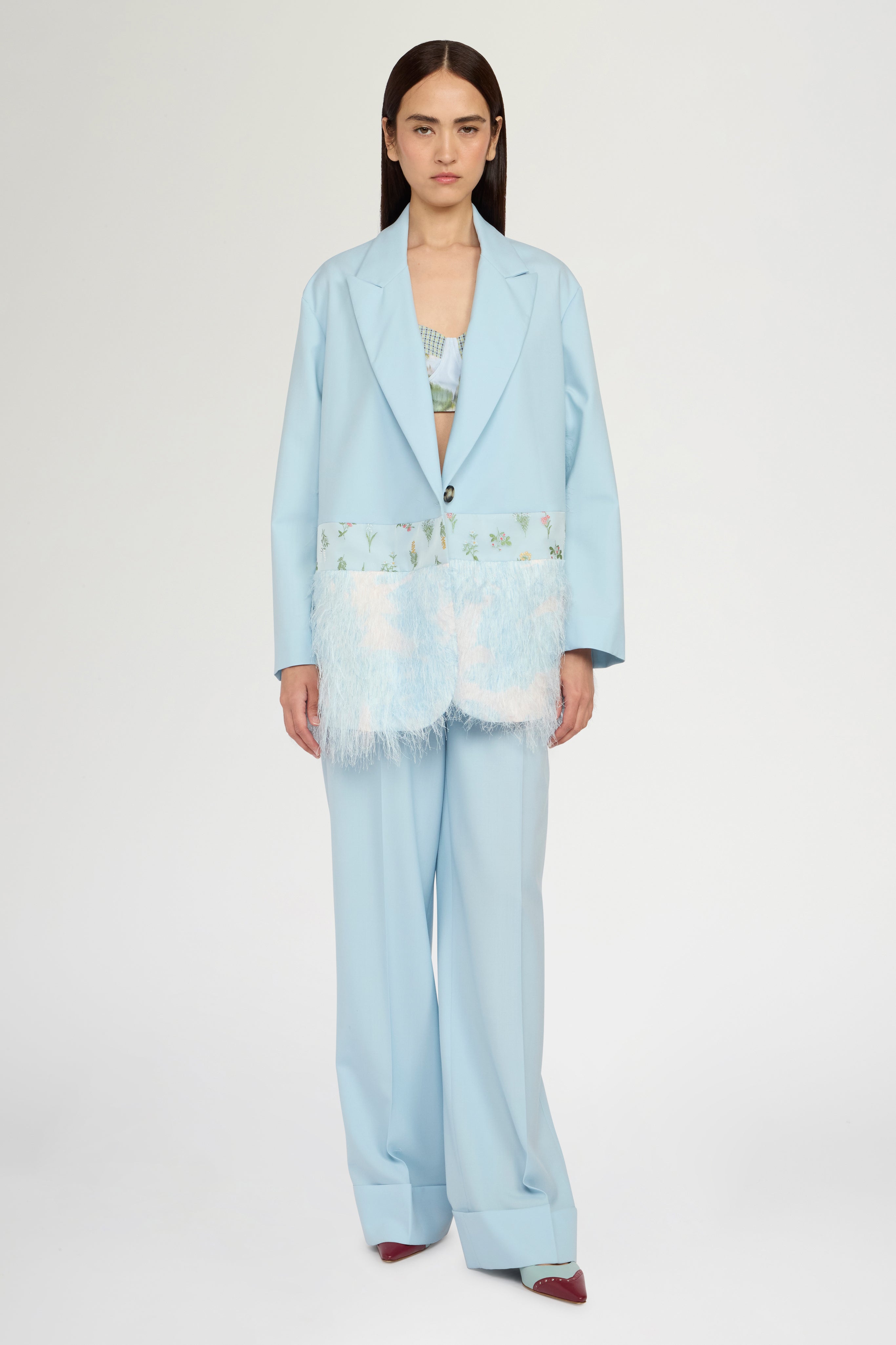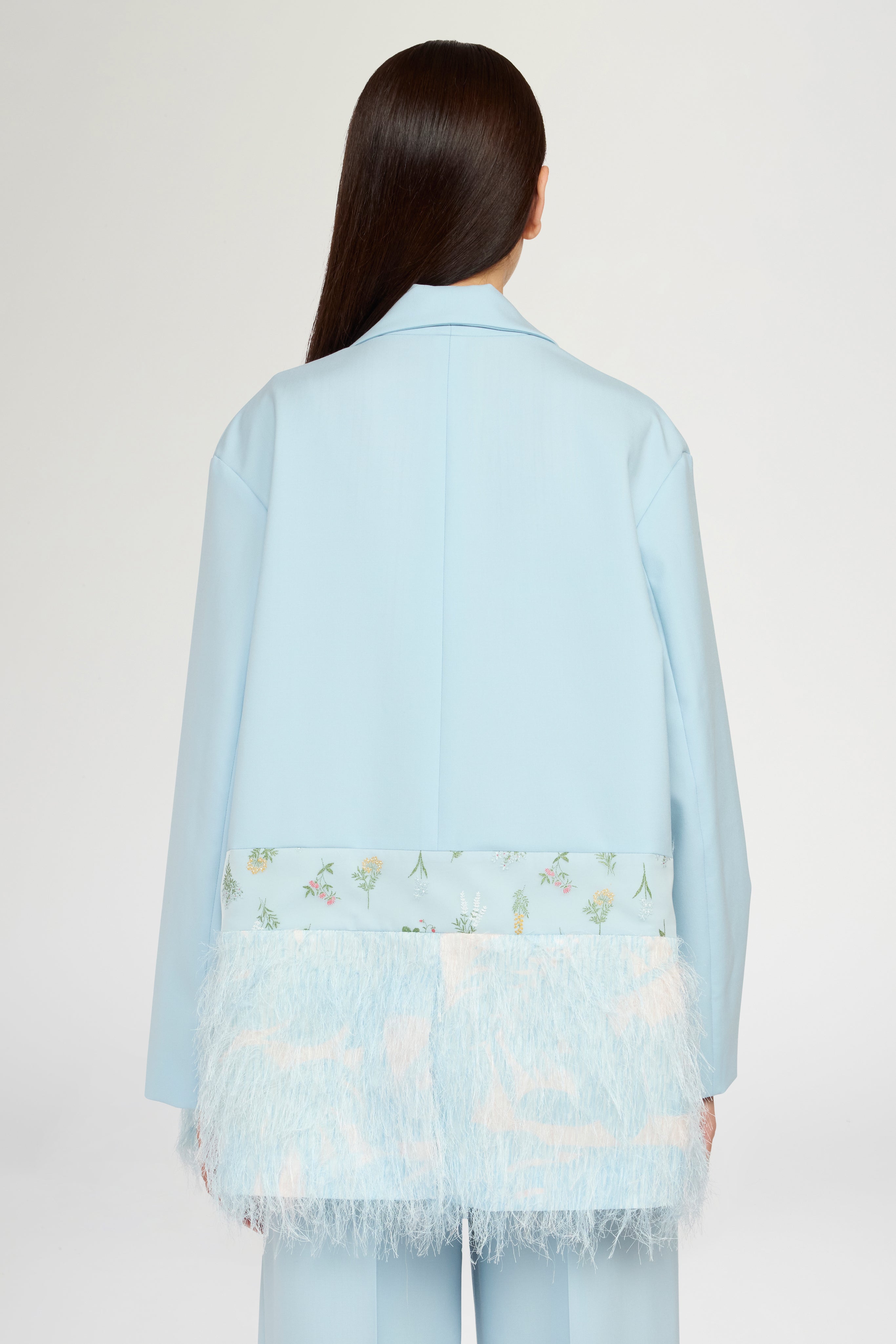 Single-breasted blazer in light blue duchesse with a soft fit, low lapels, and single-button closure. Featuring a central waist insert in micro-floral printed organza and a lower section in abstract cloud-print fil coupé with an ostrich-feather–effect texture. Regular fit and length.