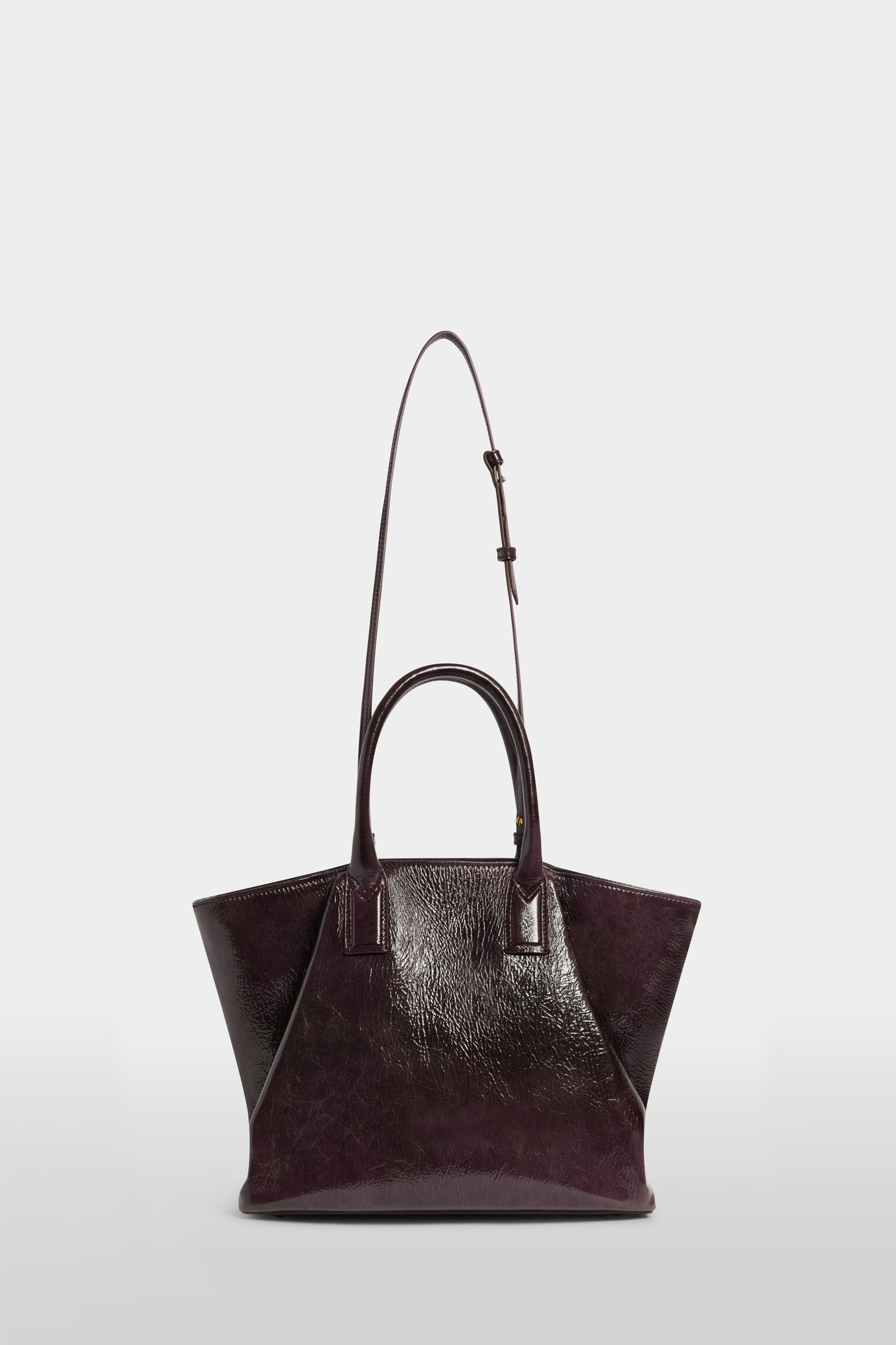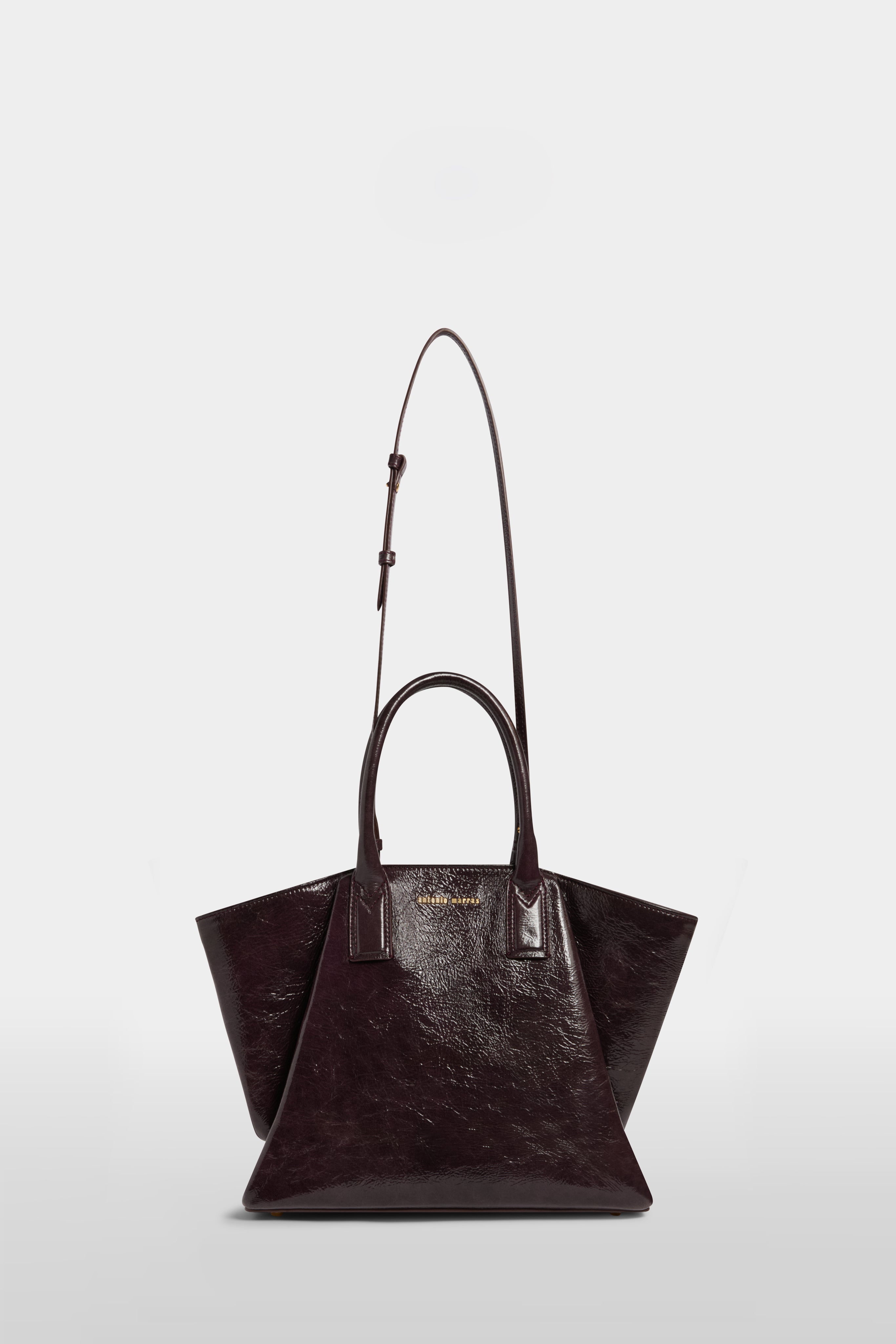 The Alma Bag Medium, iconic and sophisticated, crafted from 100% patent calfskin. It features a deconstructed trapeze silhouette enriched with soft folds that create a play of volumes, revealing a unique and sculptural character. The handles end in the unmistakable Marras “M” detail, a signature symbol of the Maison, paired with aged-gold lettering. A designer accessory, created for those who love to carry a piece of authentic, timeless style.