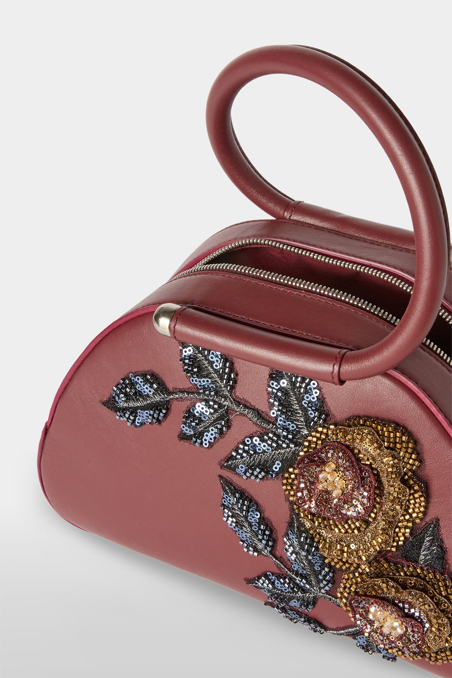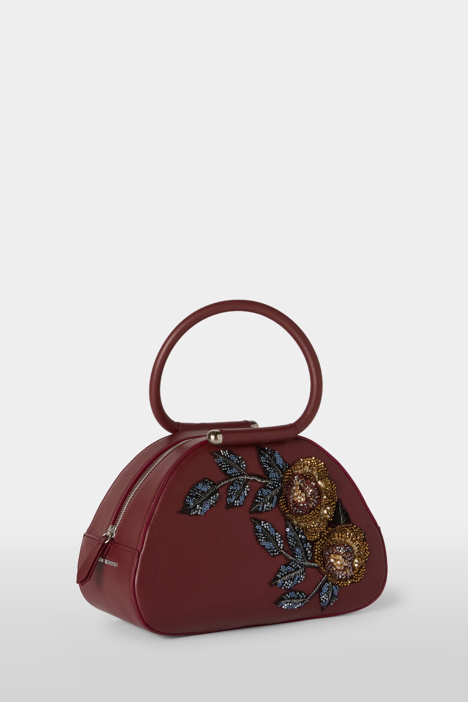 Caragol Bag crafted from full-grain burgundy nappa leather and decorated by floral embroidery. Entirely Made in Italy, it is the result of an artisanal process that combines careful construction with precise execution. The Caragol Bag features a compact, organic shape with soft lines and a balanced construction between volume and lightness, making it immediately recognizable. Top closure with metal zip and Antonio Marras logo applied on the front.