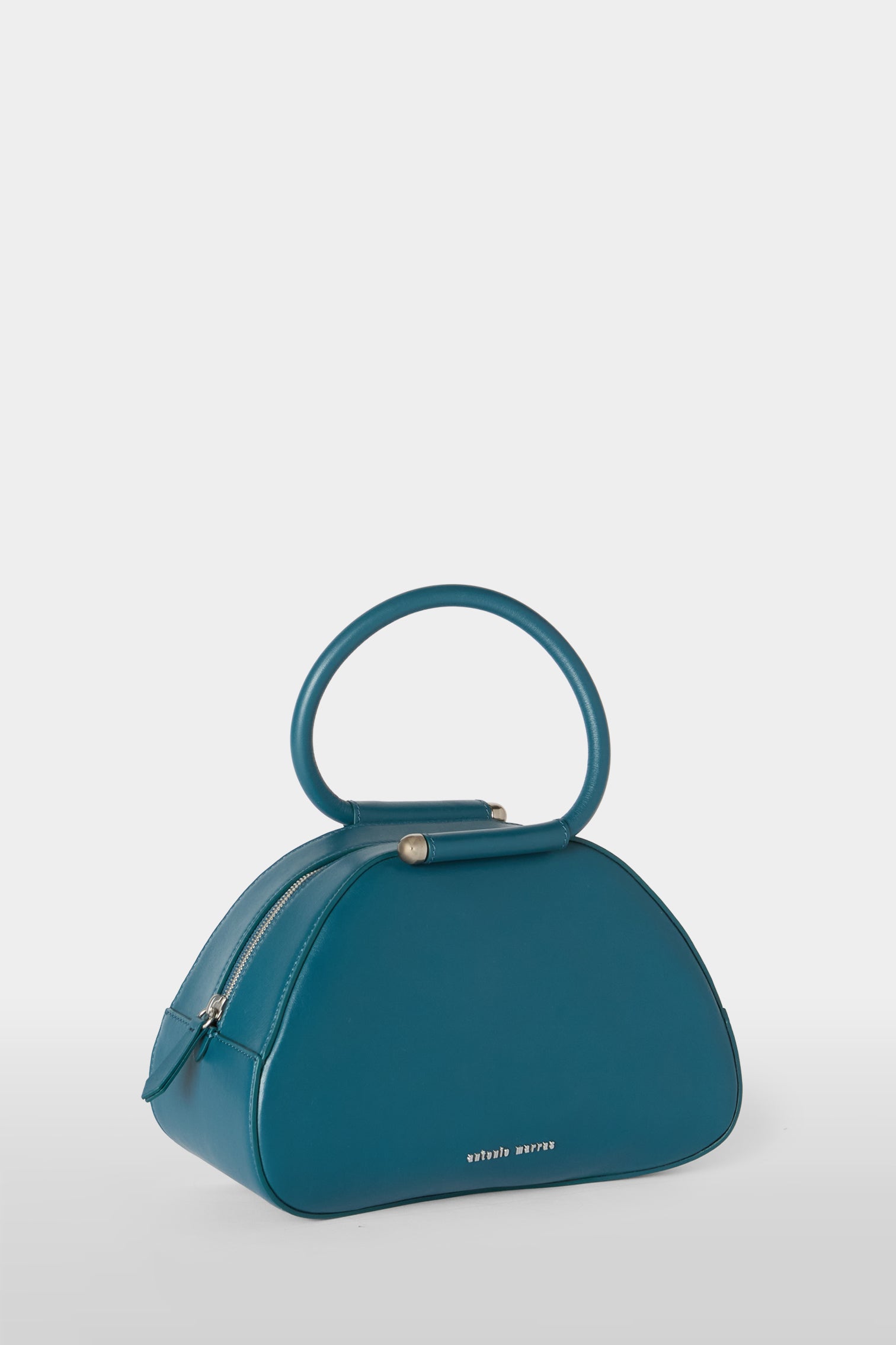 The Caragol Bag features a compact, organic shape with soft lines and a balanced construction between volume and lightness, making it immediately recognizable. It is crafted from full-grain teal nappa leather, selected for its natural grain and distinctive softness to the touch. Entirely Made in Italy, it is the result of an artisanal process that combines careful construction with precise execution. Top closure with metal zip and Antonio Marras logo applied on the front.