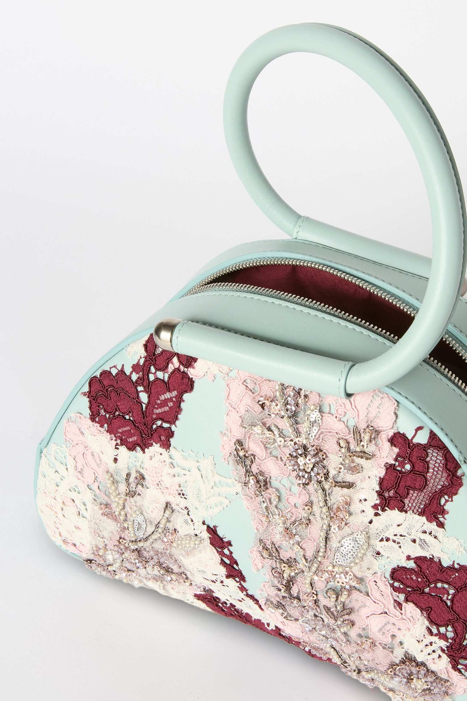 Caragol Bag crafted from full-grain turquoise nappa leather and decorated by floral embroidery. Entirely Made in Italy, it is the result of an artisanal process that combines careful construction with precise execution. The Caragol Bag features a compact, organic shape with soft lines and a balanced construction between volume and lightness, making it immediately recognizable. Top closure with metal zip and Antonio Marras logo applied on the front.