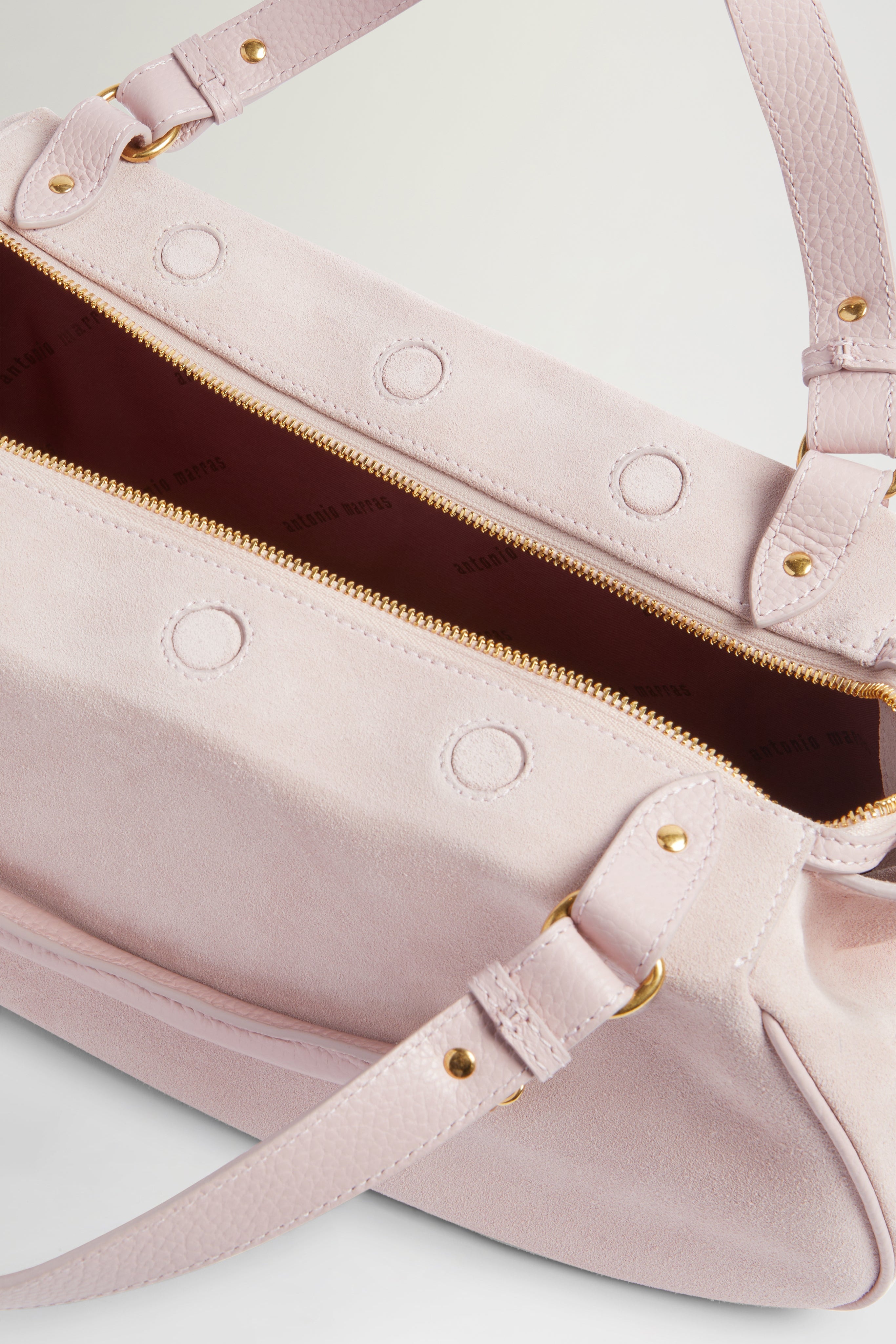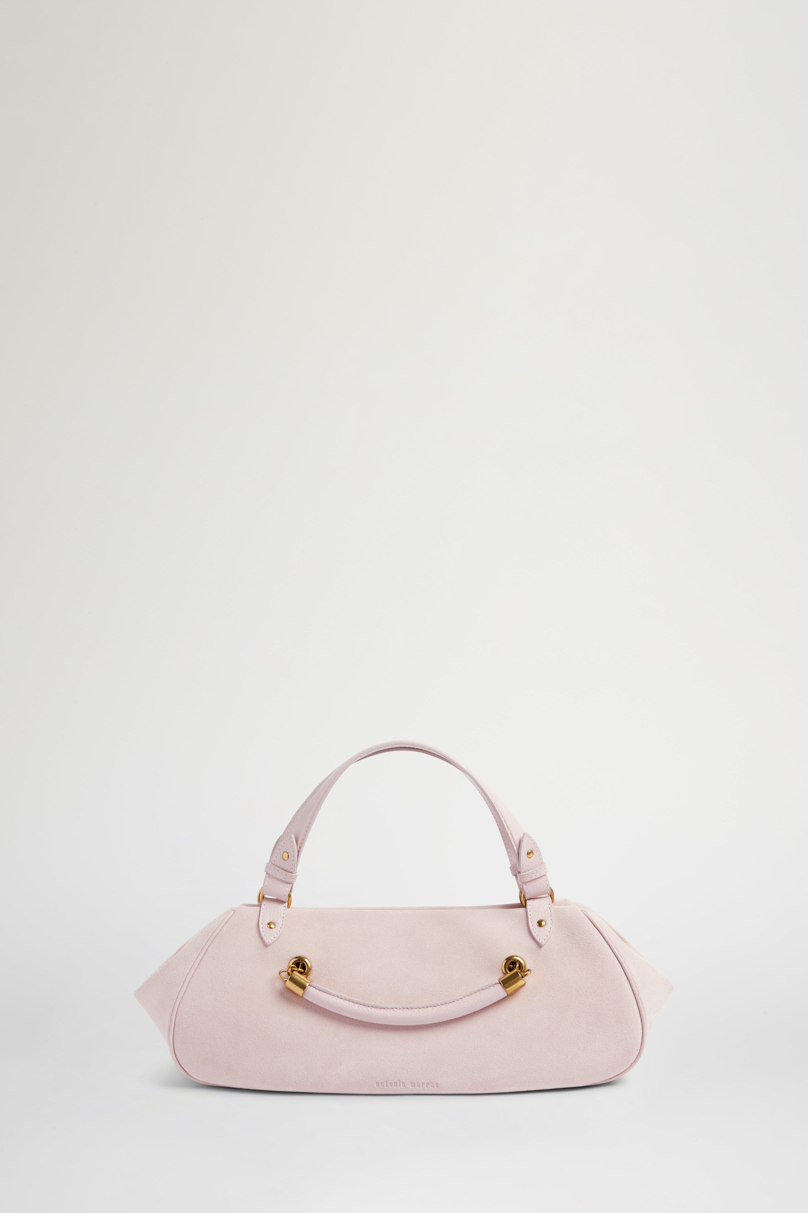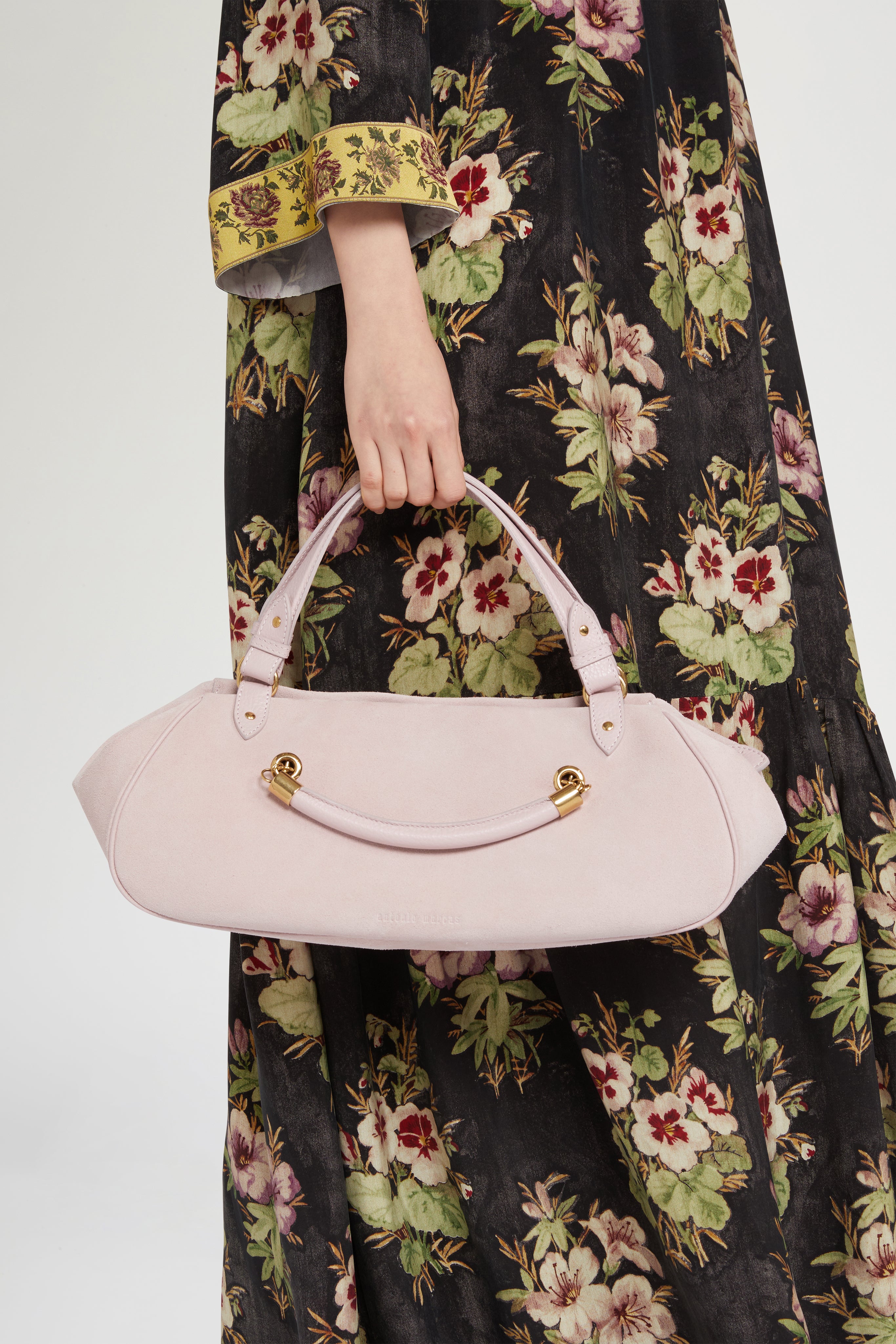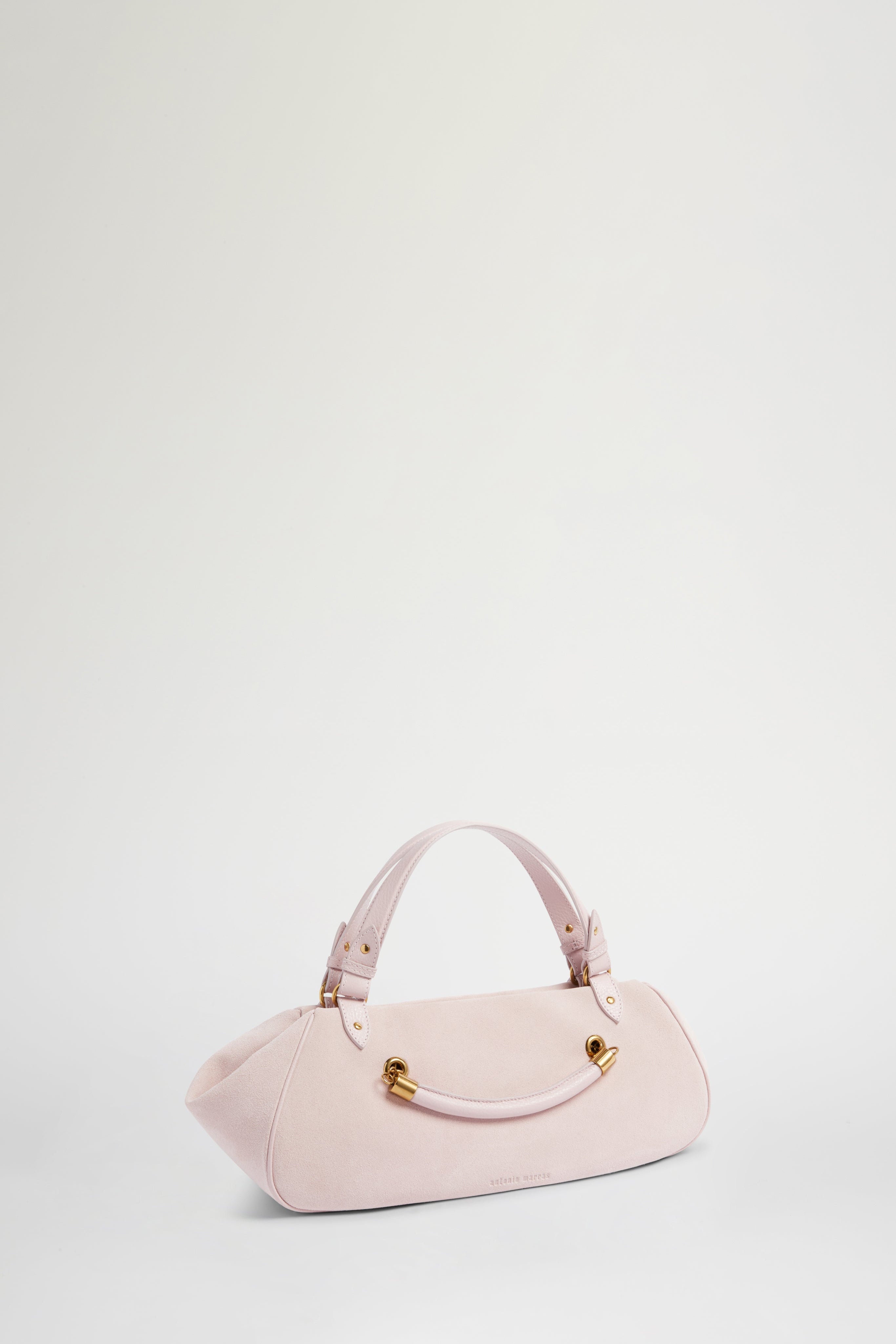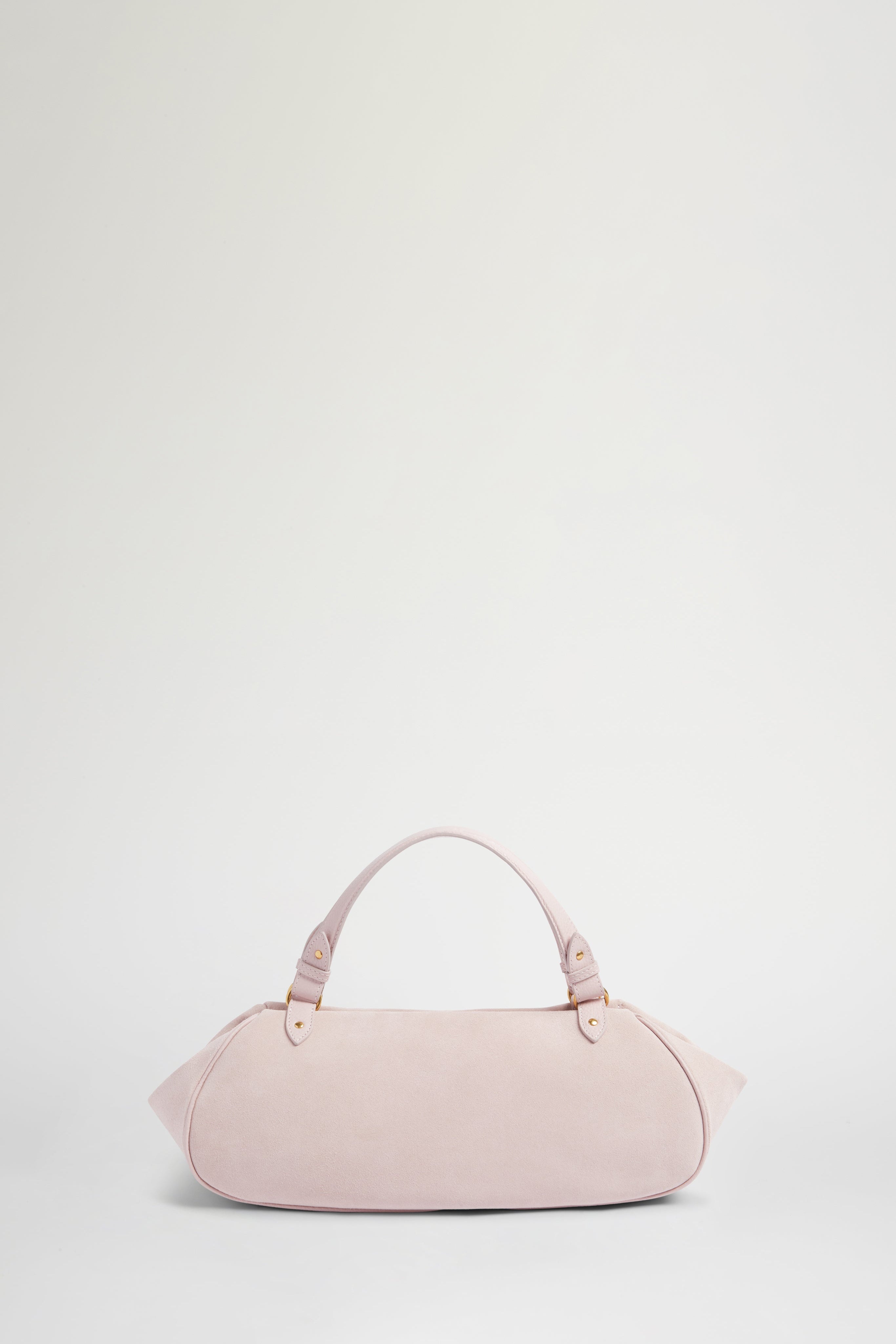 • Elegant bowling bag in lilac suede leather with gold hardware and curved silhouette.