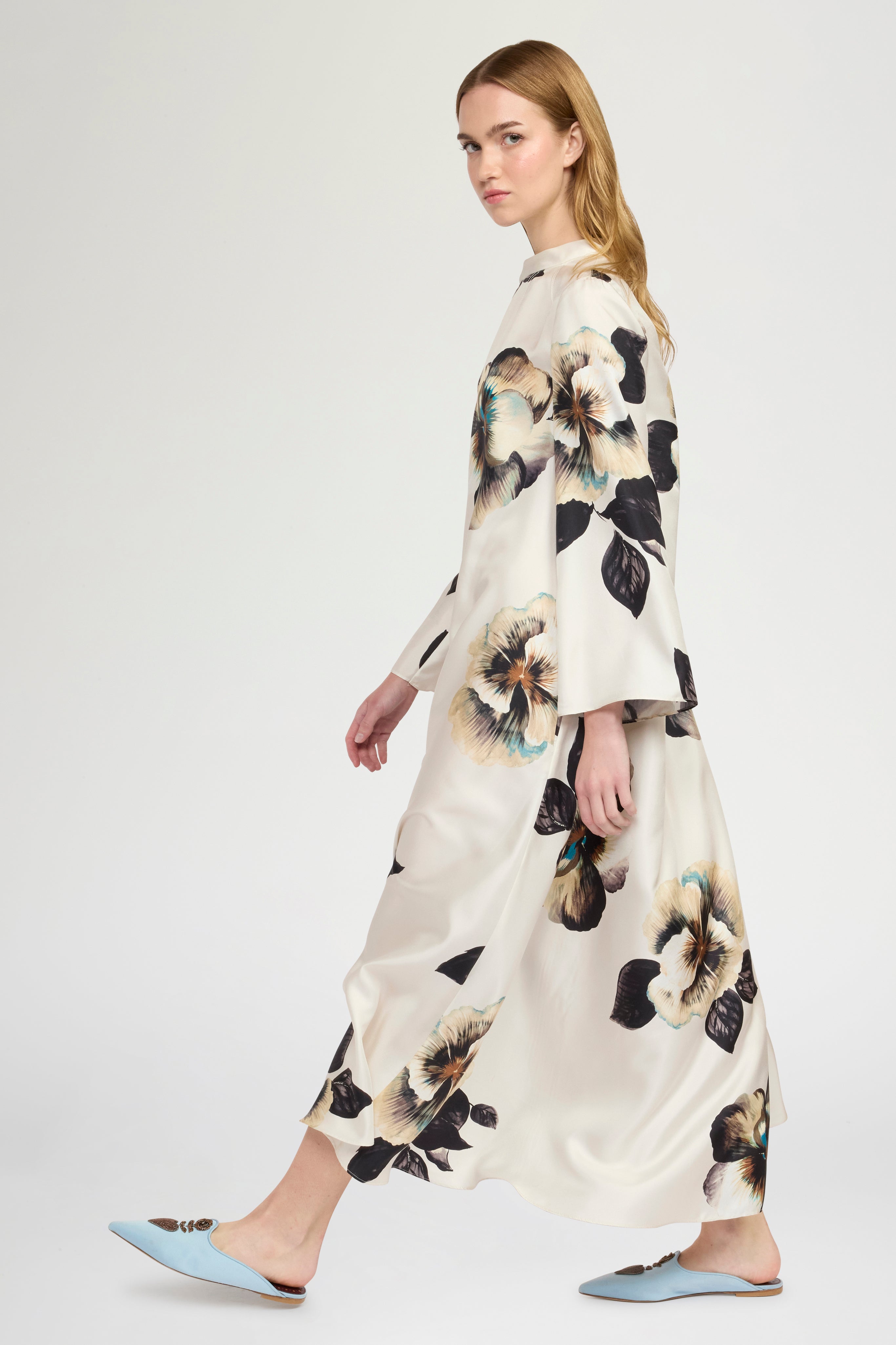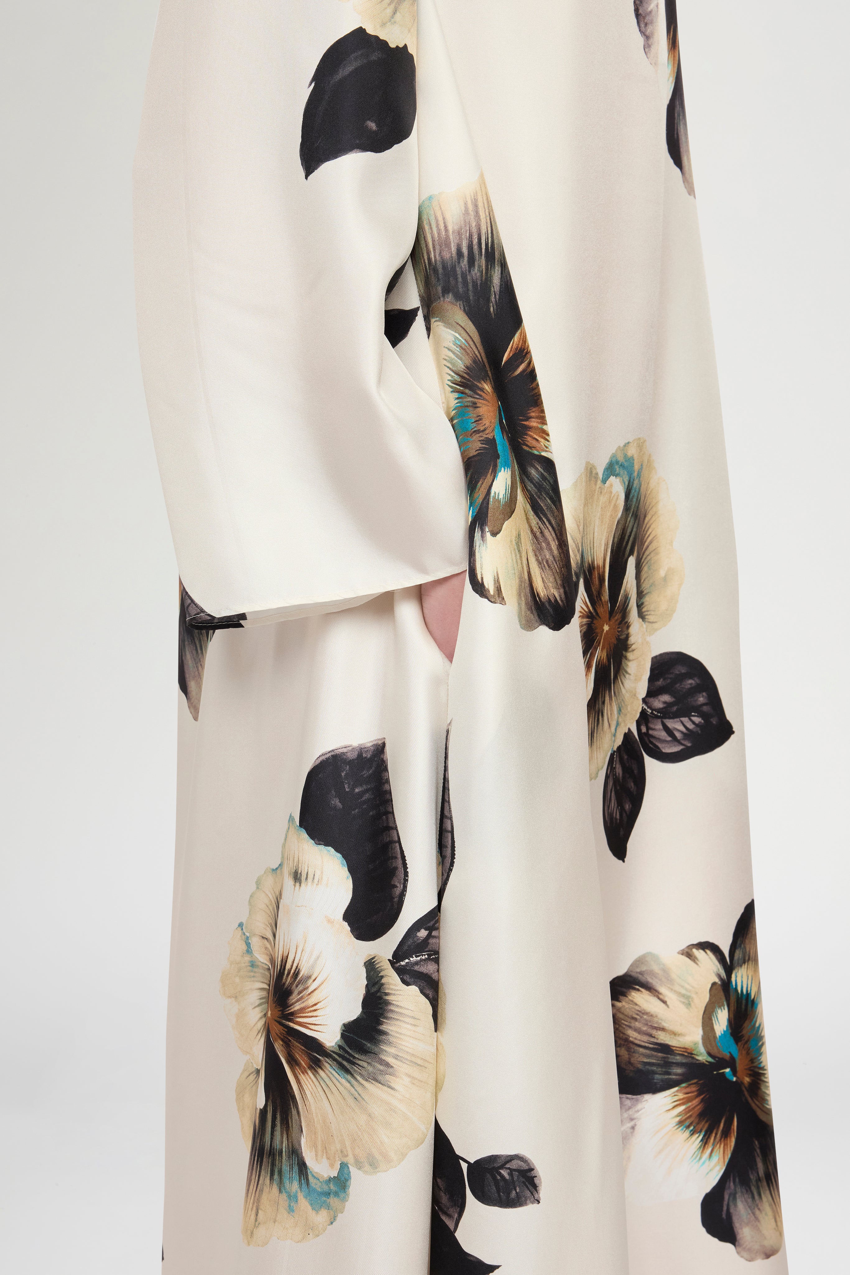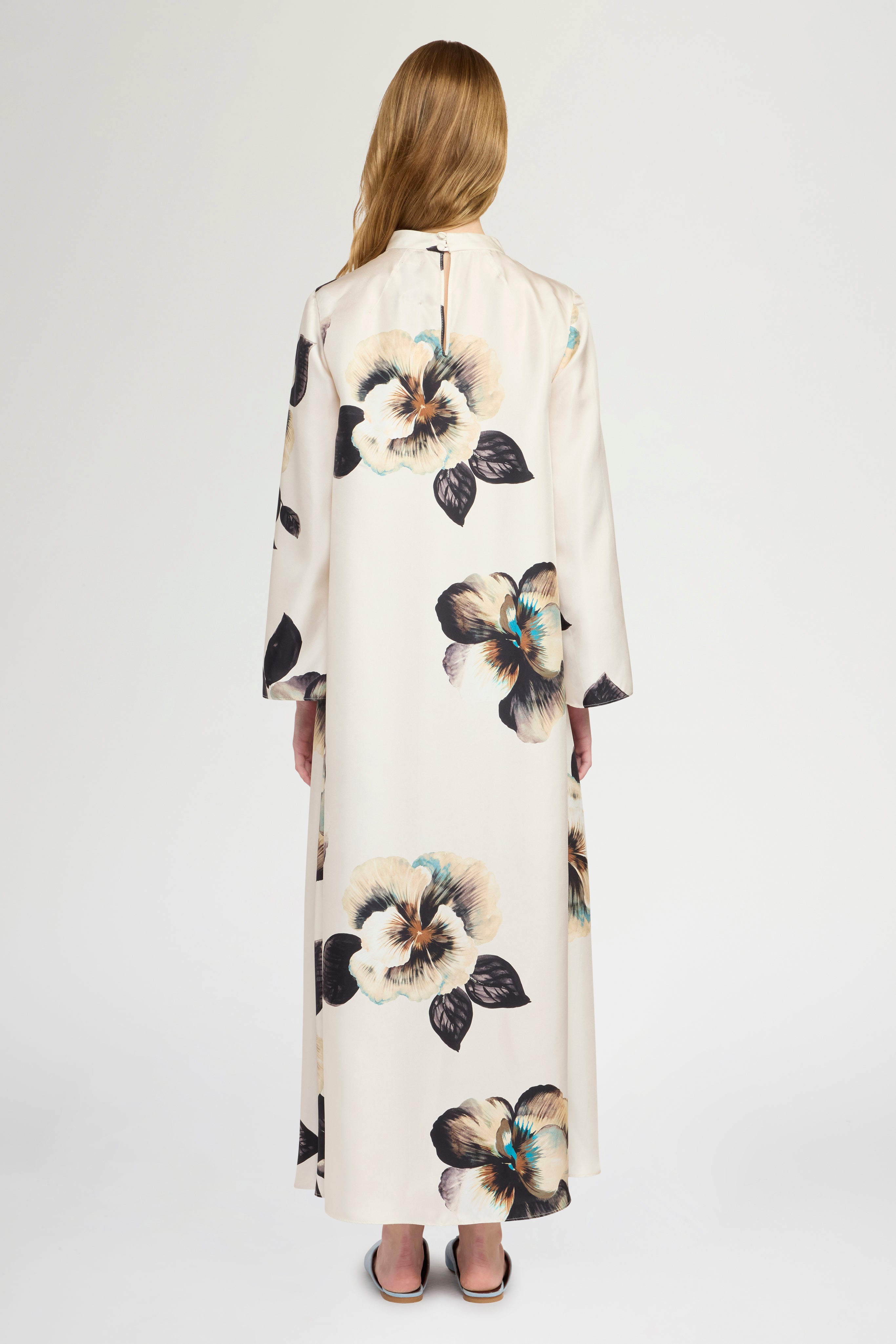 Long dress in 100% silk with a tunic-style construction. Sleeve with a slight gathering at the shoulder and a teardrop closure at the back. Wide, soft and flared silhouette, floor length. Made of printed silk twill with a maxi floral motif in nude and earthy tones, enriched with small aqua-green accents.