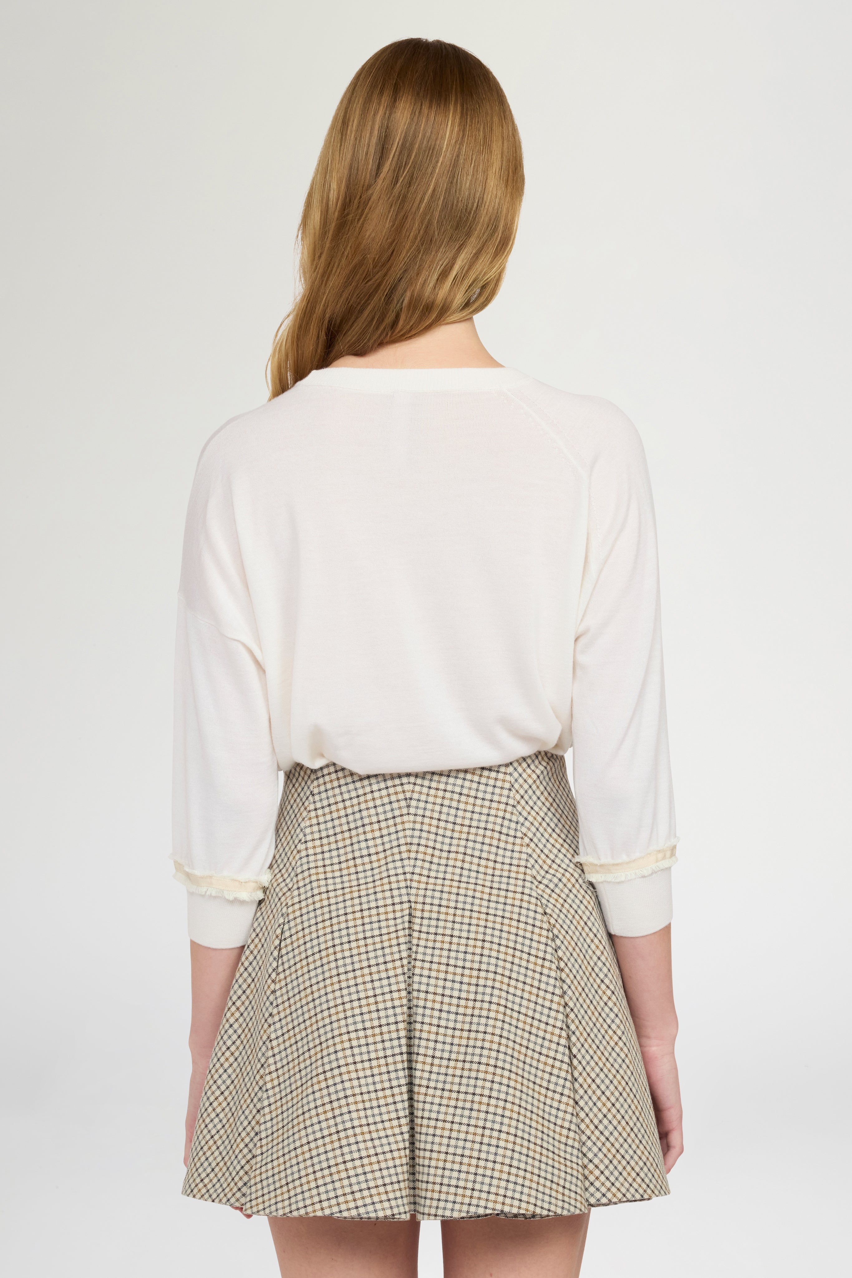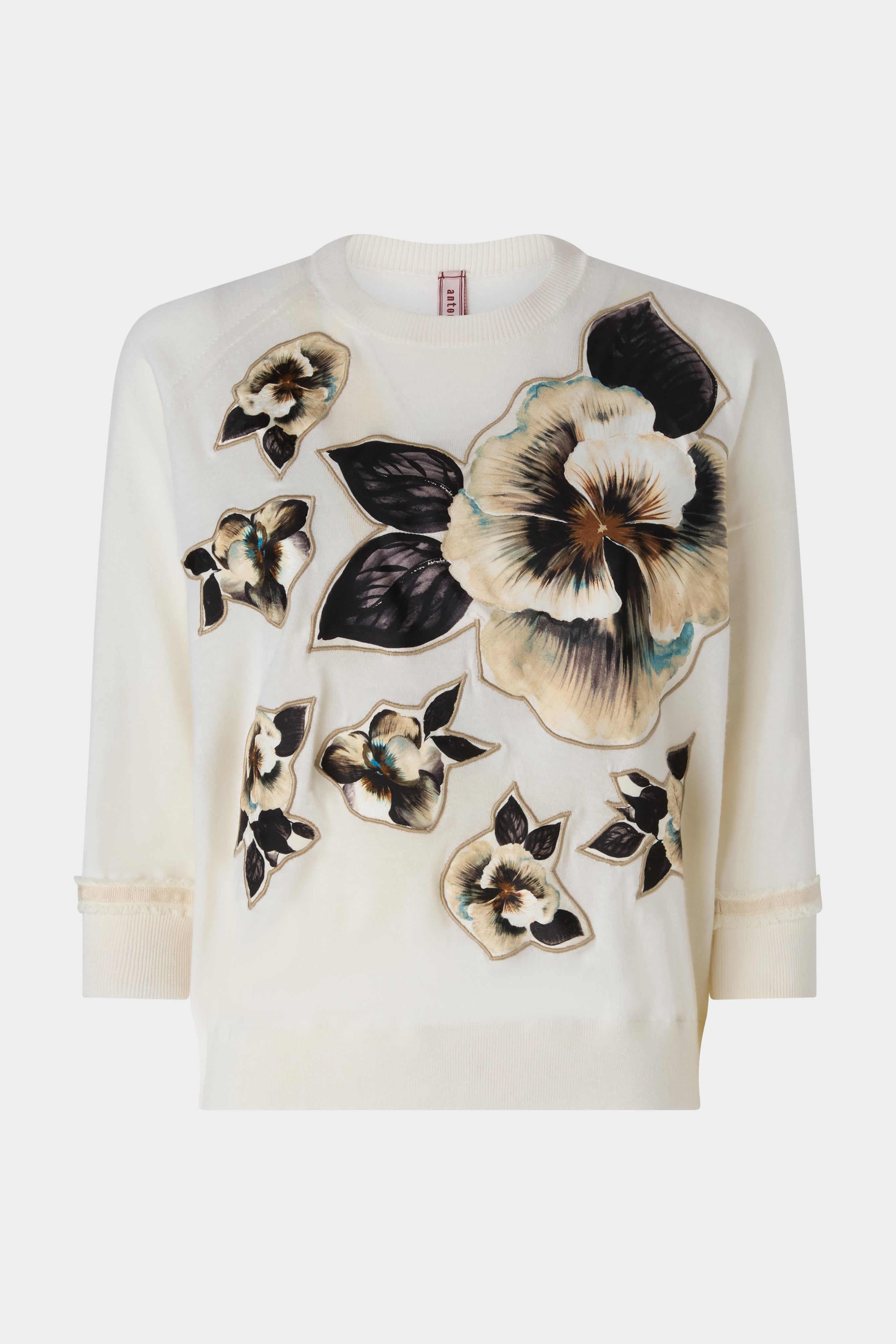 • Soft cashmere sweater with three-quarter sleeves, designed as a refined base for embroidered floral patches. The dominant bloom is positioned at heart level, creating a signature focal point. Frayed ecru grosgrain trim at the cuffs adds subtle textural contrast. Soft fit and regular length.
