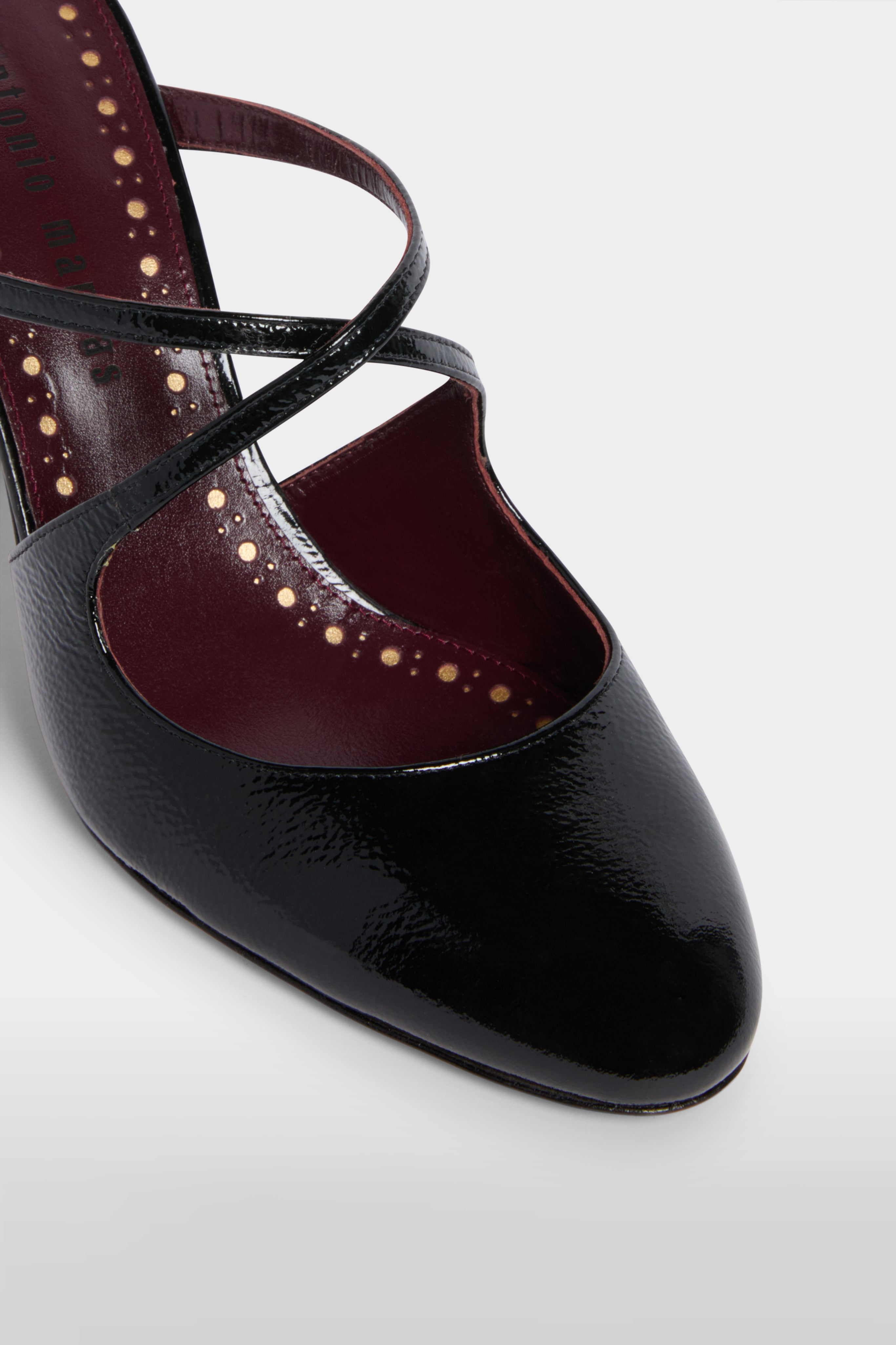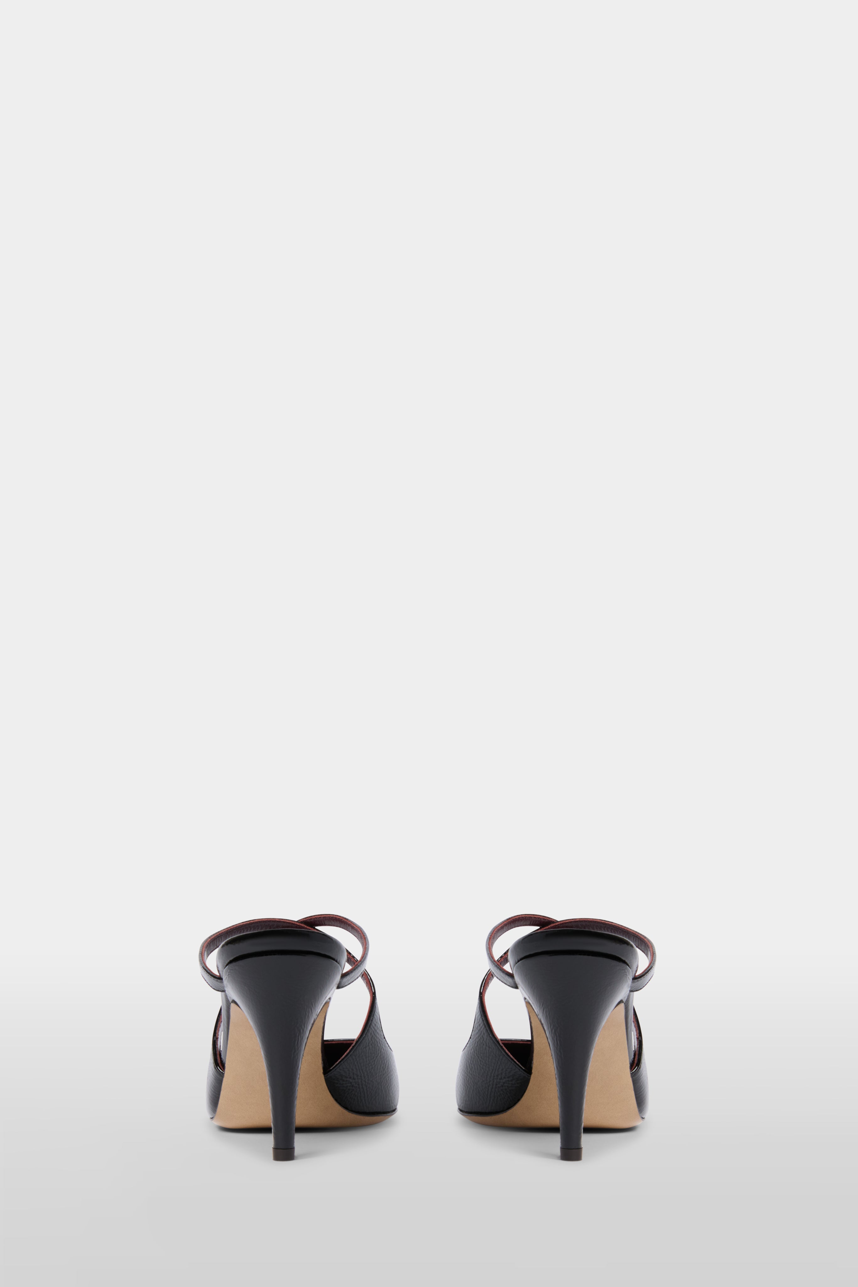 Black patent mules with a rounded toe and elegant cross-strap design. Mid-height stiletto heel and sleek, glossy finish. A refined, versatile style for effortless day-to-night looks.