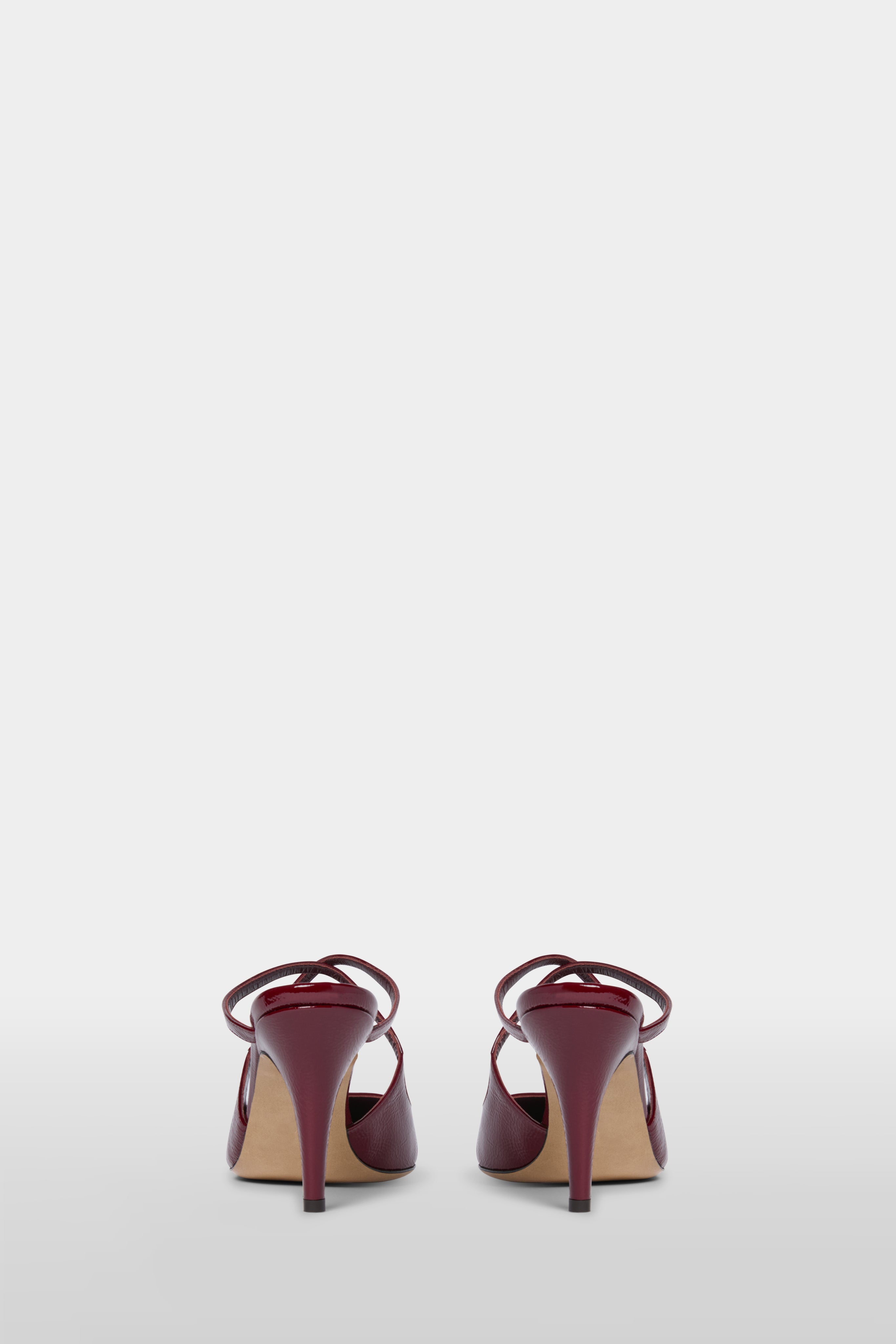 • Bordeaux patent mules with a rounded toe and elegant cross-strap design. Mid-height stiletto heel and sleek, glossy finish. A refined, versatile style for effortless day-to-night looks.