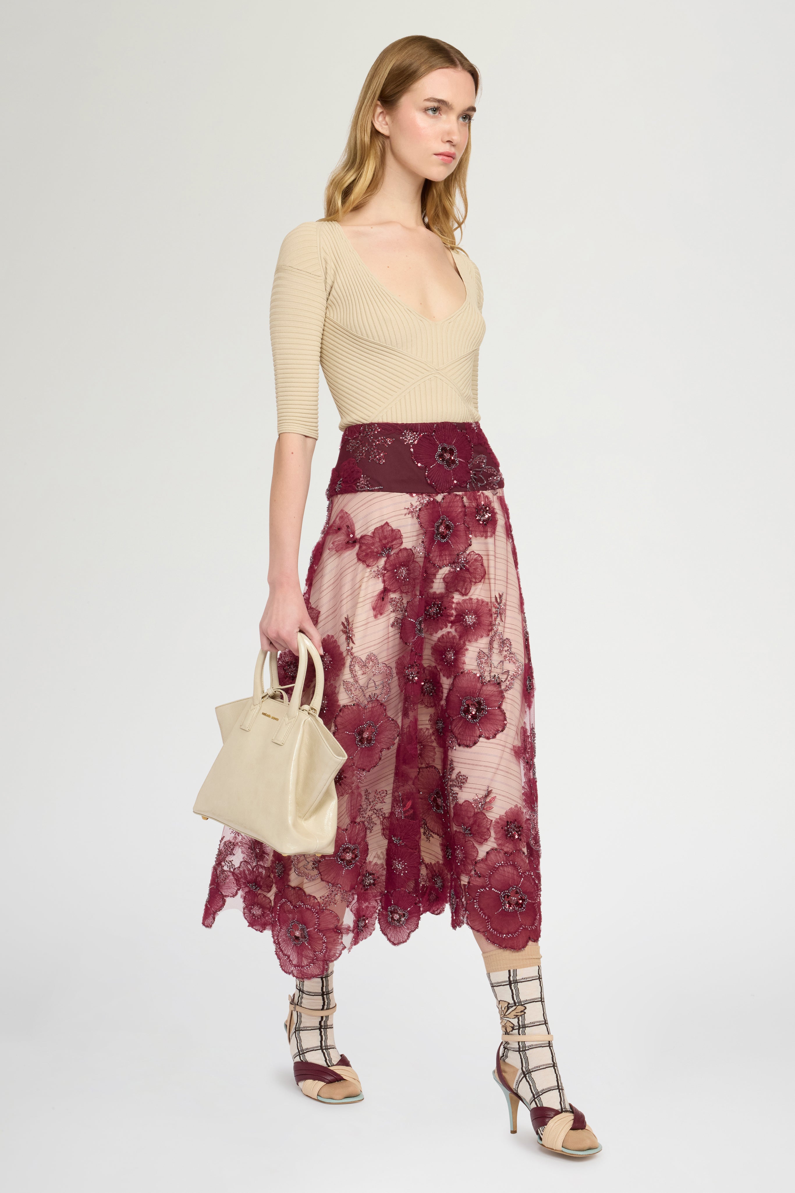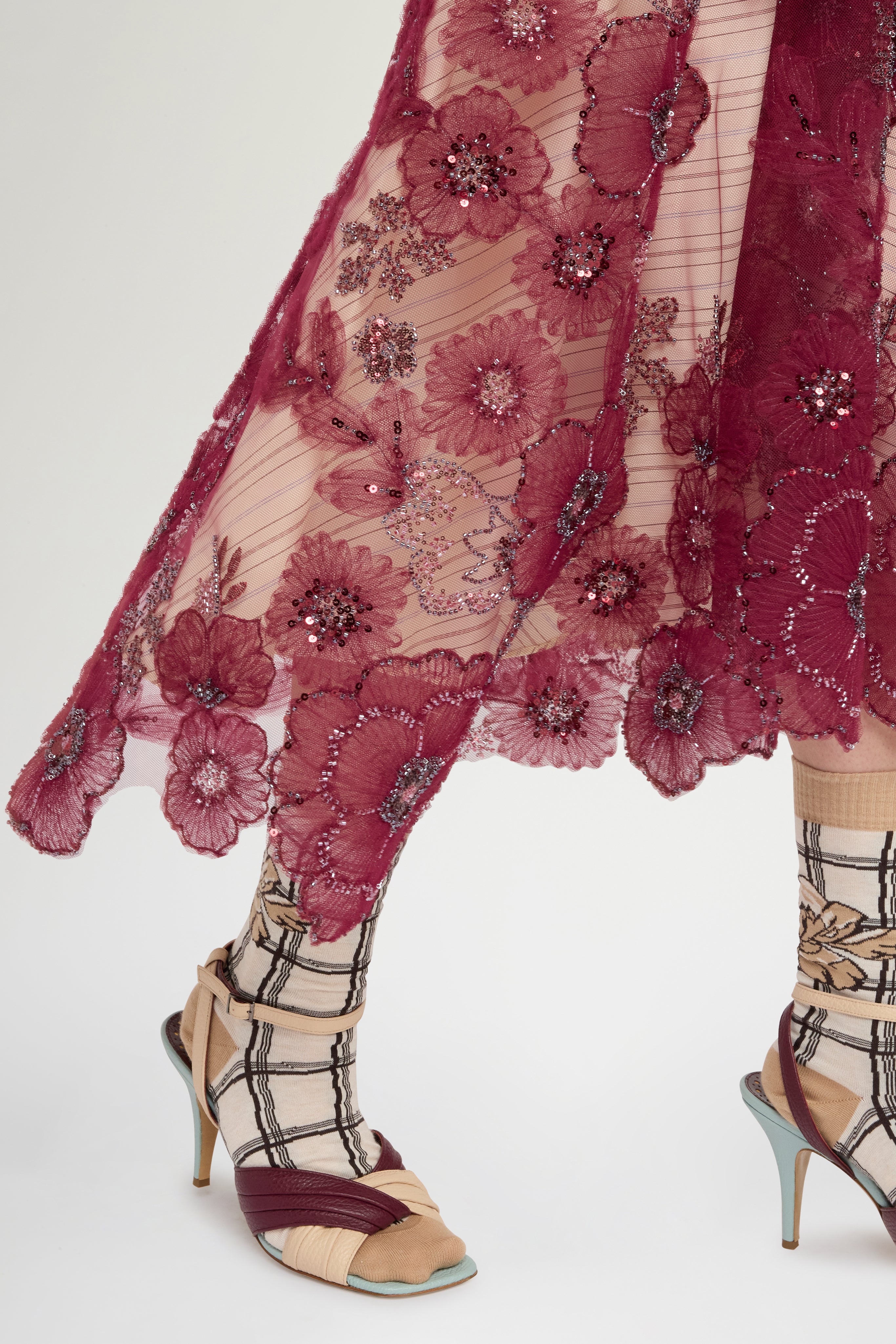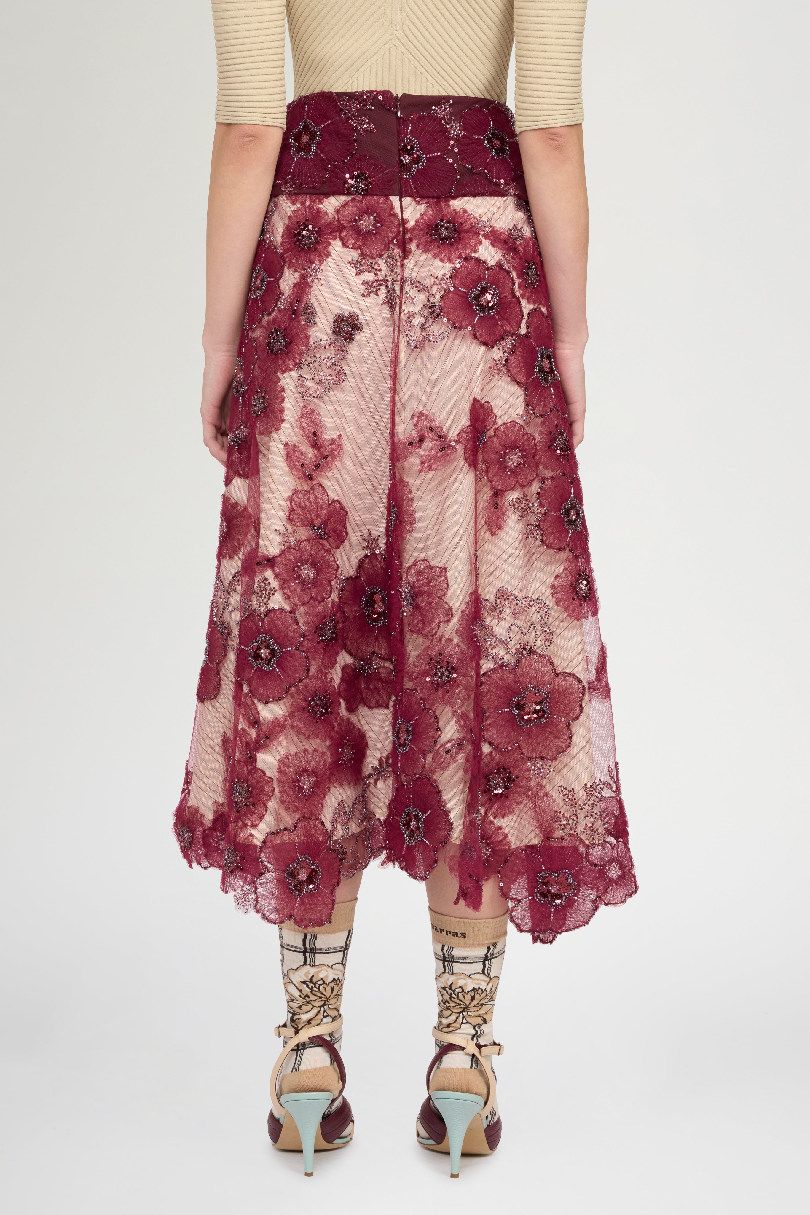 • Circle skirt in embroidered tulle with flowers, beads, and ramage‑effect sequins. Structured basque and contrasting ivory striped lining underskirt. Regular fit and above‑ankle length.