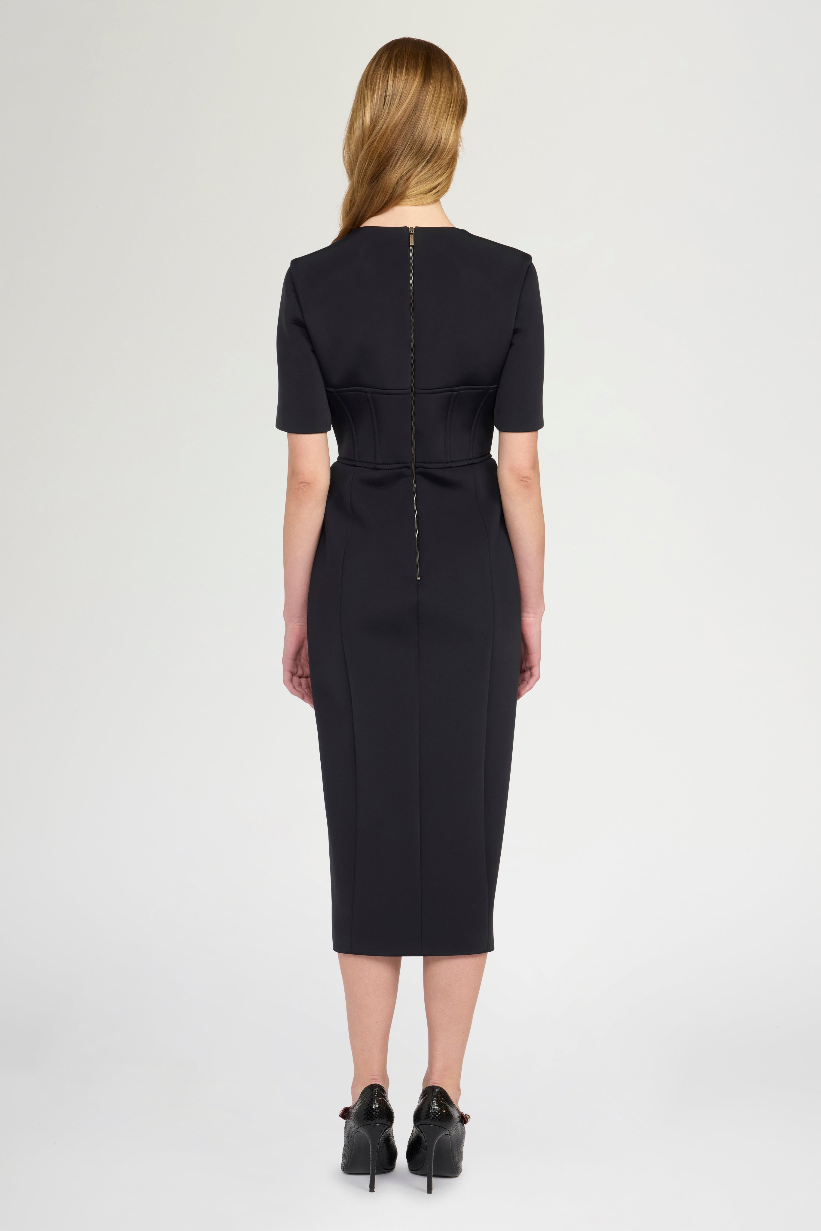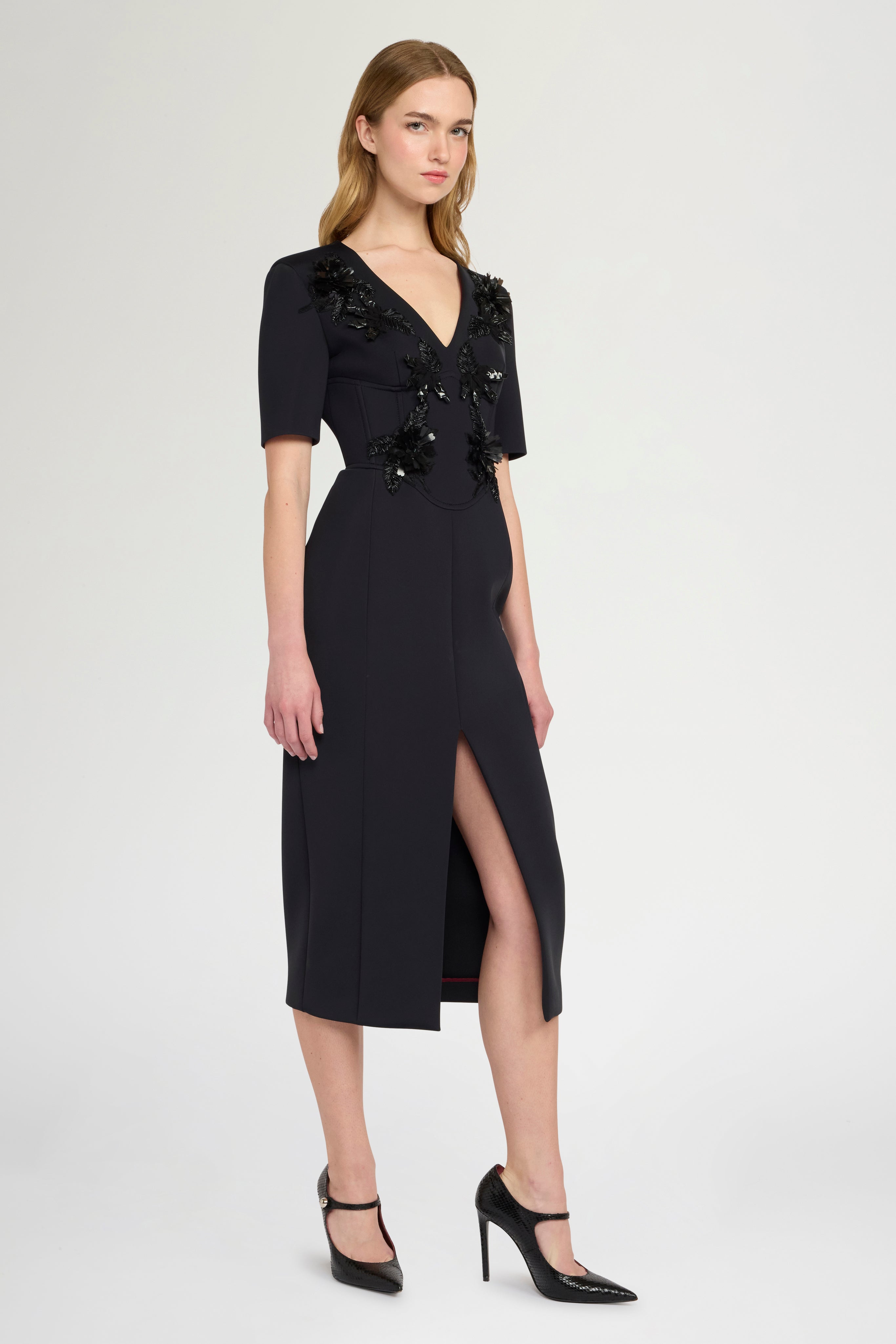 • Midi sheath dress with short sleeves, V-neckline, and deep front slit.