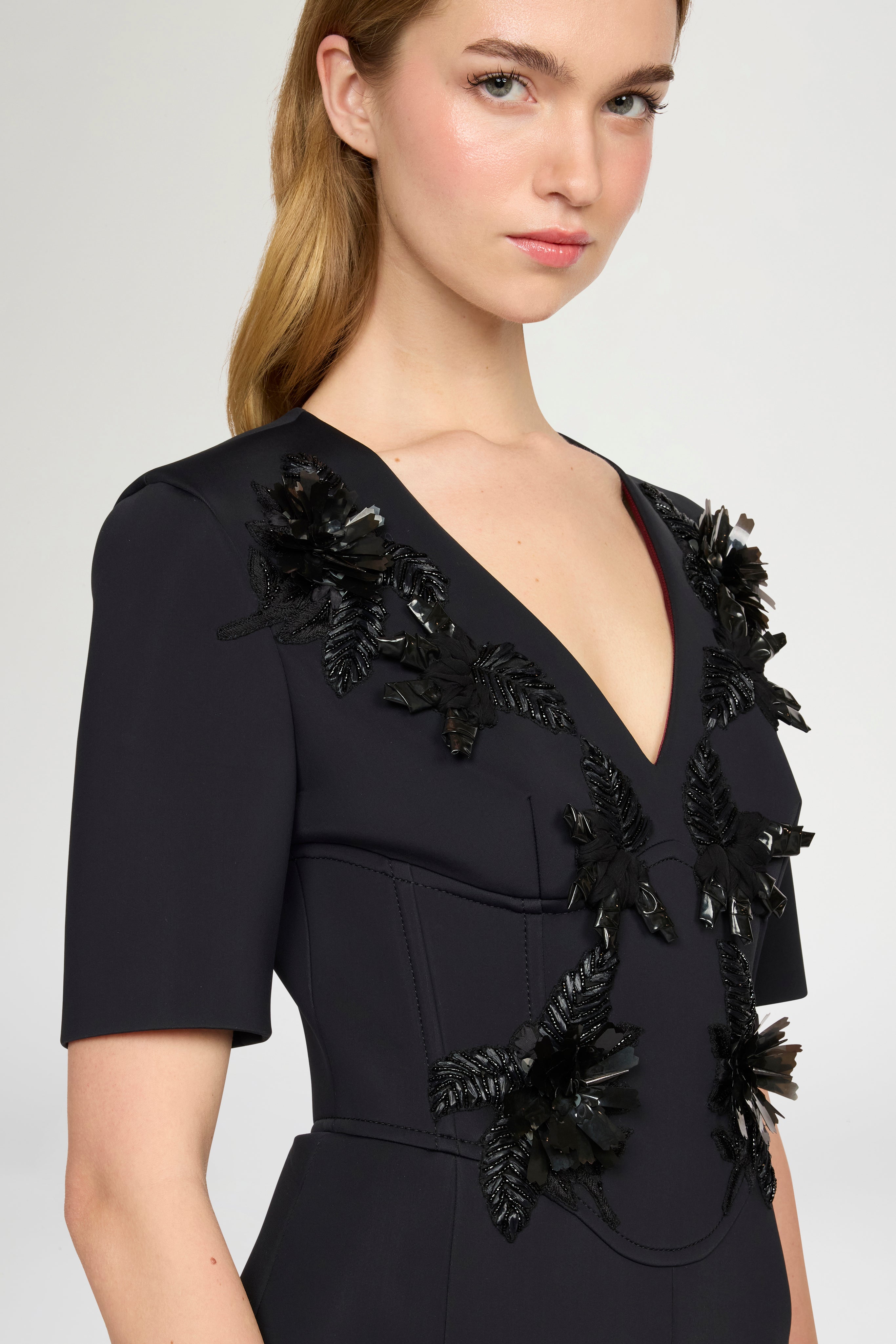 Three-dimensional floral embroidery with vinyl, studs, and beads on the bodice.