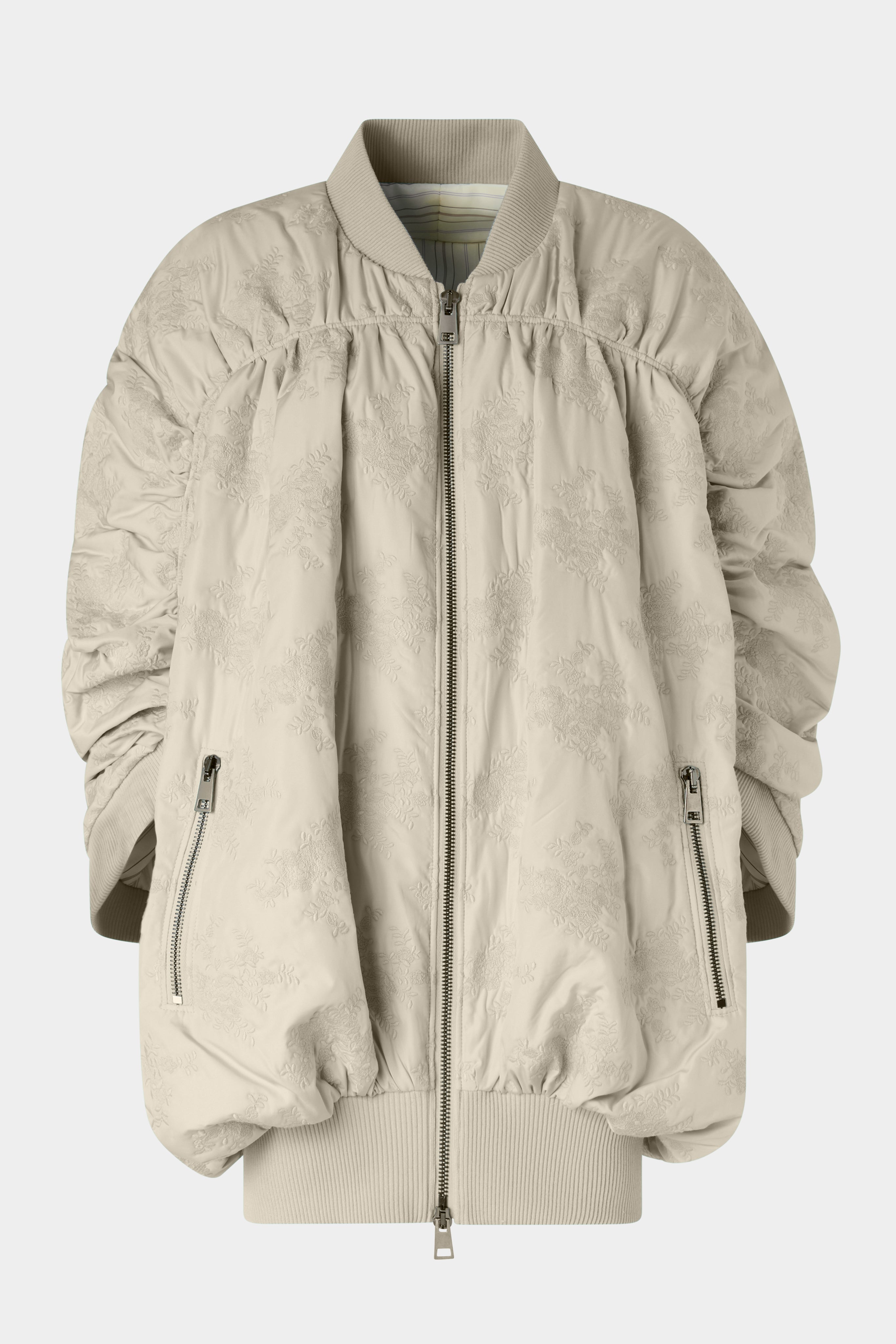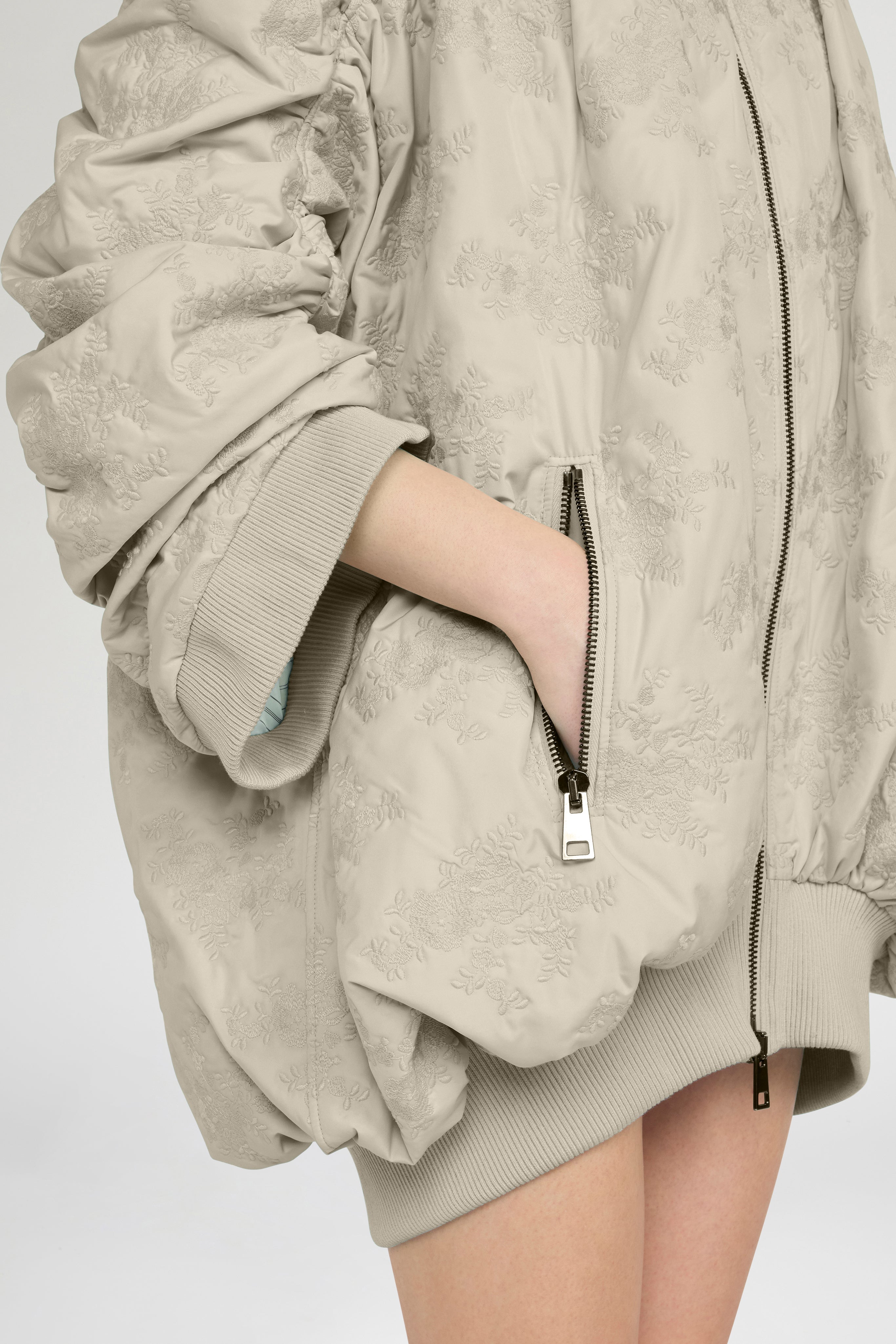 Oversized quilted nylon bomber jacket with tone-on-tone floral embroidery.