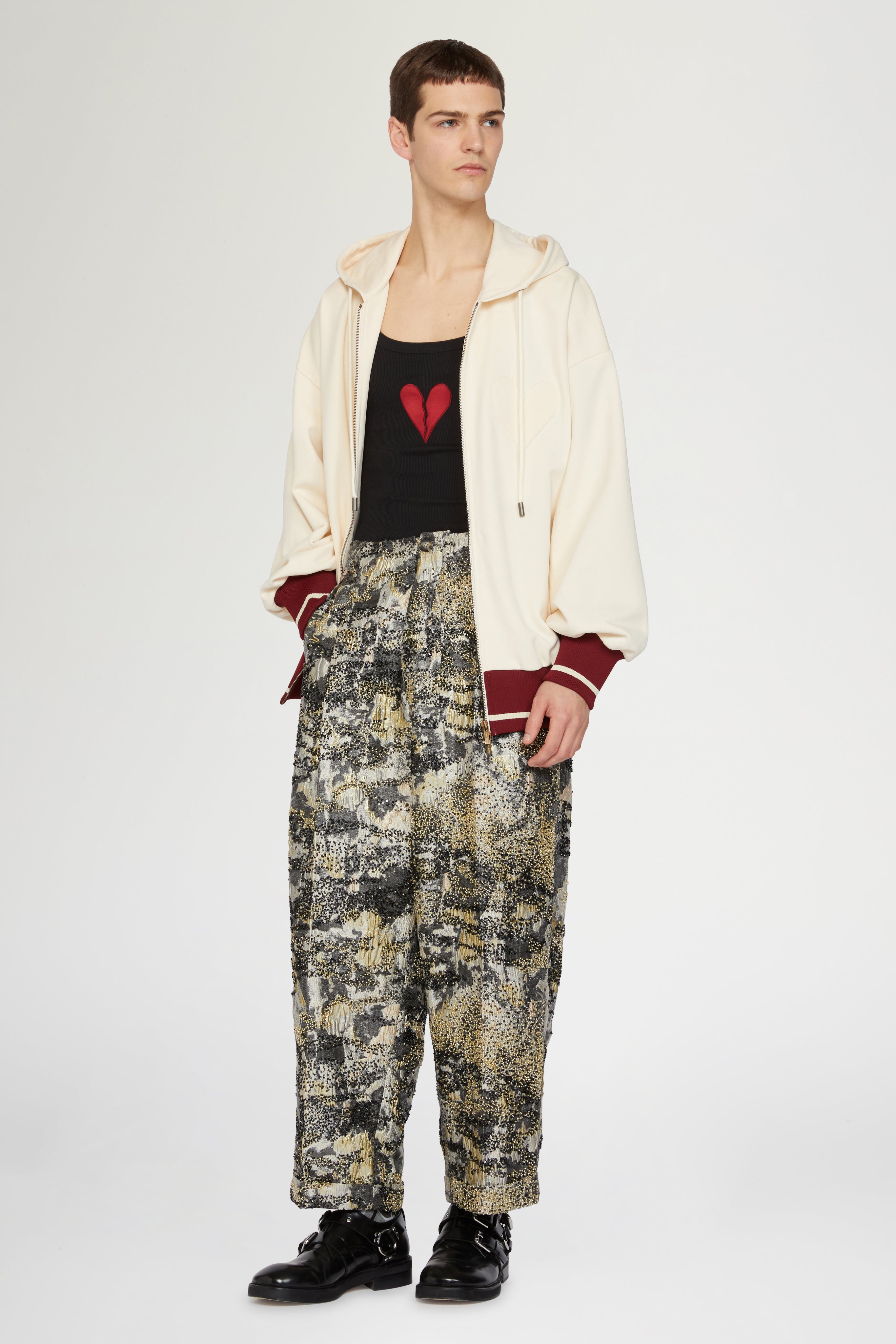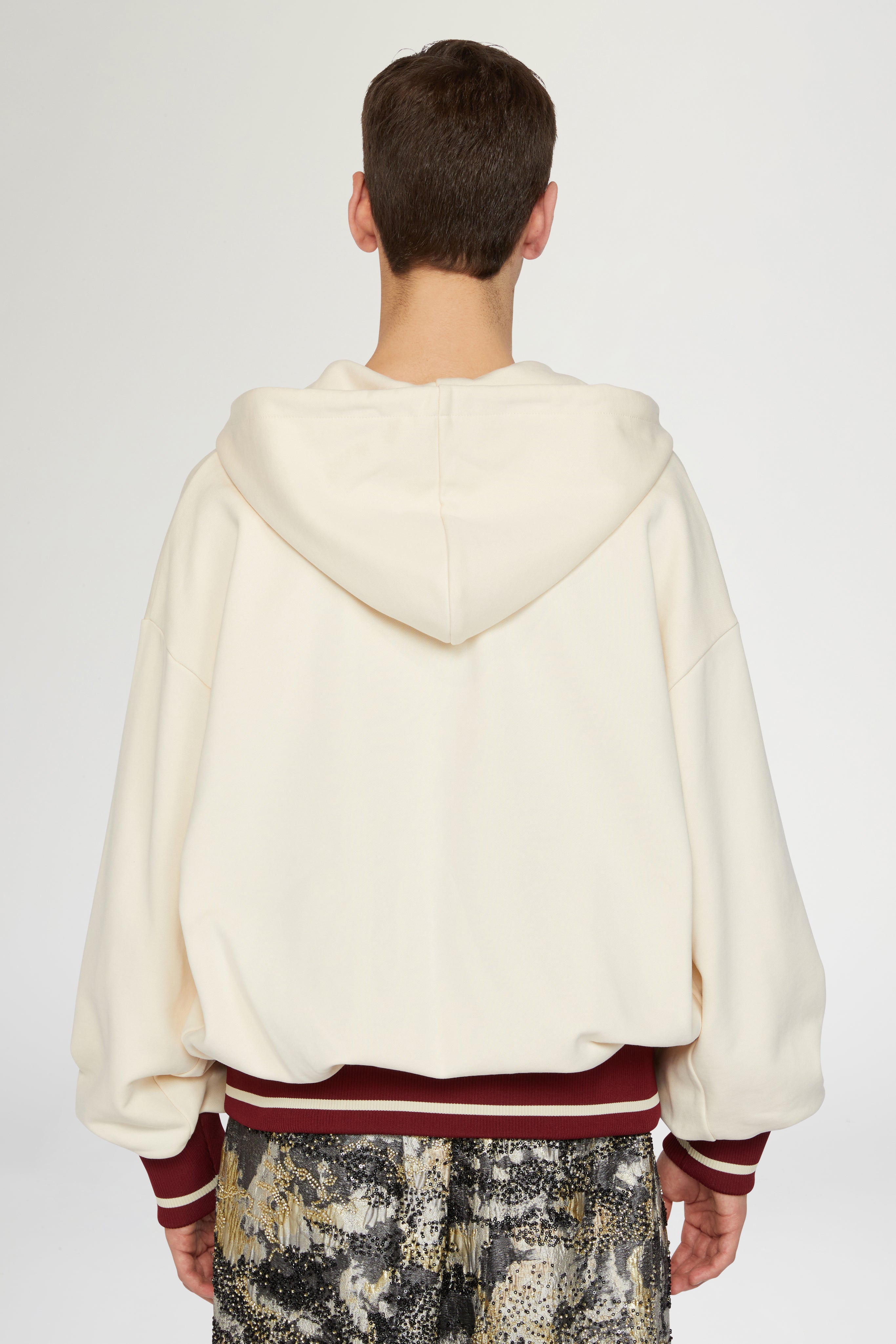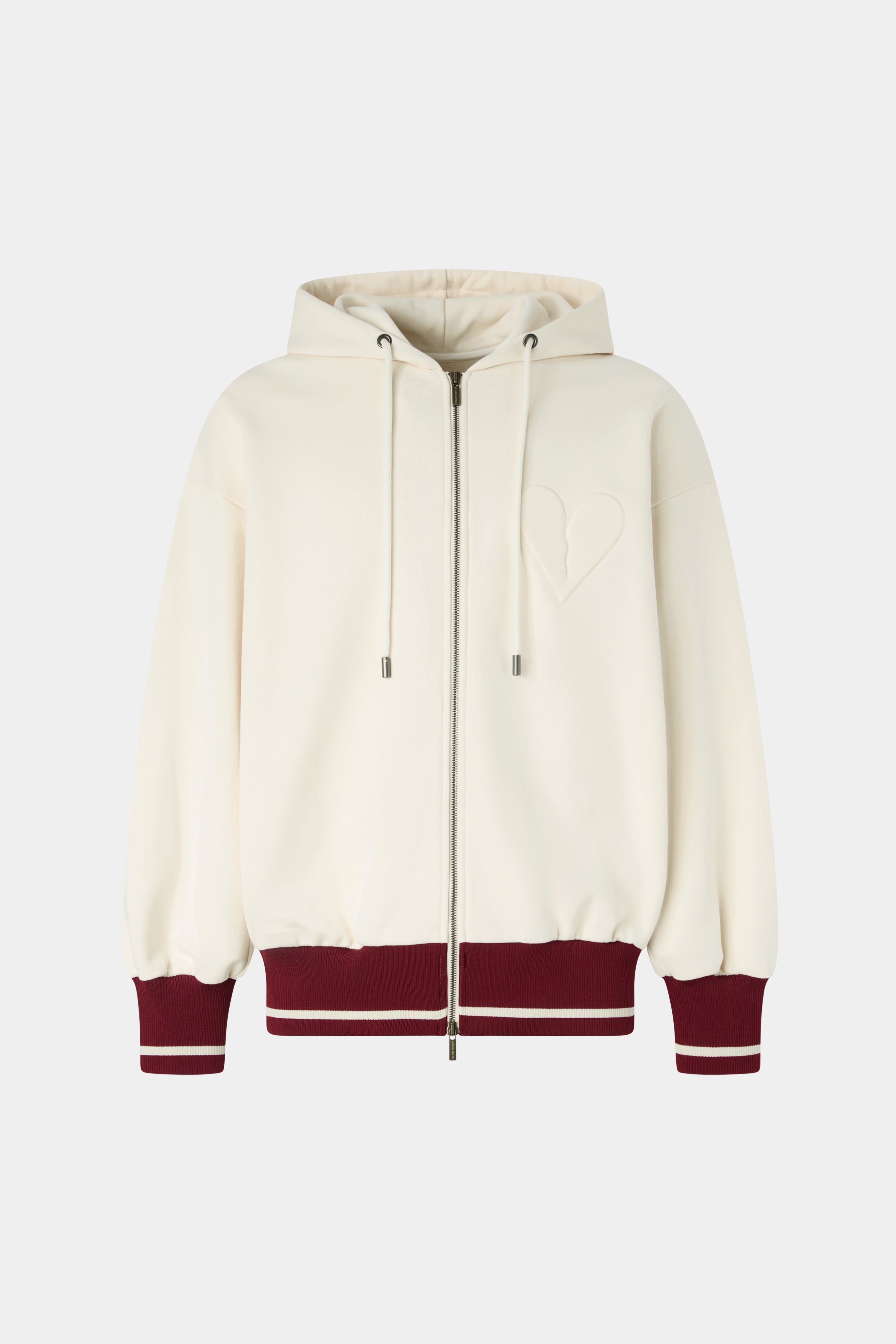 Oversized cotton hoodie in ivory with drawstring hood, ribbed contrast trims in burgundy and zip closure. Detailed with a tonal heart motif on the chest. A casual yet distinctive piece blending comfort with subtle graphic design.