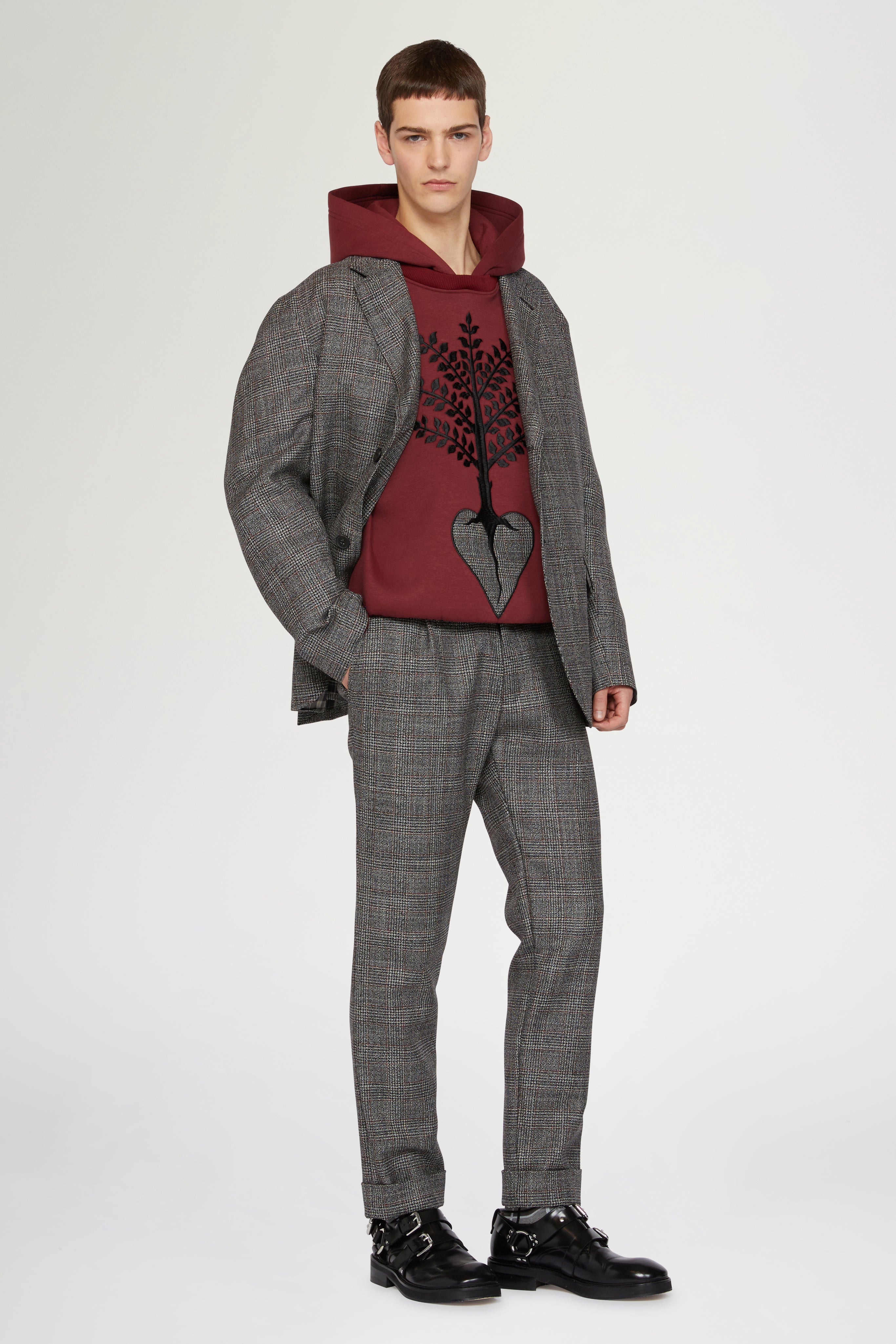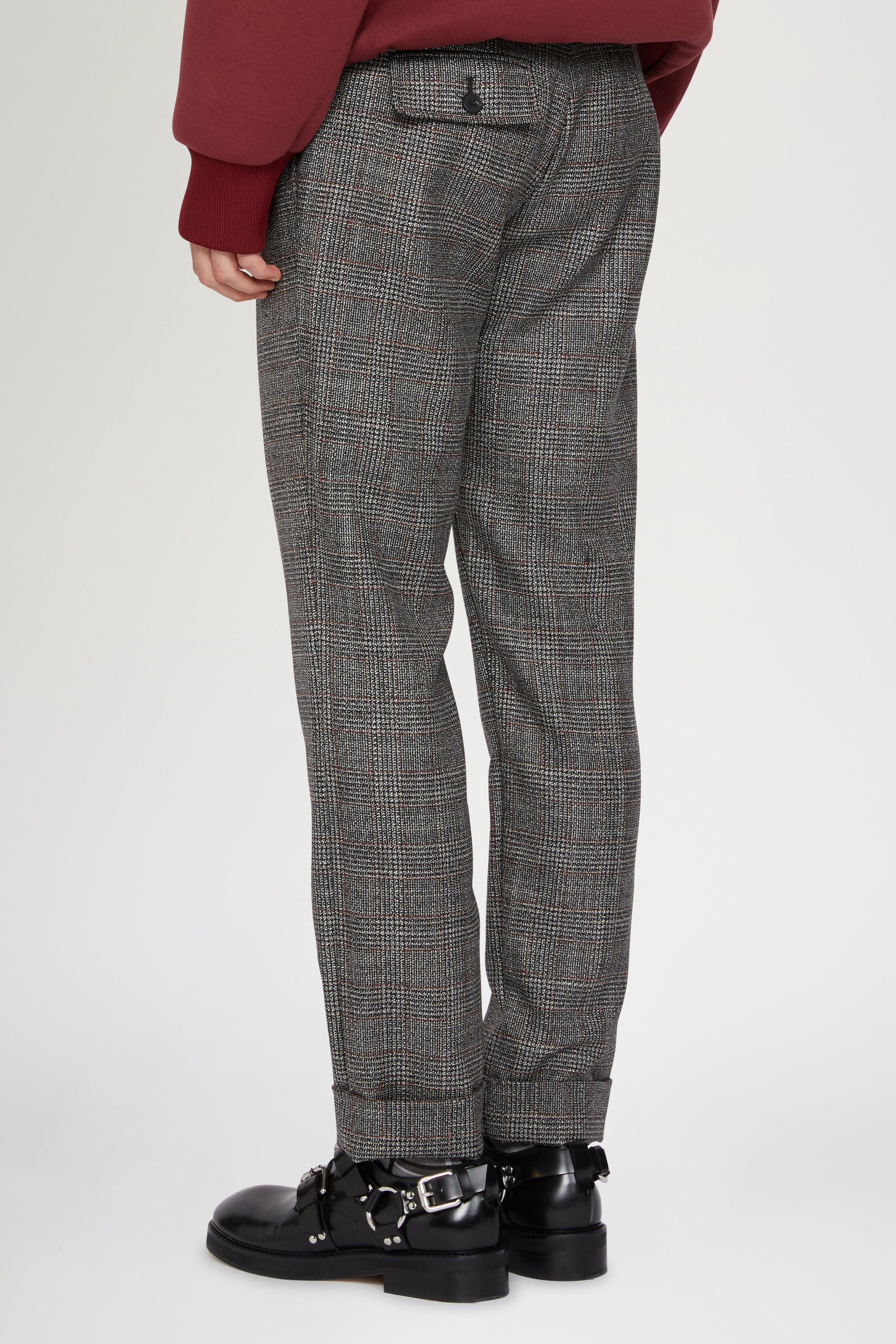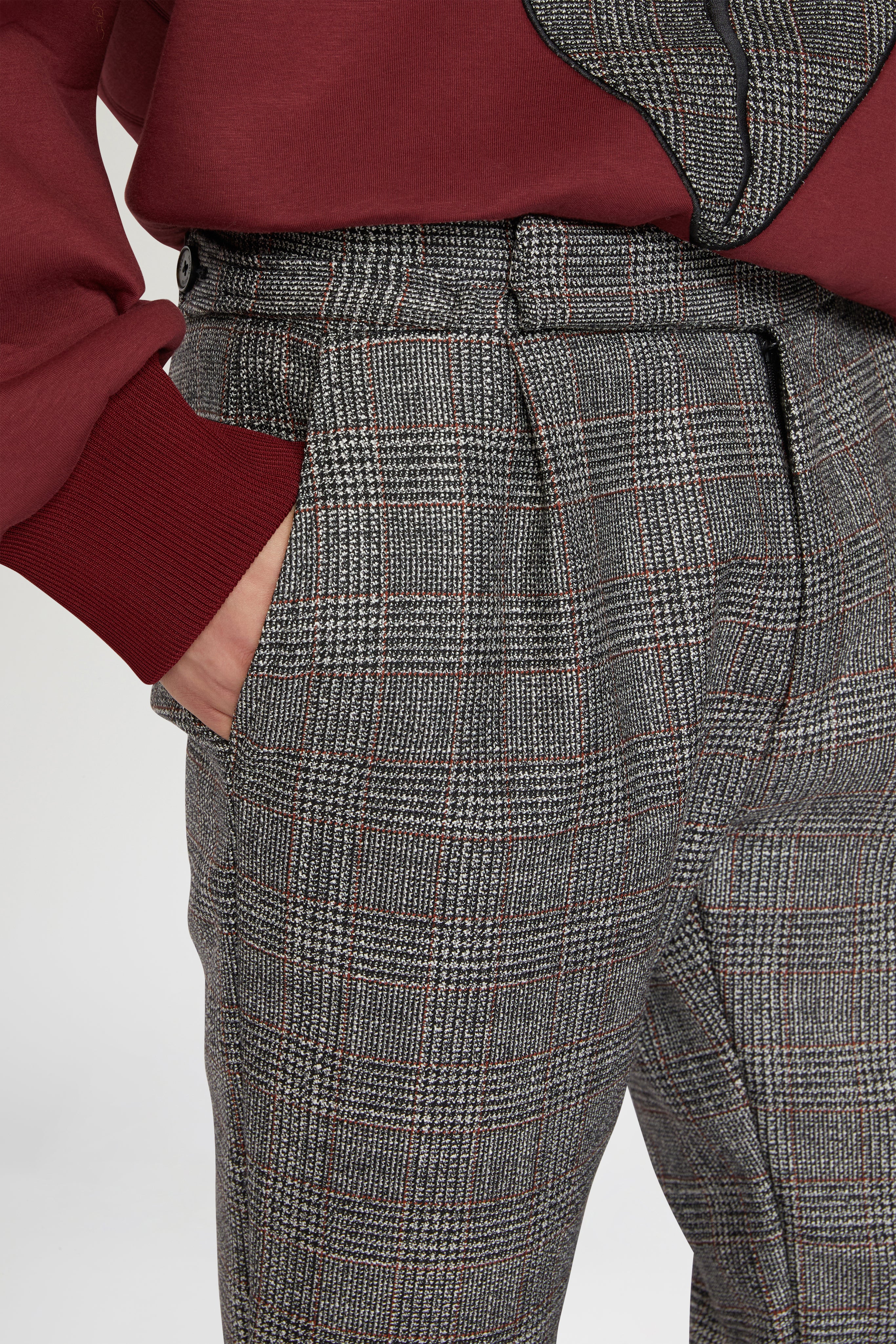 Pantaloni sartoriali in pura lana vergine con motivo a quadri grigi. Realizzati con orli risvoltati e una vestibilità moderna e regolare per un'eleganza quotidiana raffinata.