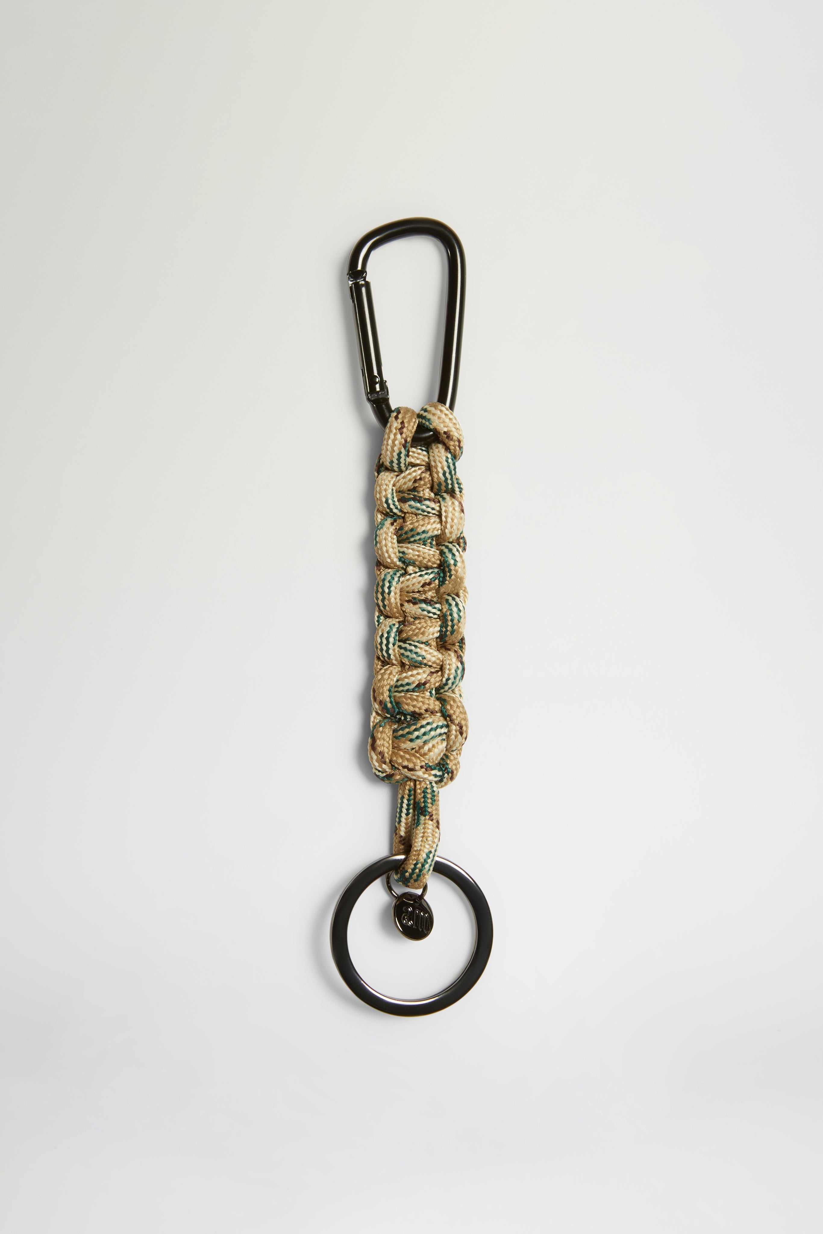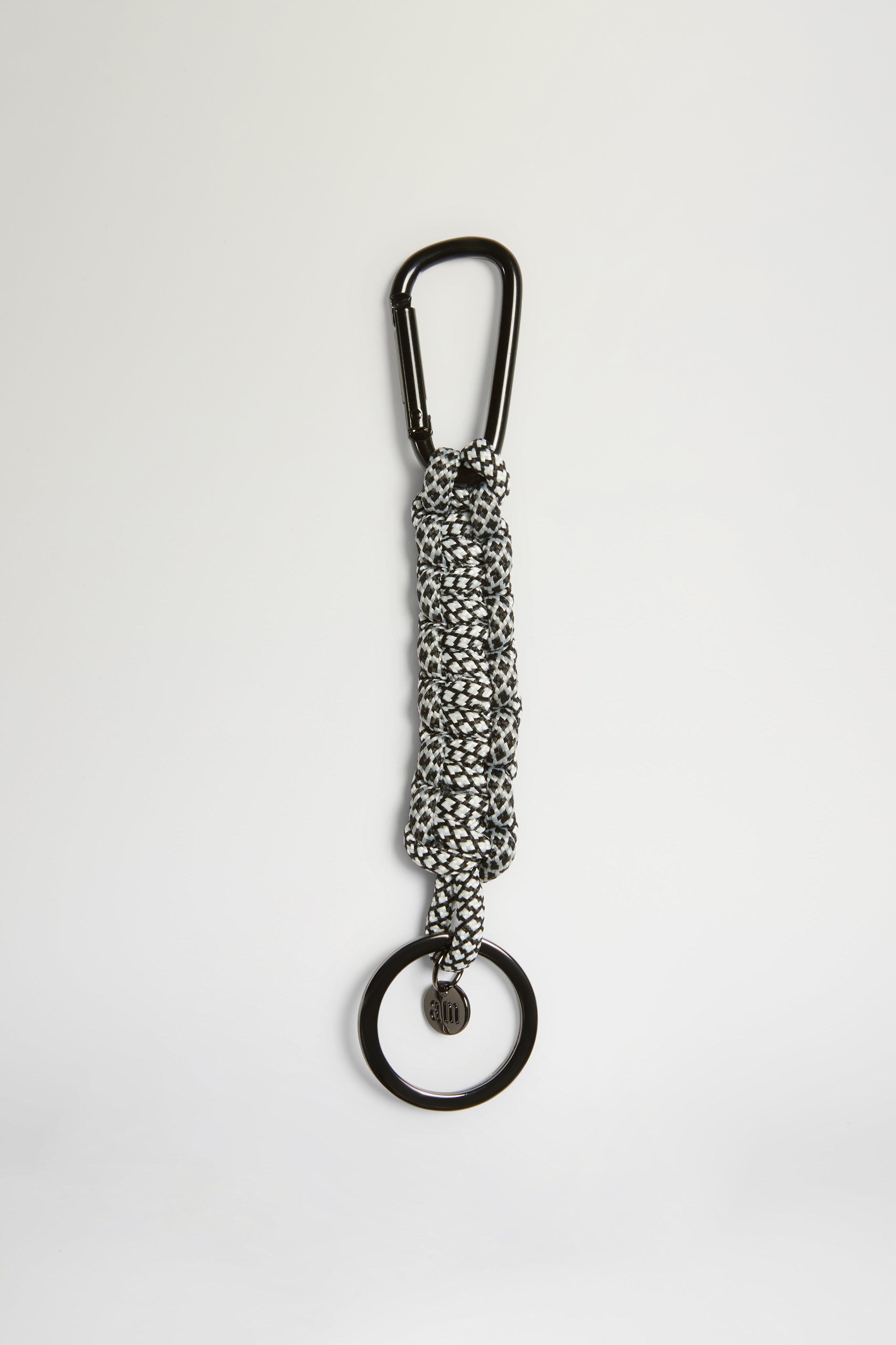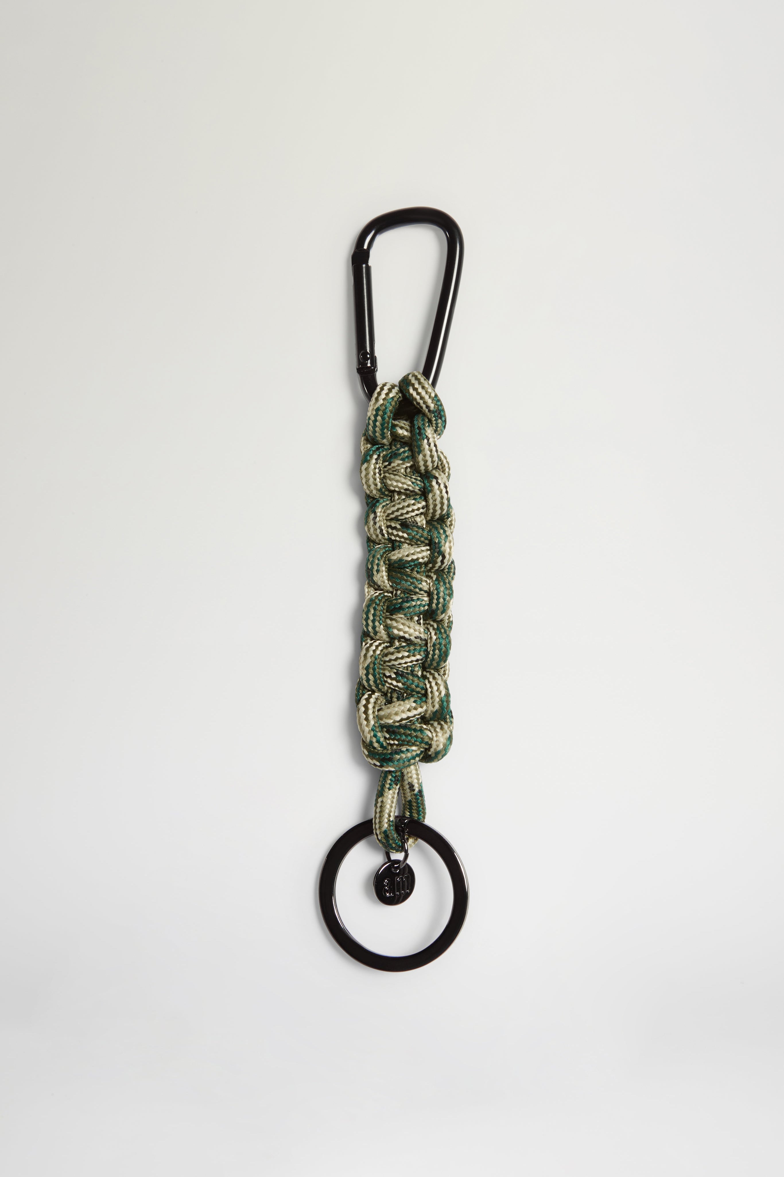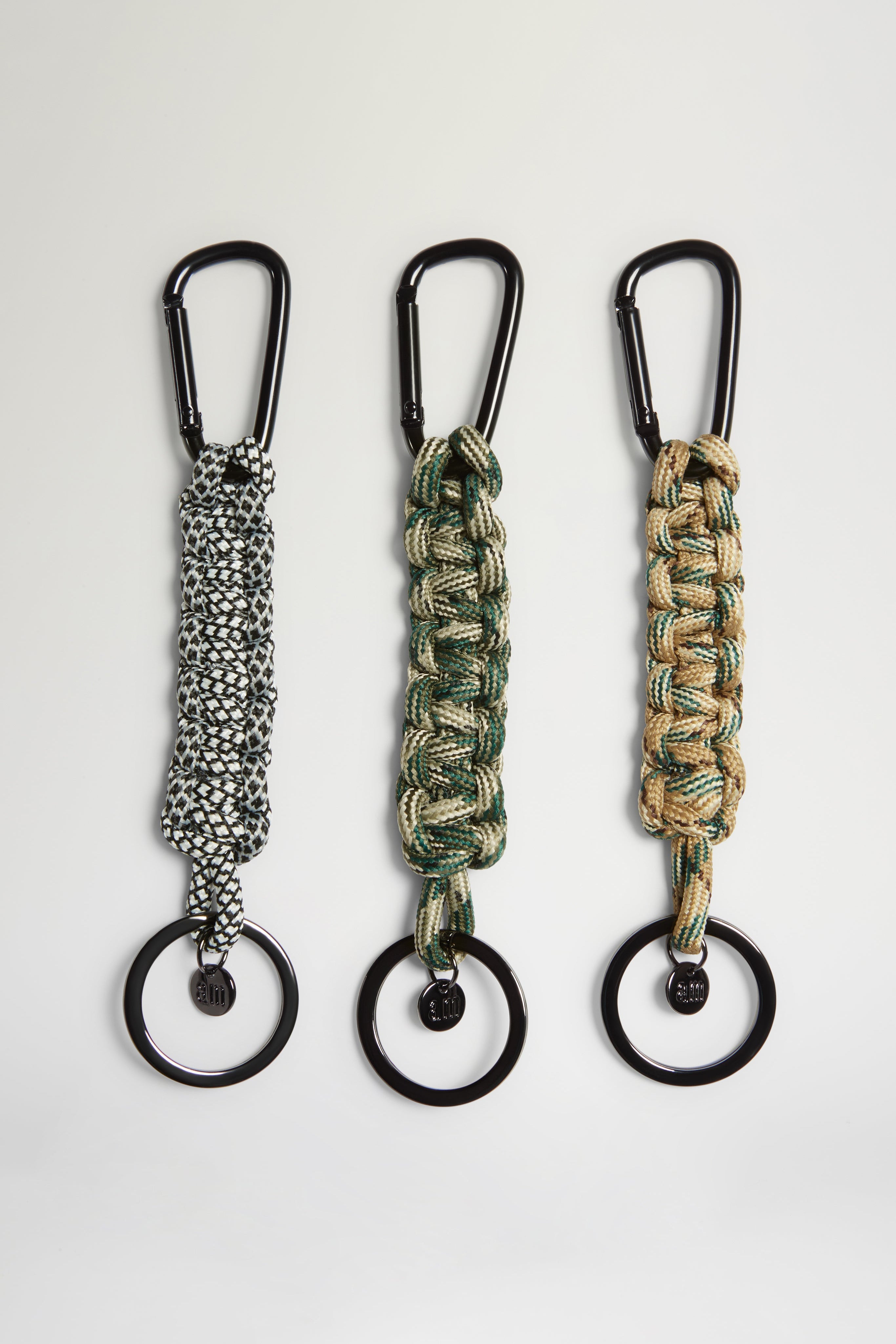 Set di tre resistenti portachiavi in corda con moschettoni e anelli in metallo nero, caratterizzati da design intrecciati in bianco-nero, verde-camouflage e tan-camouflage. Perfetti per l'uso quotidiano, avventure all'aperto o come regalo.