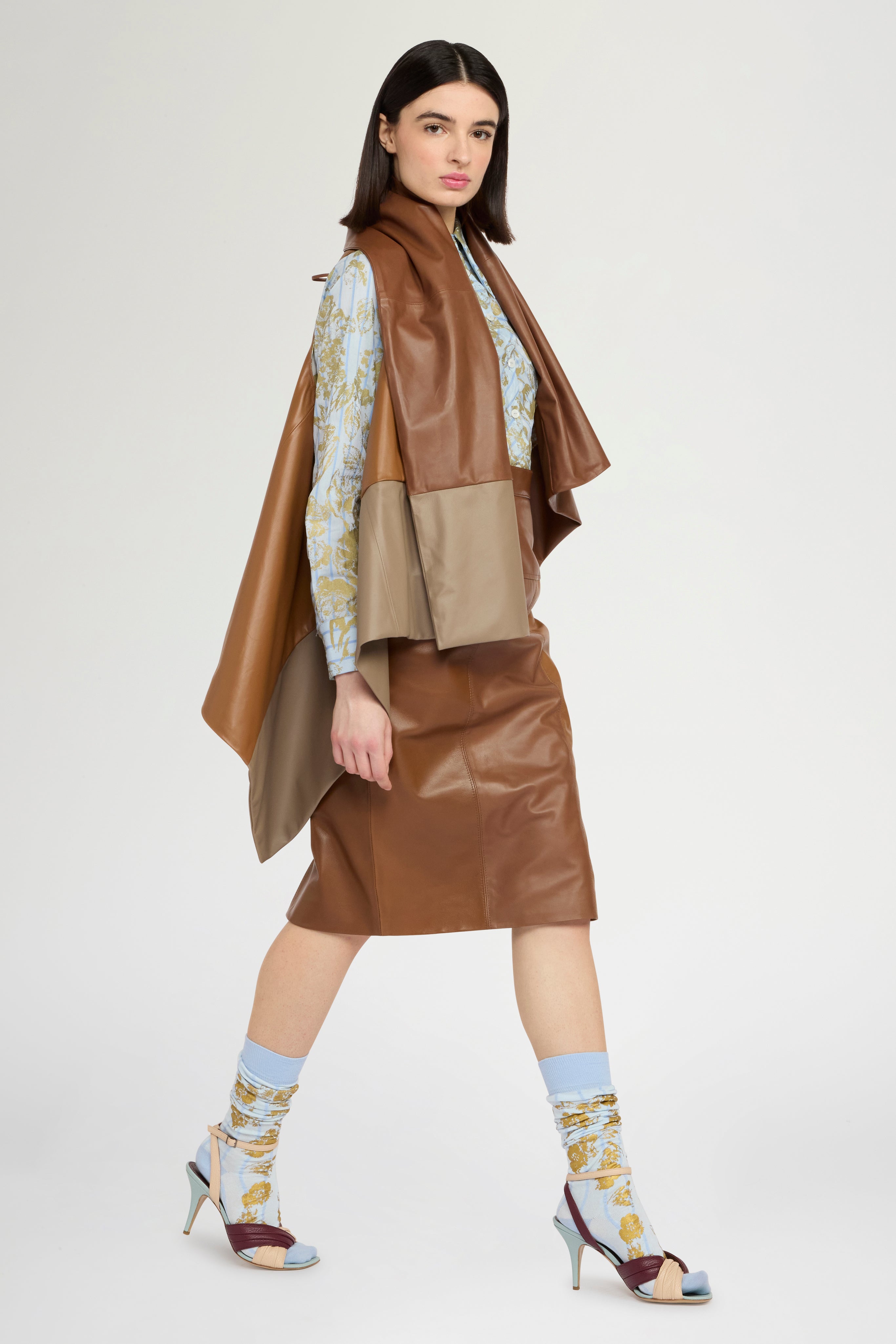 Giacca realizzata in 100% pelle morbida e leggera, completamente foderata in cupro per garantire comfort e traspirabilità. Il design presenta una composizione a blocchi di colore nei toni tortora, fango e cammello, che mette in risalto la costruzione del capo e ne valorizza i volumi. Vestibilità e lunghezza regolari.