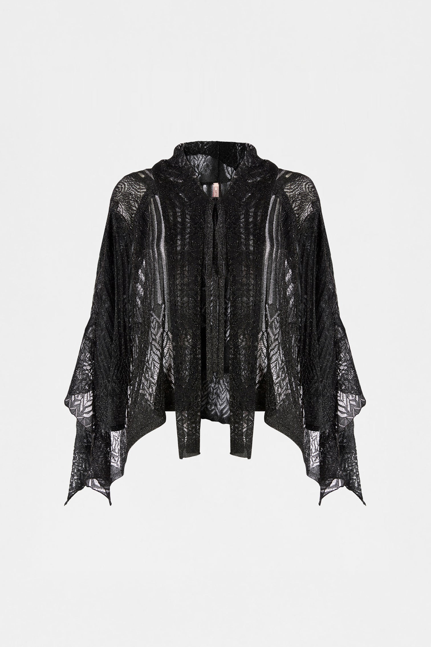 Cardigan a maniche corte realizzato in pizzo nero leggero con un motivo decorativo intricato. Costruzione fluida con maniche ampie e drappeggiate e orlo asimmetrico. Chiusura frontale con laccio che valorizza la scollatura mantenendo la trasparenza ariosa del capo. Vestibilità regolare.