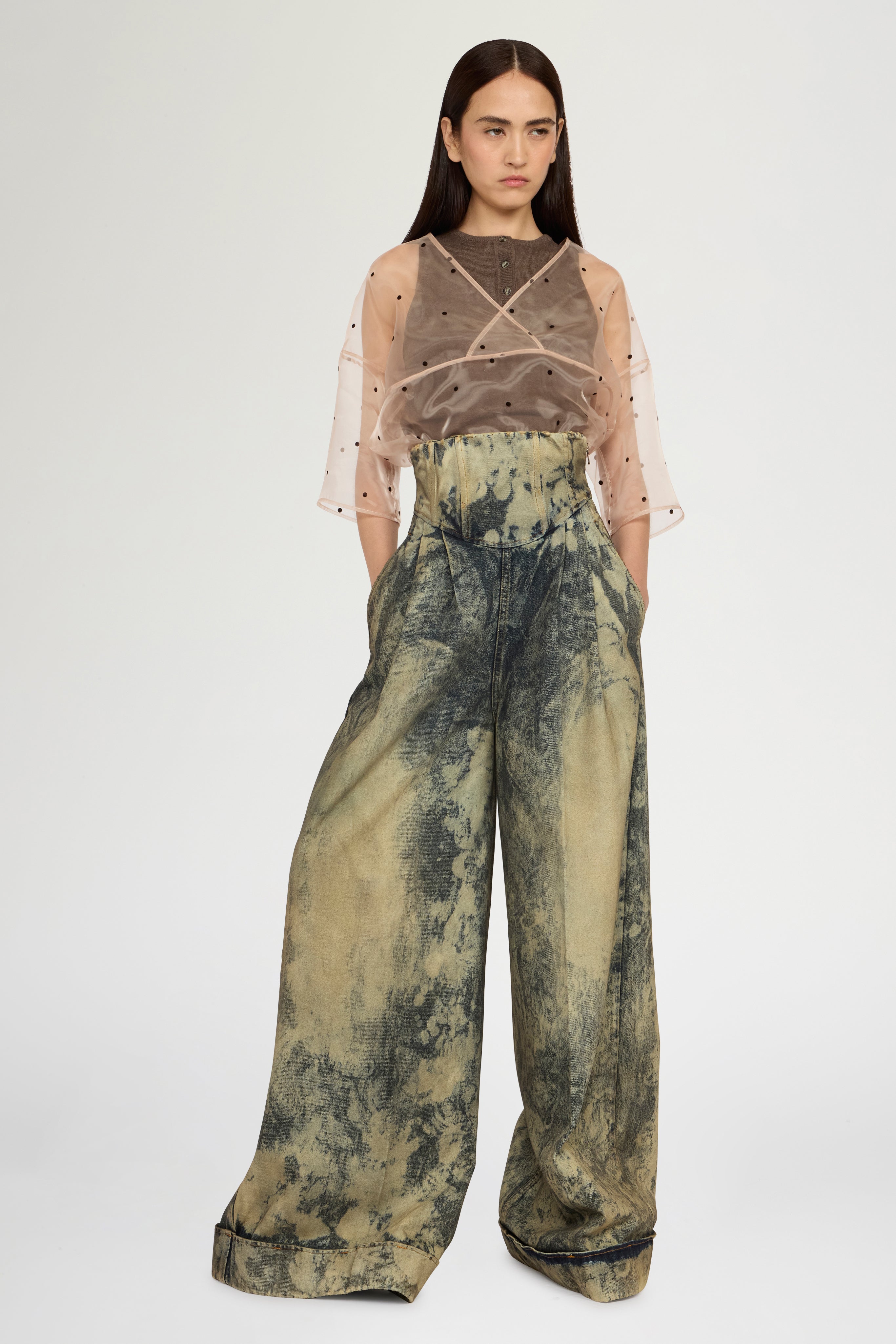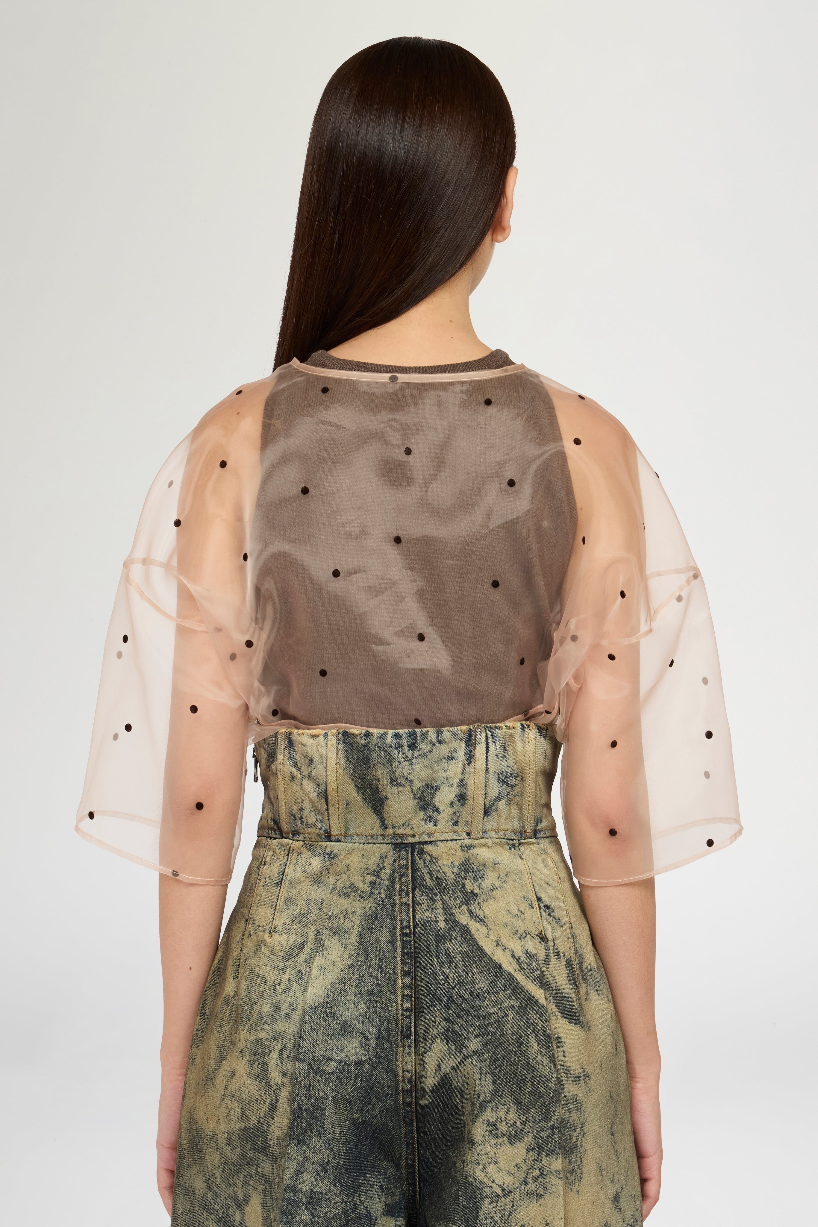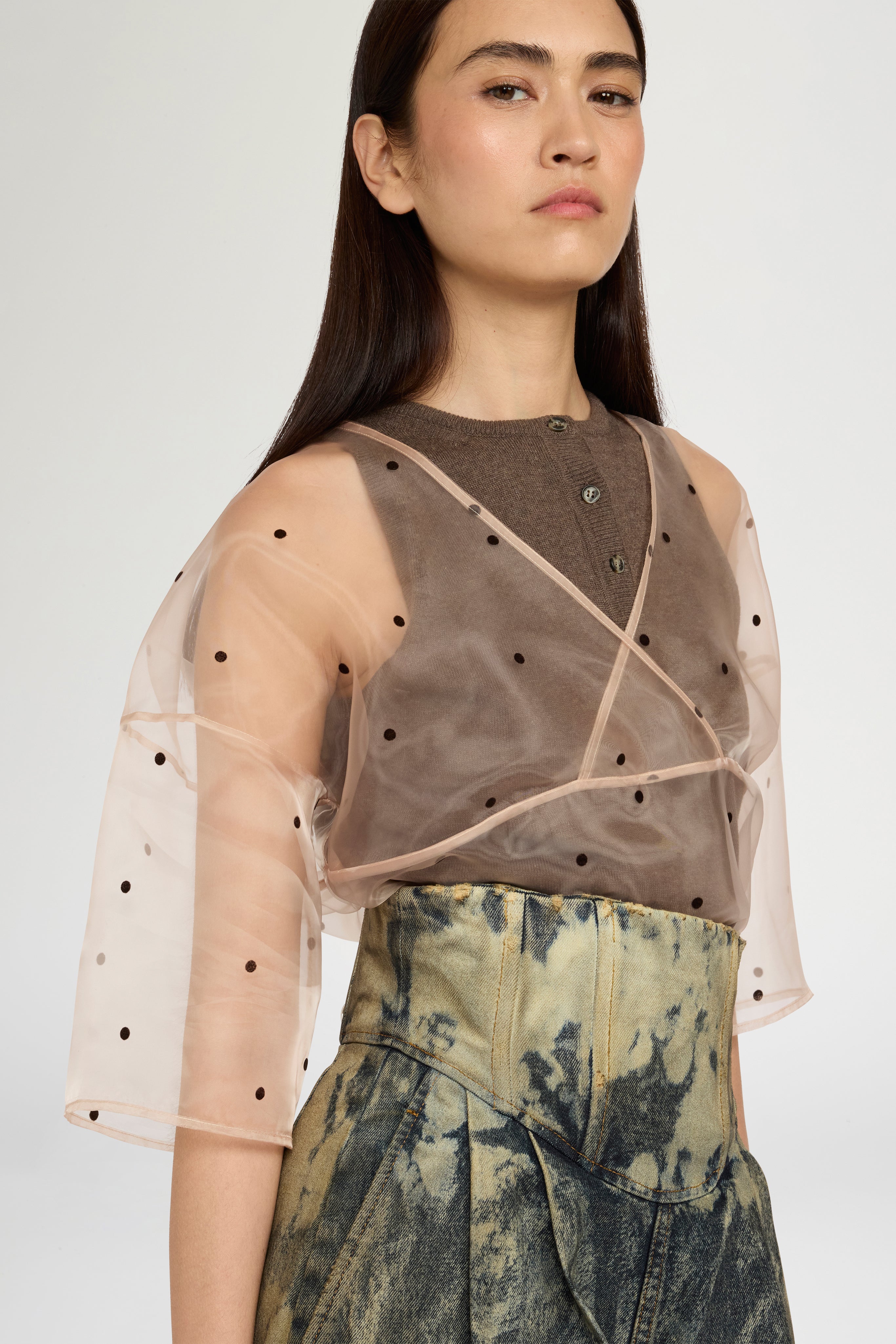 Top a doppio strato con base in maglia di cotone mélange marrone senza maniche e camicetta in organza a pois con scollo a V sovrapposto. Effetto stratificato che rivela i diversi livelli e la chiusura con bottoni sullo scollo. Vestibilità slim con lunghezza regolare.