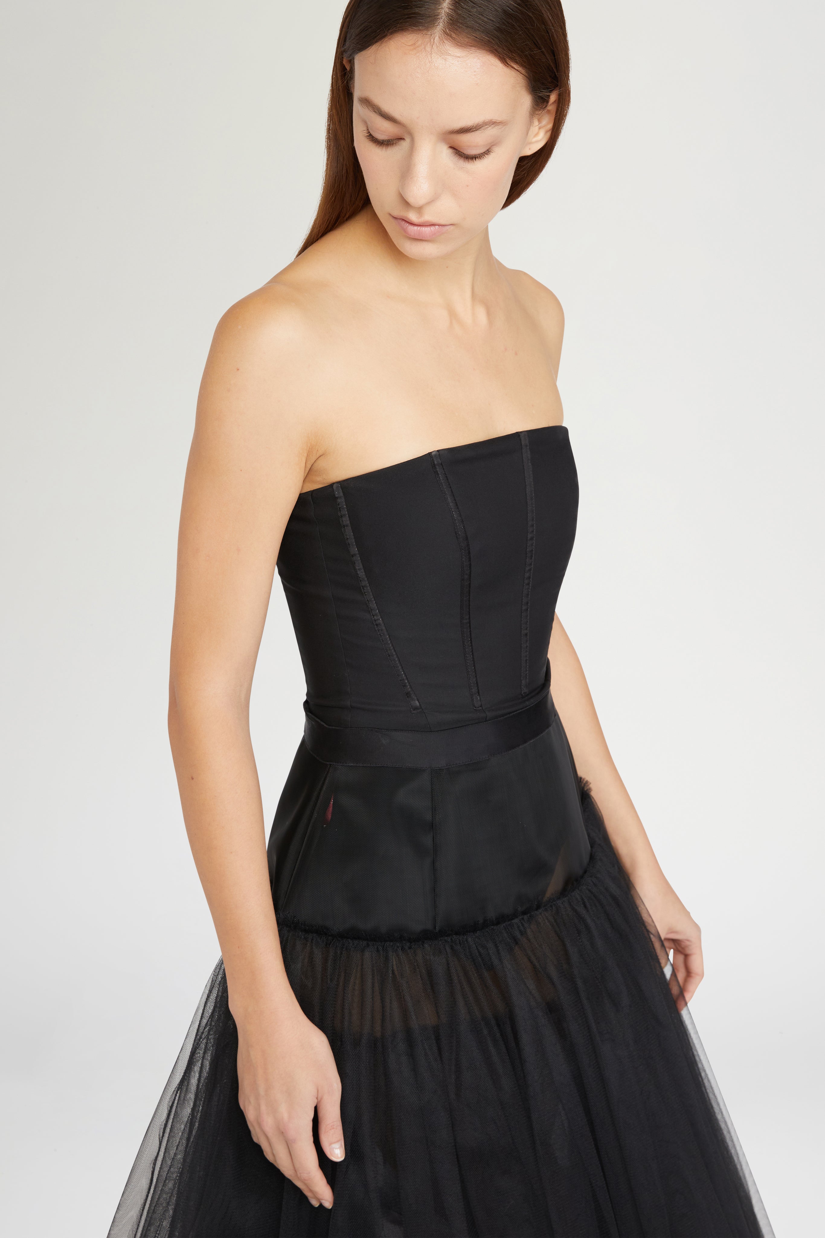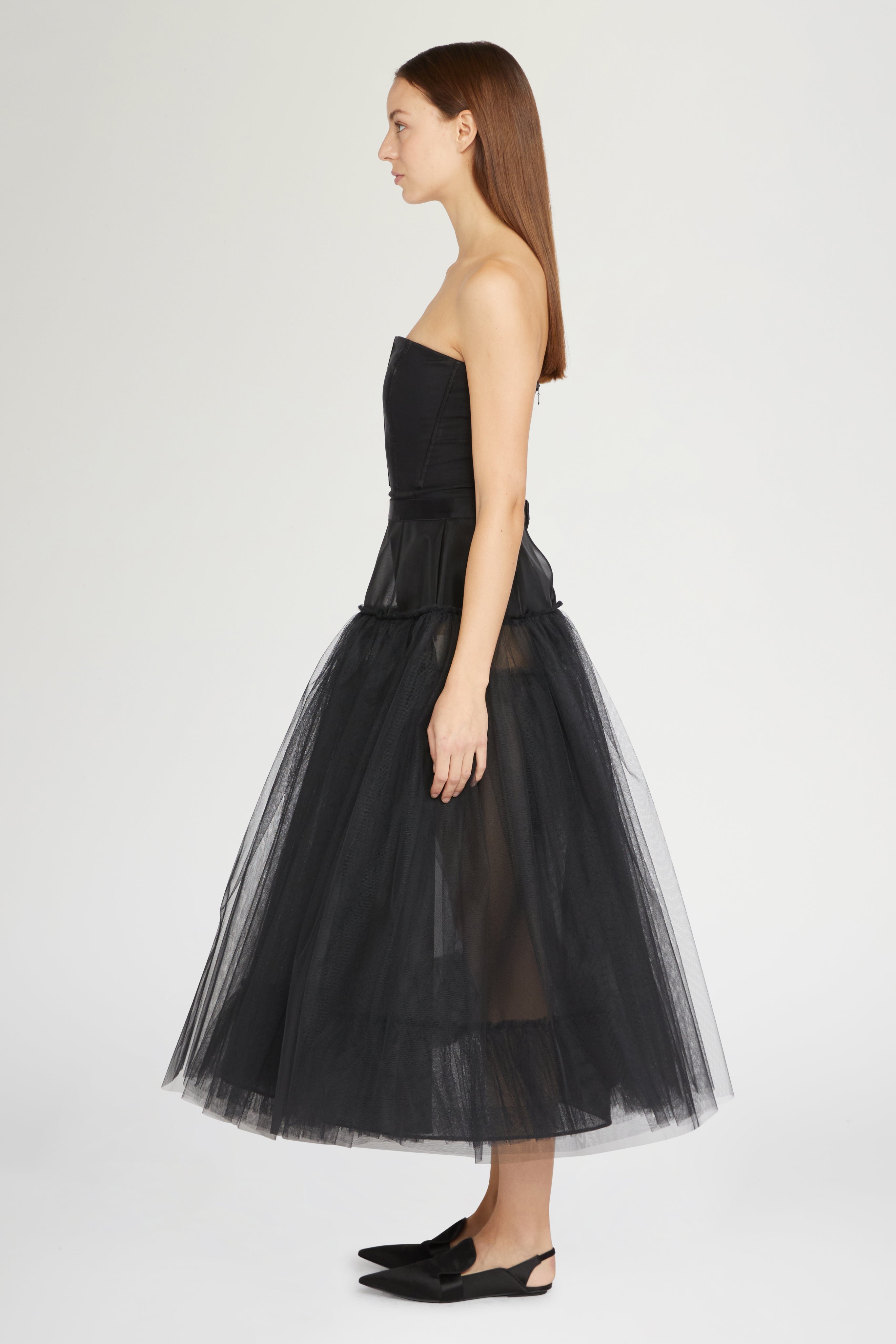 Sottogonna in tulle colore nero, lunga fino alla caviglia, con fascia in vita a contrasto e pannello superiore in organza trasparente. Perfetta per donare volume e struttura ad abiti e gonne.