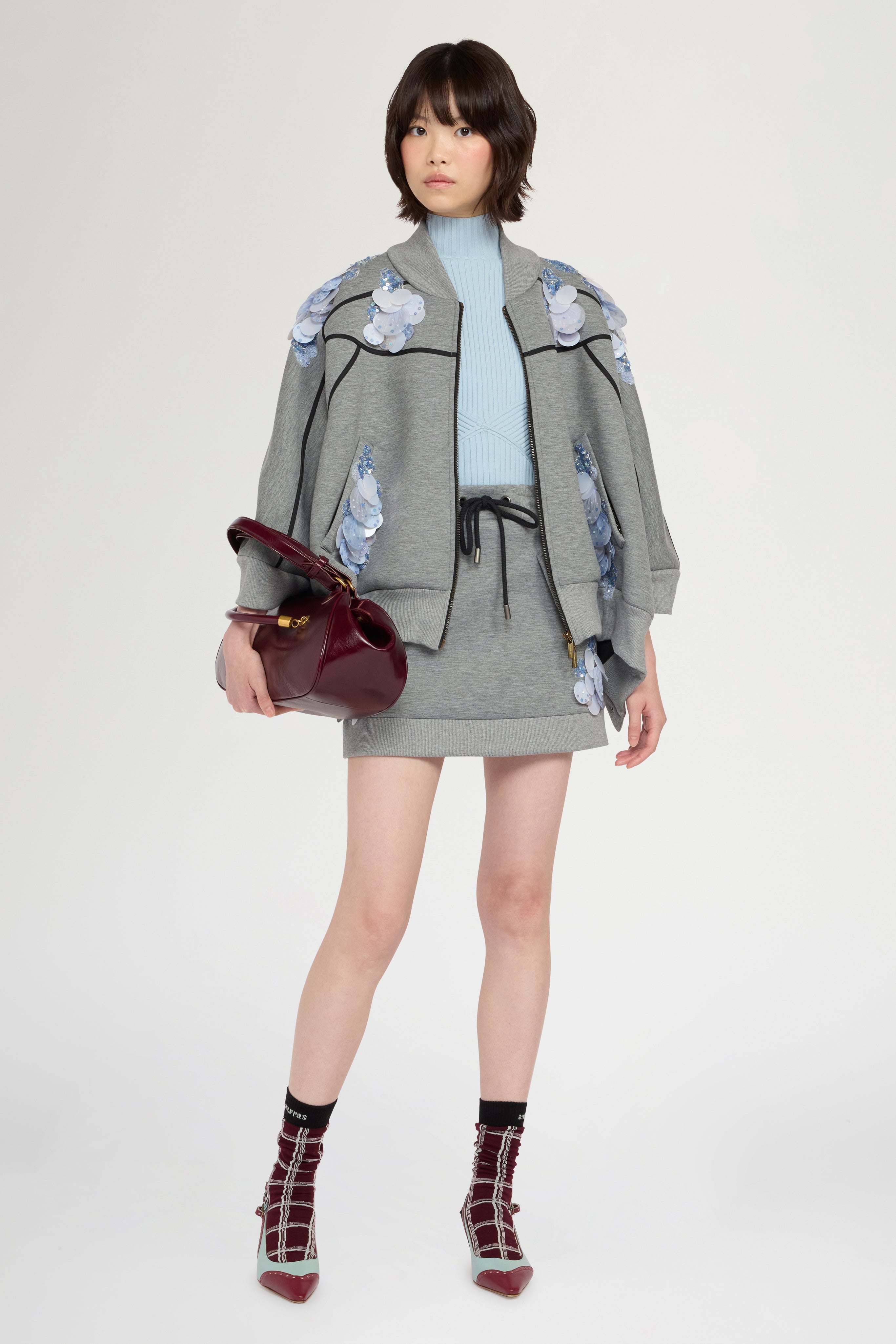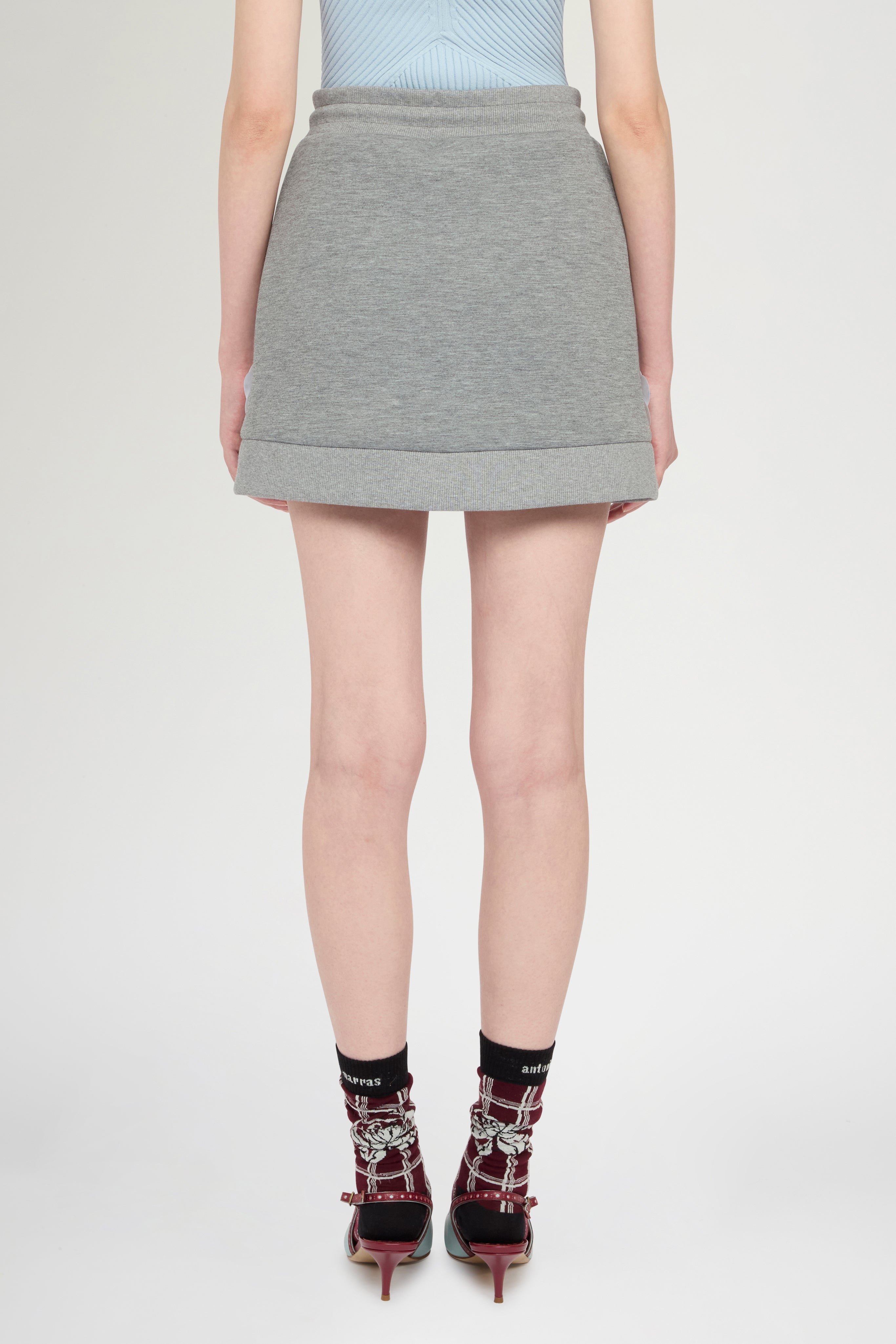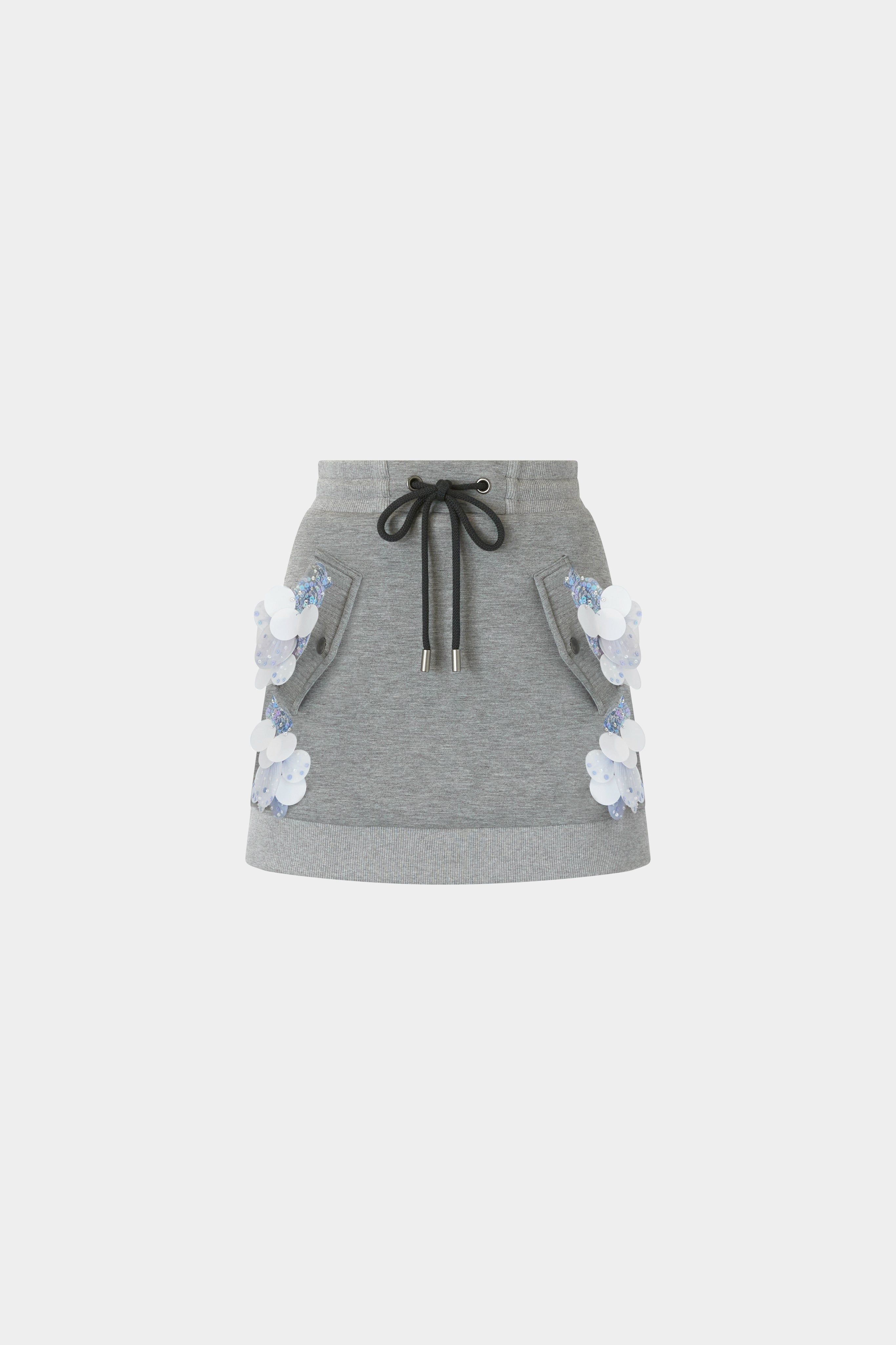 Gonna grigio melange caratterizzata da una silhouette pulita e una vestibilità regolare. Il design presenta una fascia a costine con coulisse e tasche decorative. Applicazioni di paillettes raggruppate, sovrapposte a tulle tono su tono e micro paillettes, creano motivi floreali luminosi lungo i lati. Un orlo a costine completa il capo con una struttura e una texture sottili.