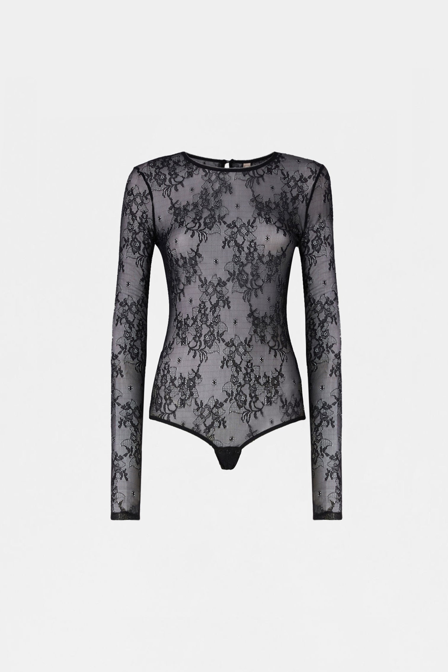 Body da donna a maniche lunghe in pizzo elasticizzato floreale semitrasparente, caratterizzato da una silhouette pulita e una vestibilità aderente come una seconda pelle. Progettato con scollo rotondo, bordo smerlato e apertura a goccia sul retro con chiusura a bottone. Realizzato in tonalità nera, il pizzo unisce poliammide ed elastan per garantire flessibilità e struttura. La base è foderata in puro cotone per traspirabilità e comfort.
