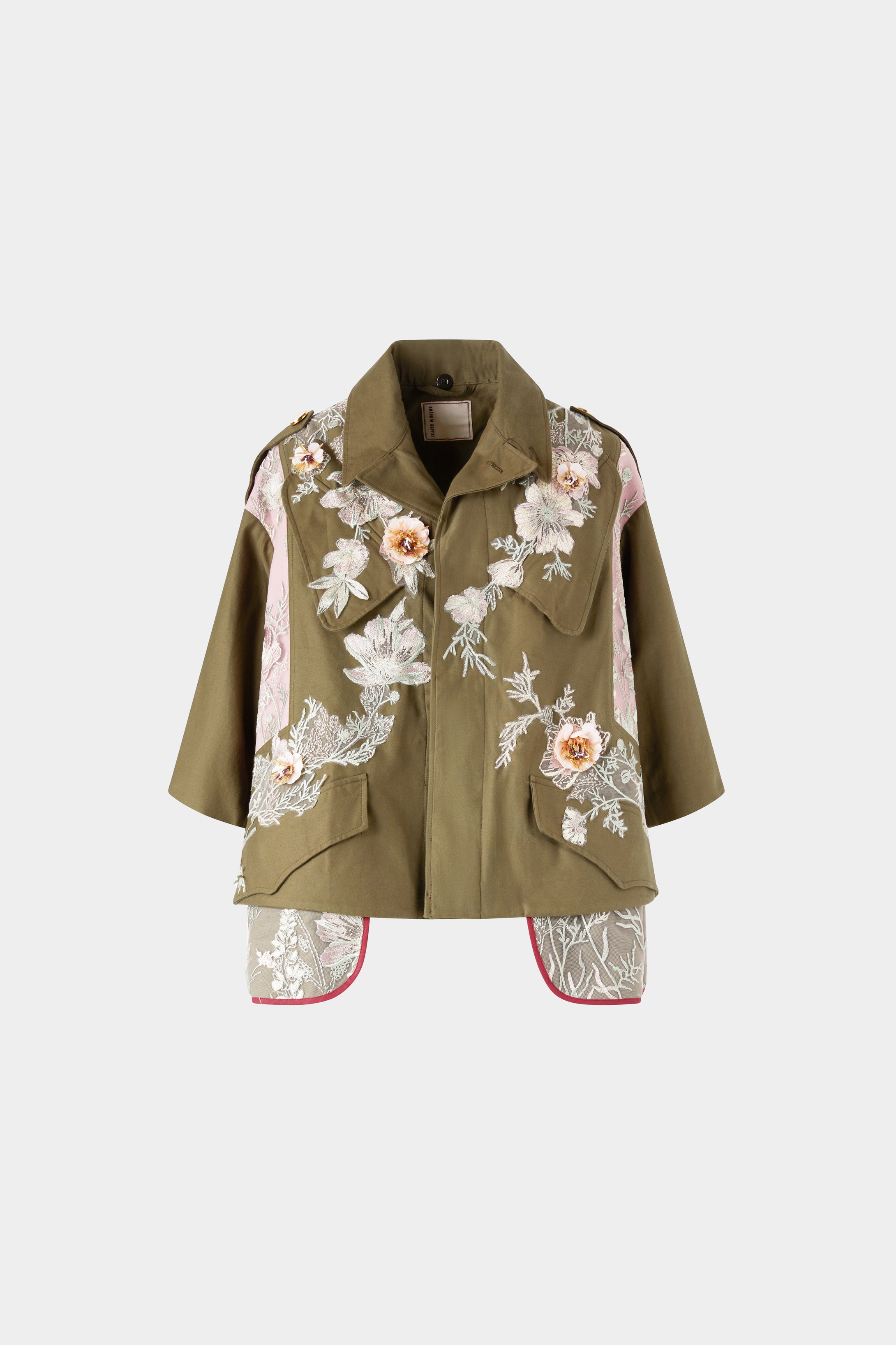 Parka corto in cotone verde oliva, adornato con ricami floreali rosa e tasche a toppa.