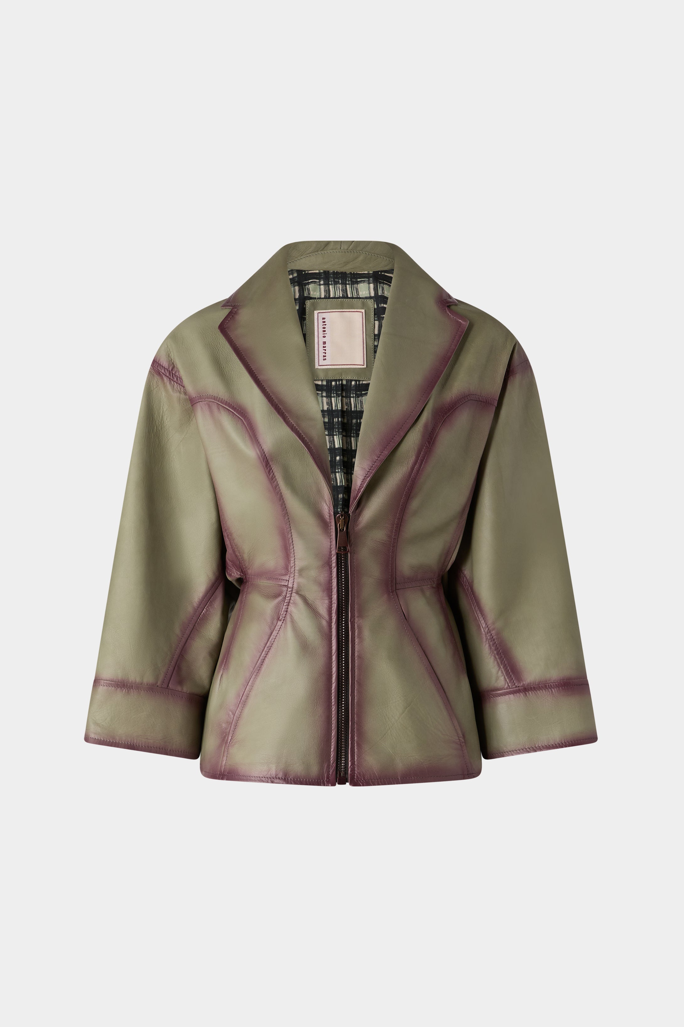 Giacca in pelle verde oliva con una silhouette strutturata, dettagli a contrasto viola, chiusura frontale con zip e maniche a tre quarti ampie per un look audace e moderno.